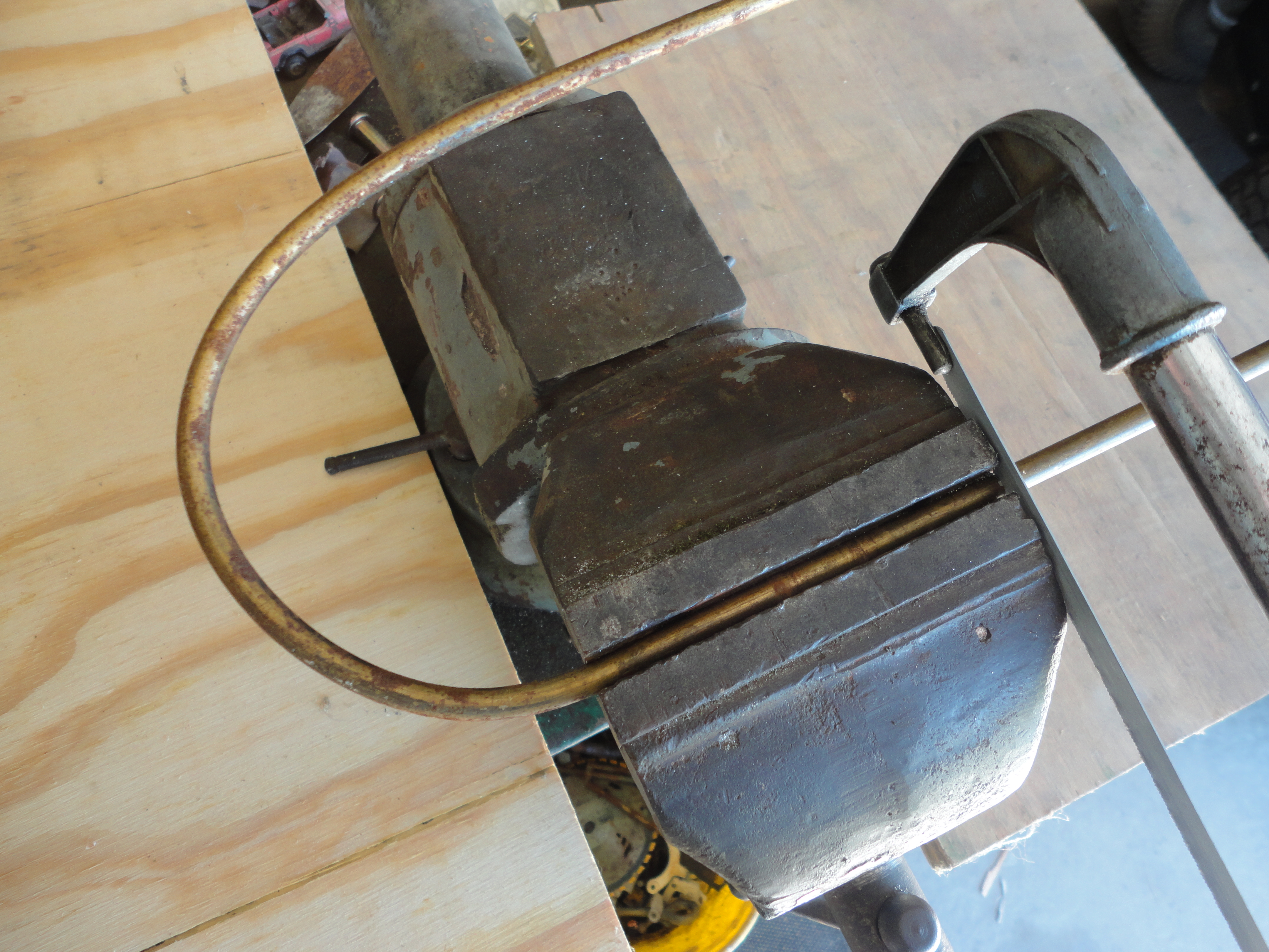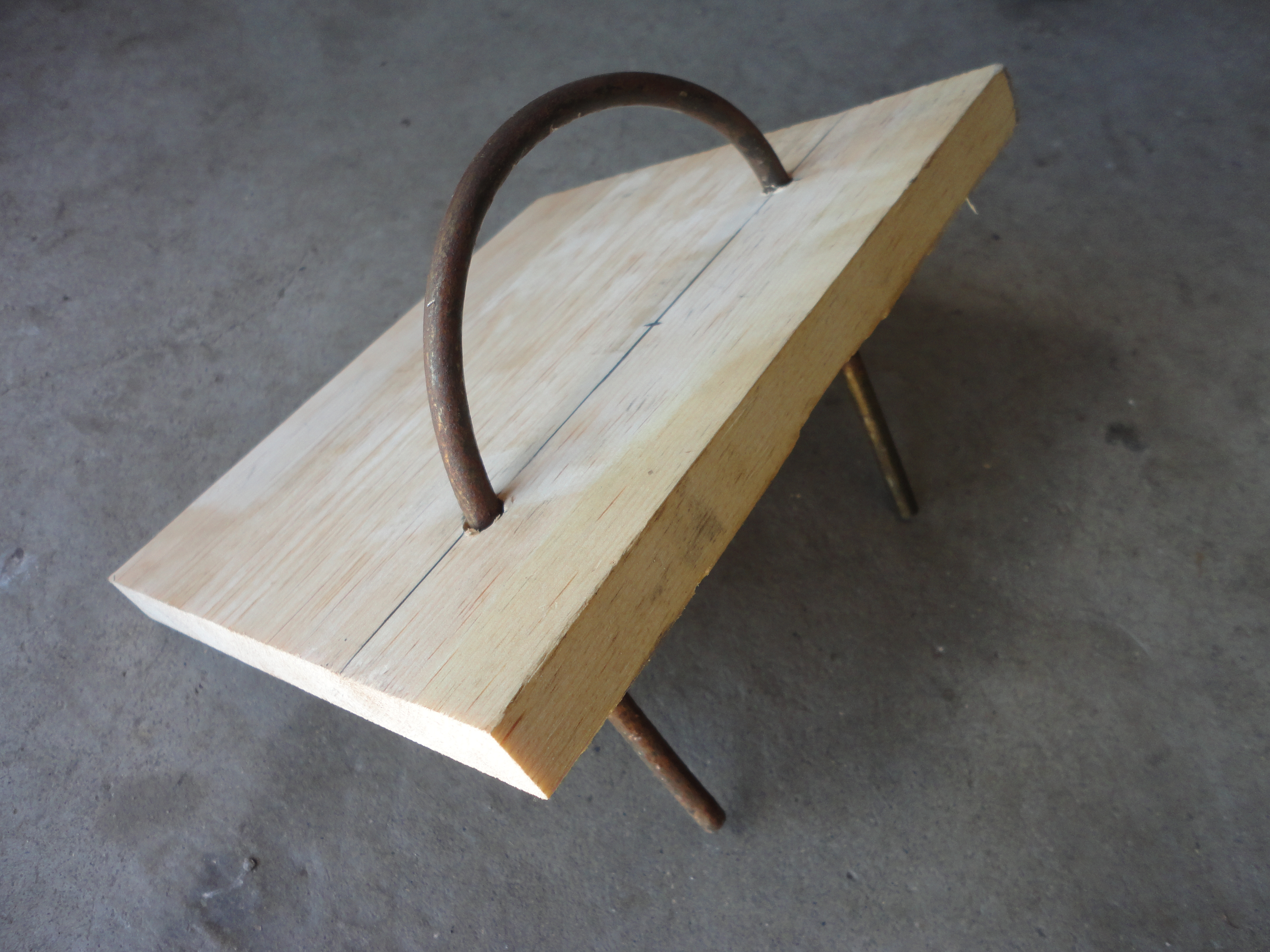 A length of 1/4″ steel rod was bent around a 5″ dia. pole, then put in a vice to trim off the ends with a hack saw. Once handle is shaped, mark the wood for placement and predrill holes. Make sure it slides in easily and fits snugly.