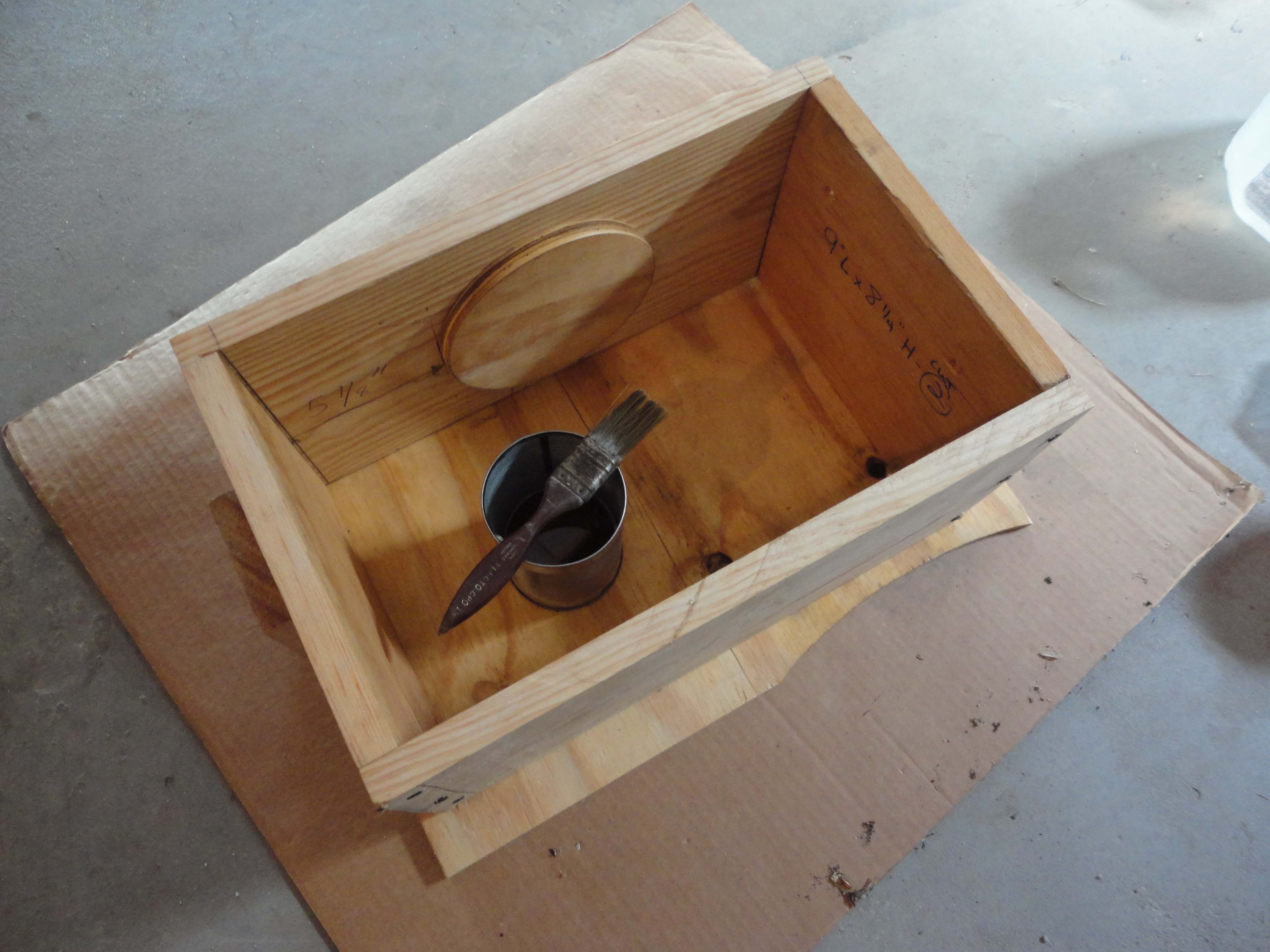 Box sides were cut from 1″x10″ pine boards, mindful that the wood grain ran horizontally on the end that the handle would be inserted in, so it can easily be split off later.
