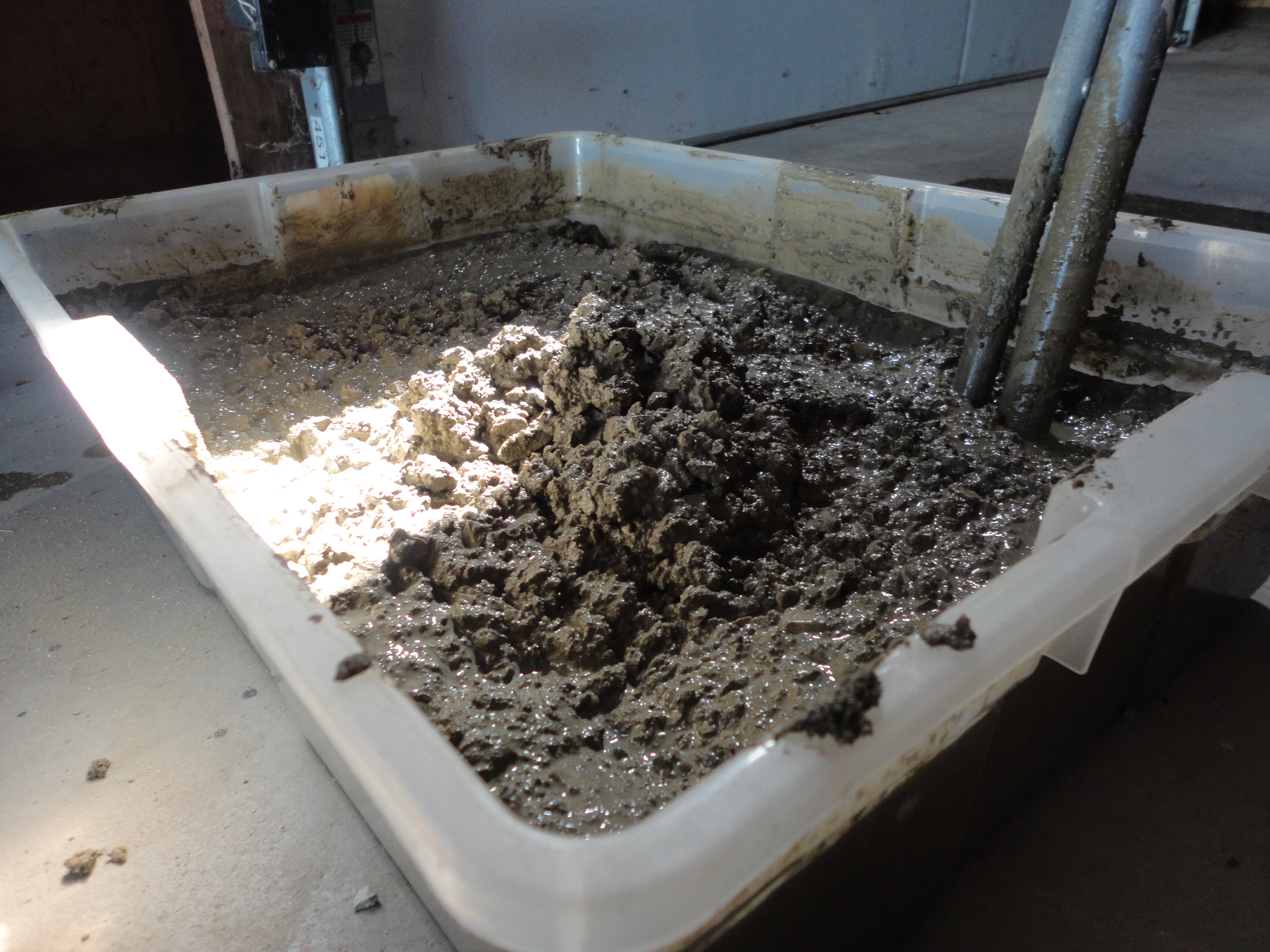 You’ll appreciate an extra pair of hands, and something sturdy to stir with, when mixing up an 80 lb. bag of Quikrete. We used about 1 1/4 gal. of water and mixed it well.
