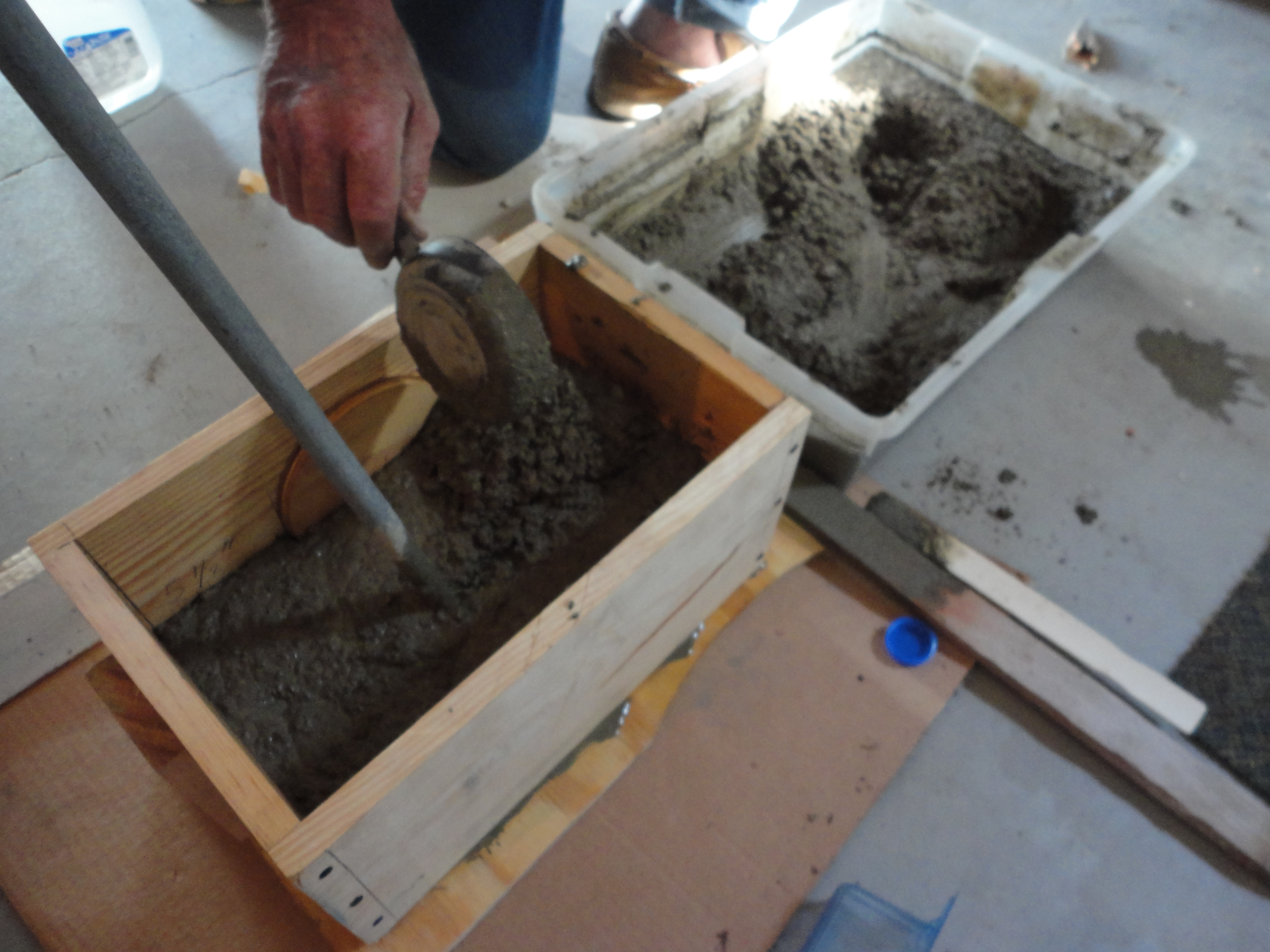 Scoop the concrete in the box. Use whatever you stirred with, or a paint stick, to tamp and work it down as you fill, especially around the outside edges, to help obtain a smooth finish on the sides when it has dried.
