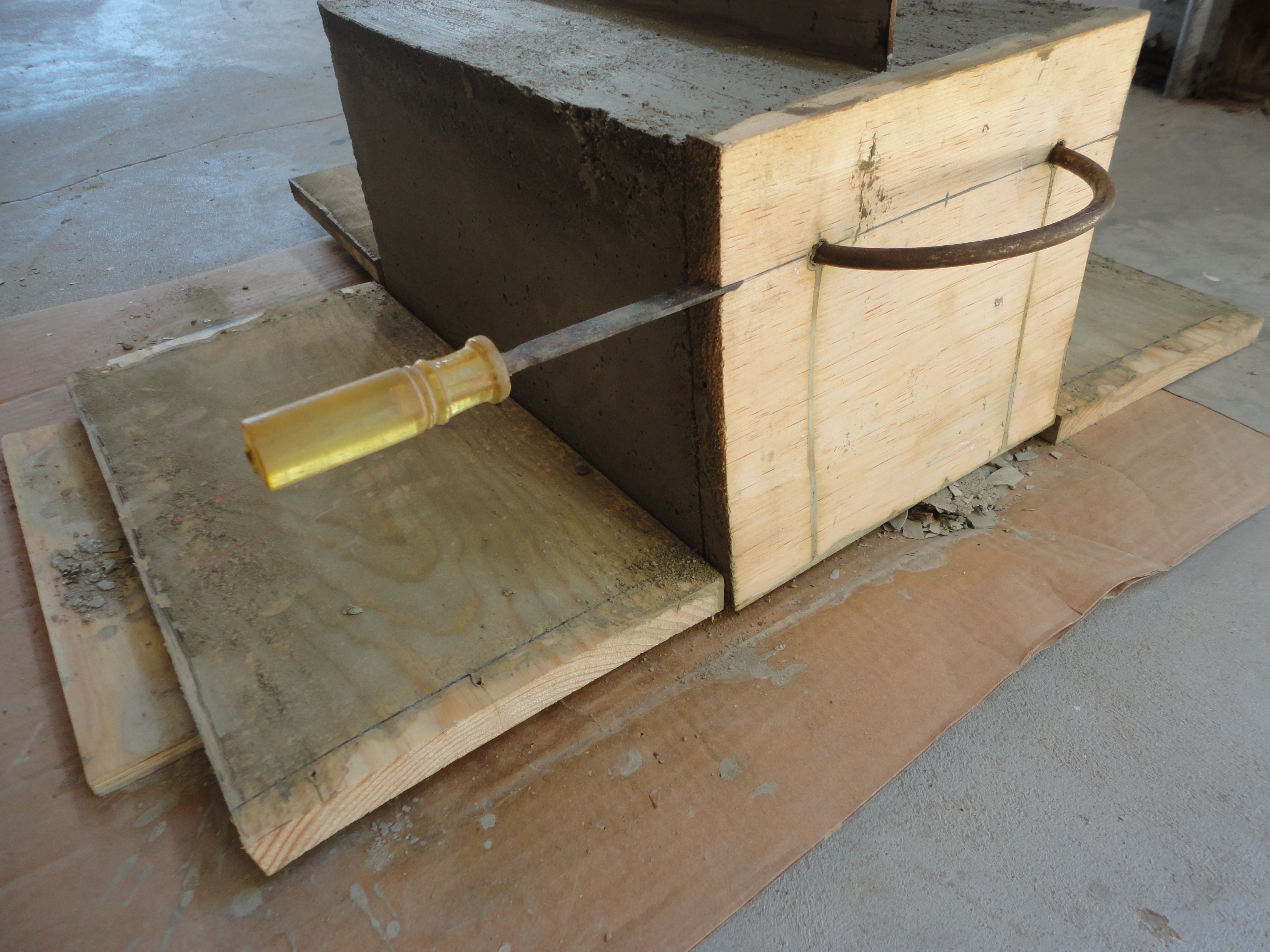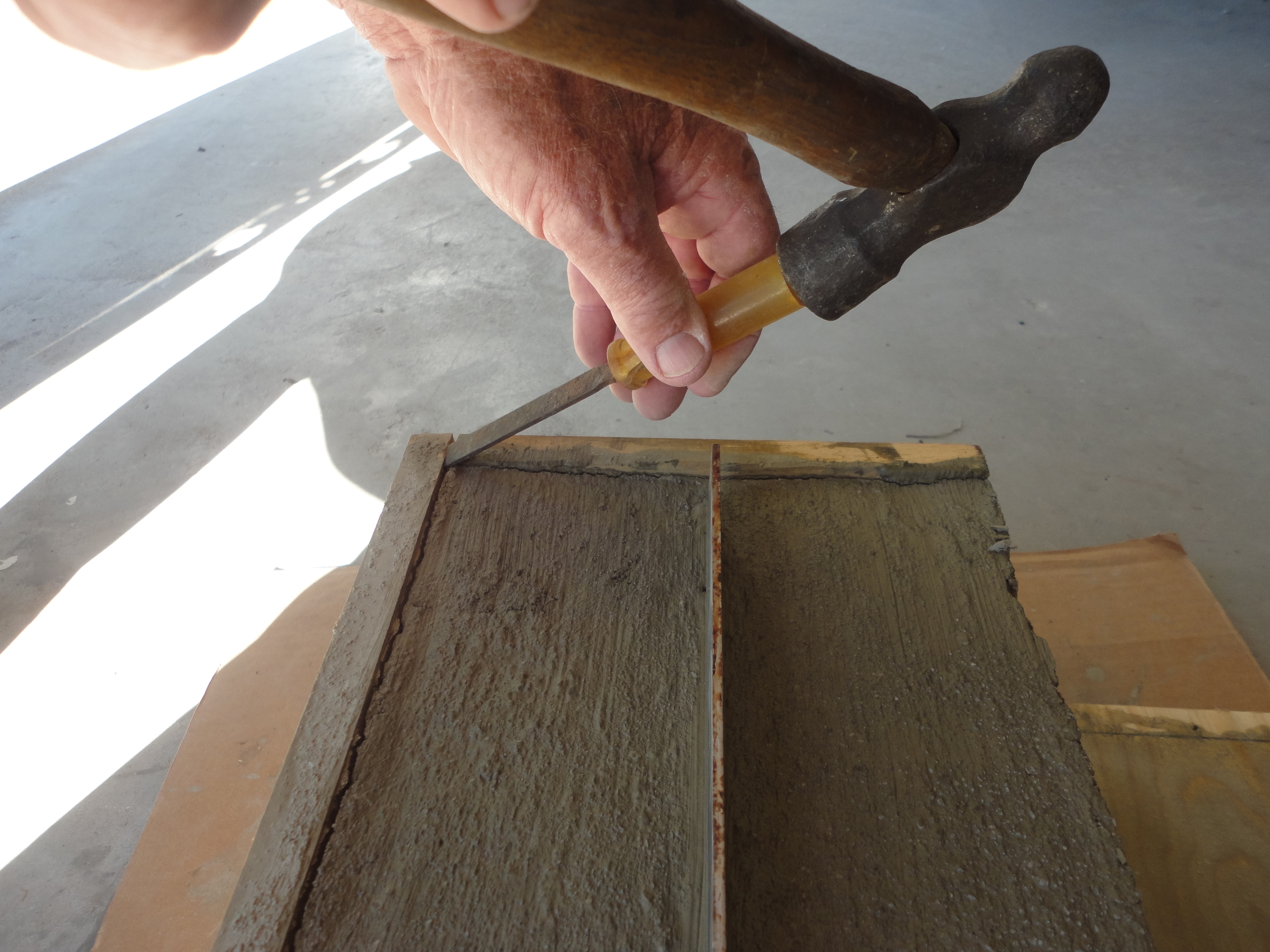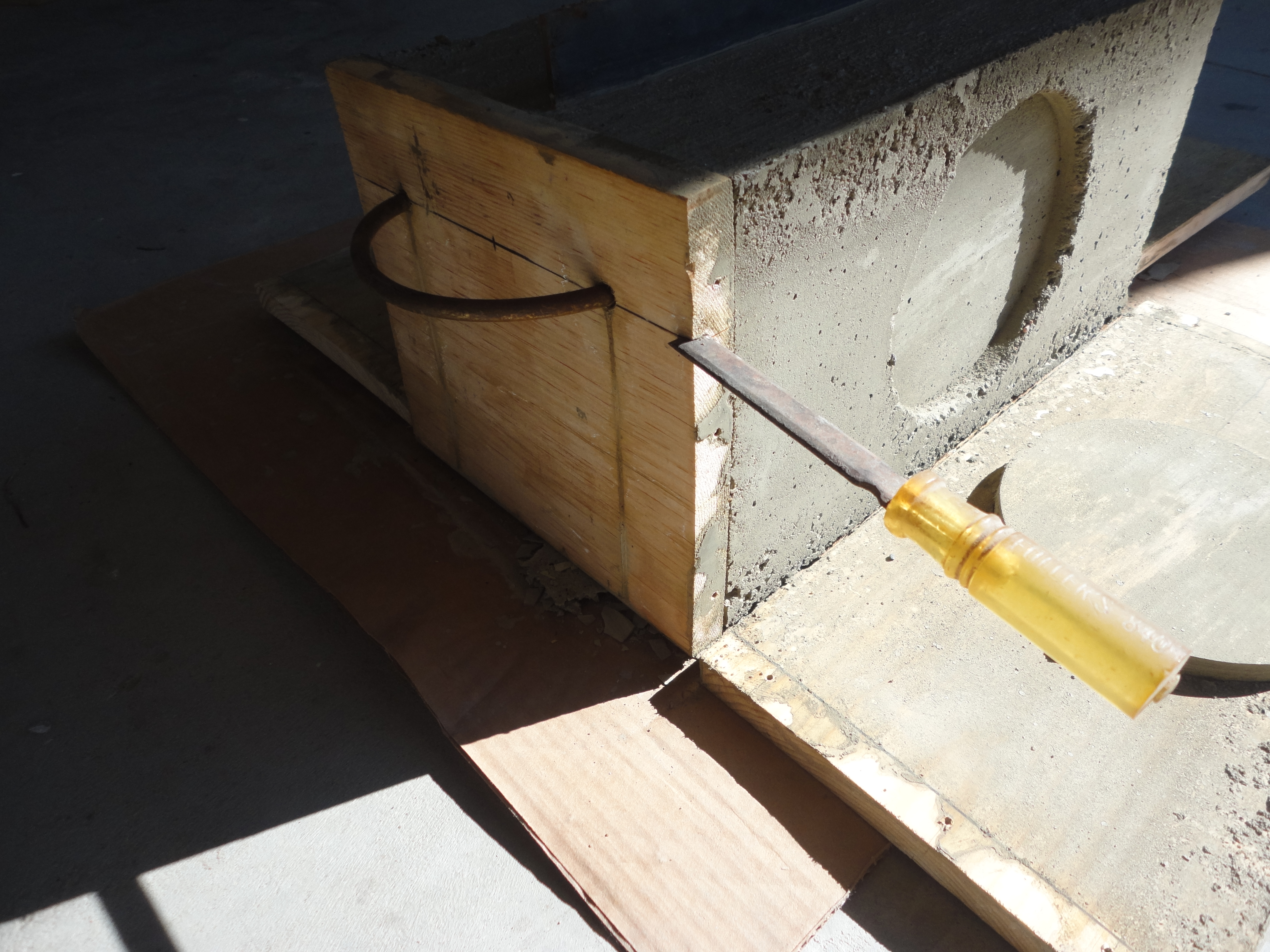 After 24 hours, tip the box and brace it while removing the bottom. Sit it back up on the plywood, sideways, to dry another 12 hours. Remove all the screws and tap sides off gently. On the handle end, tap a wood chisel gently into the wood, first from the sides, then across the middle. Repeat until it splits easily; remove. Lightly sand top outside edge of concrete.