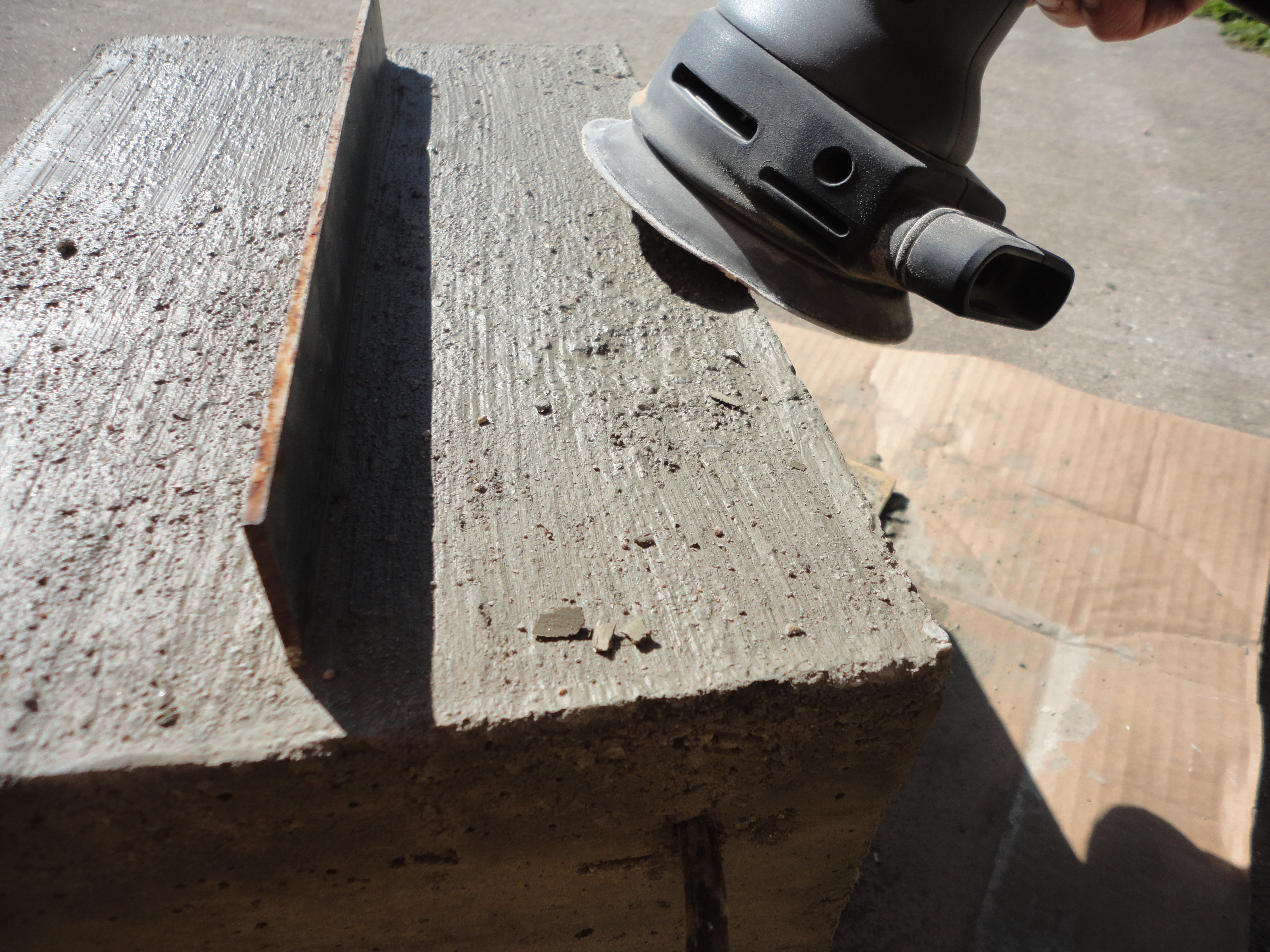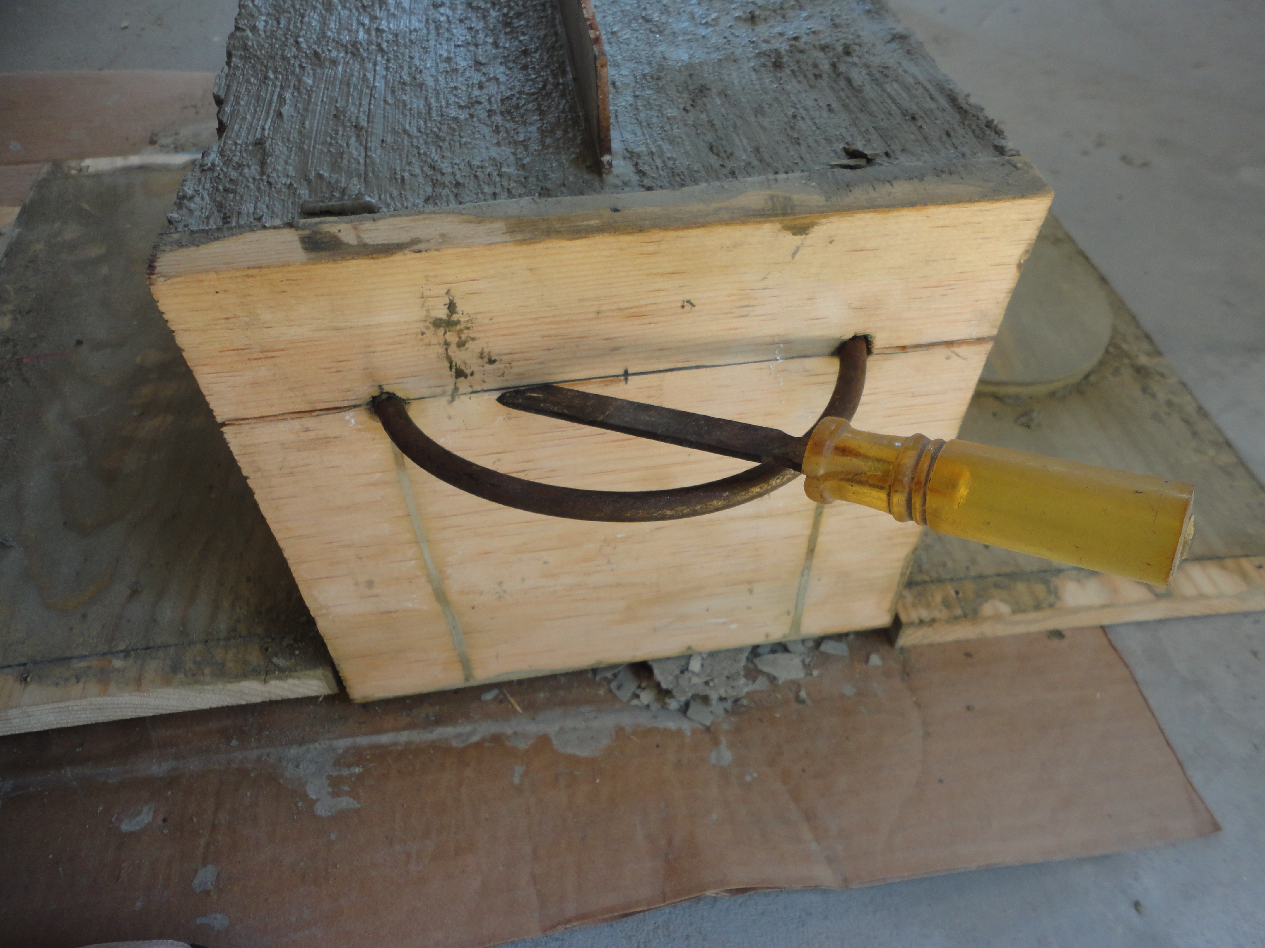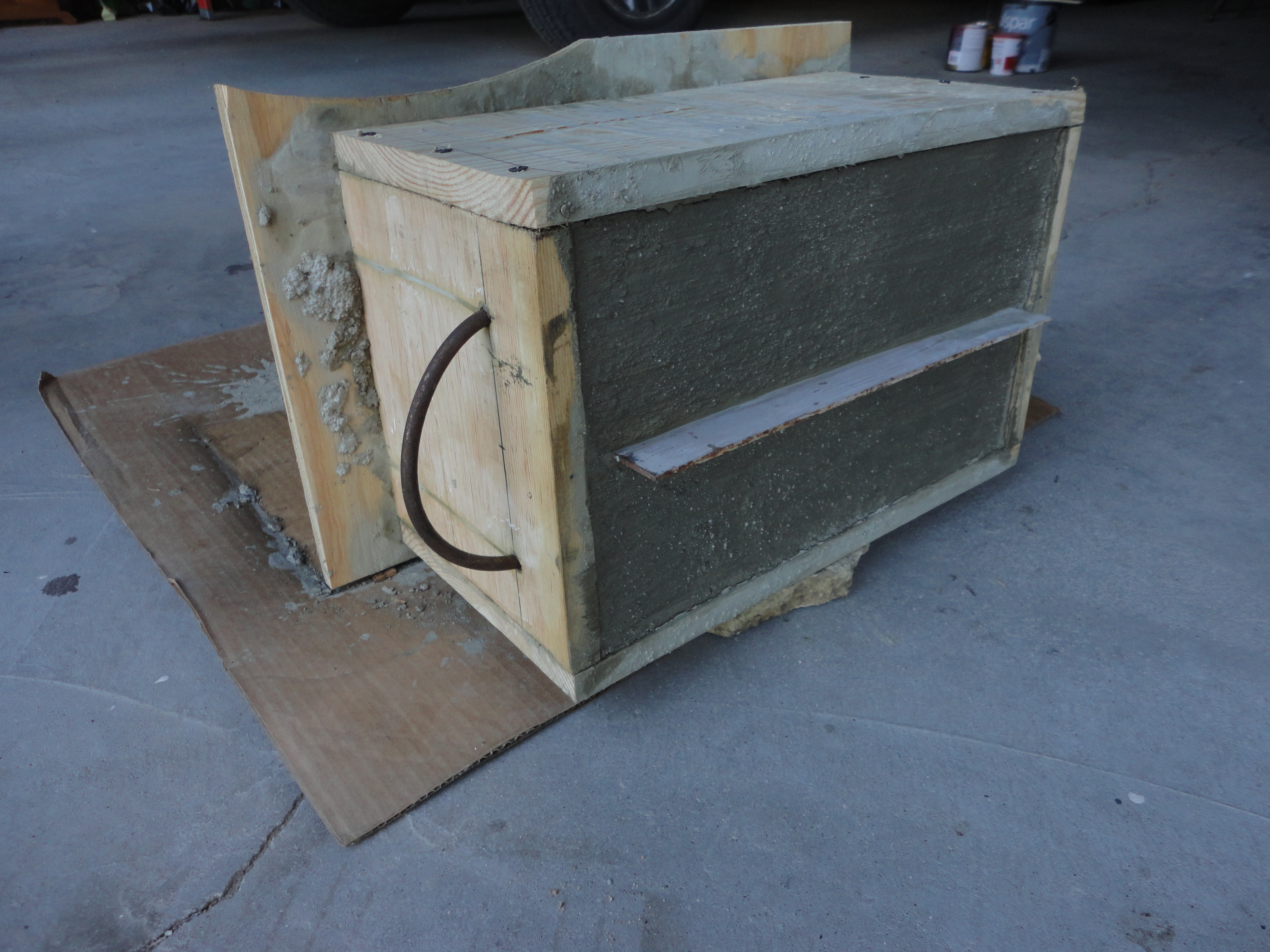 After 24 hours, tip the box and brace it while removing the bottom. Sit it back up on the plywood, sideways, to dry another 12 hours. Remove all the screws and tap sides off gently. On the handle end, tap a wood chisel gently into the wood, first from the sides, then across the middle. Repeat until it splits easily; remove. Lightly sand top outside edge of concrete.