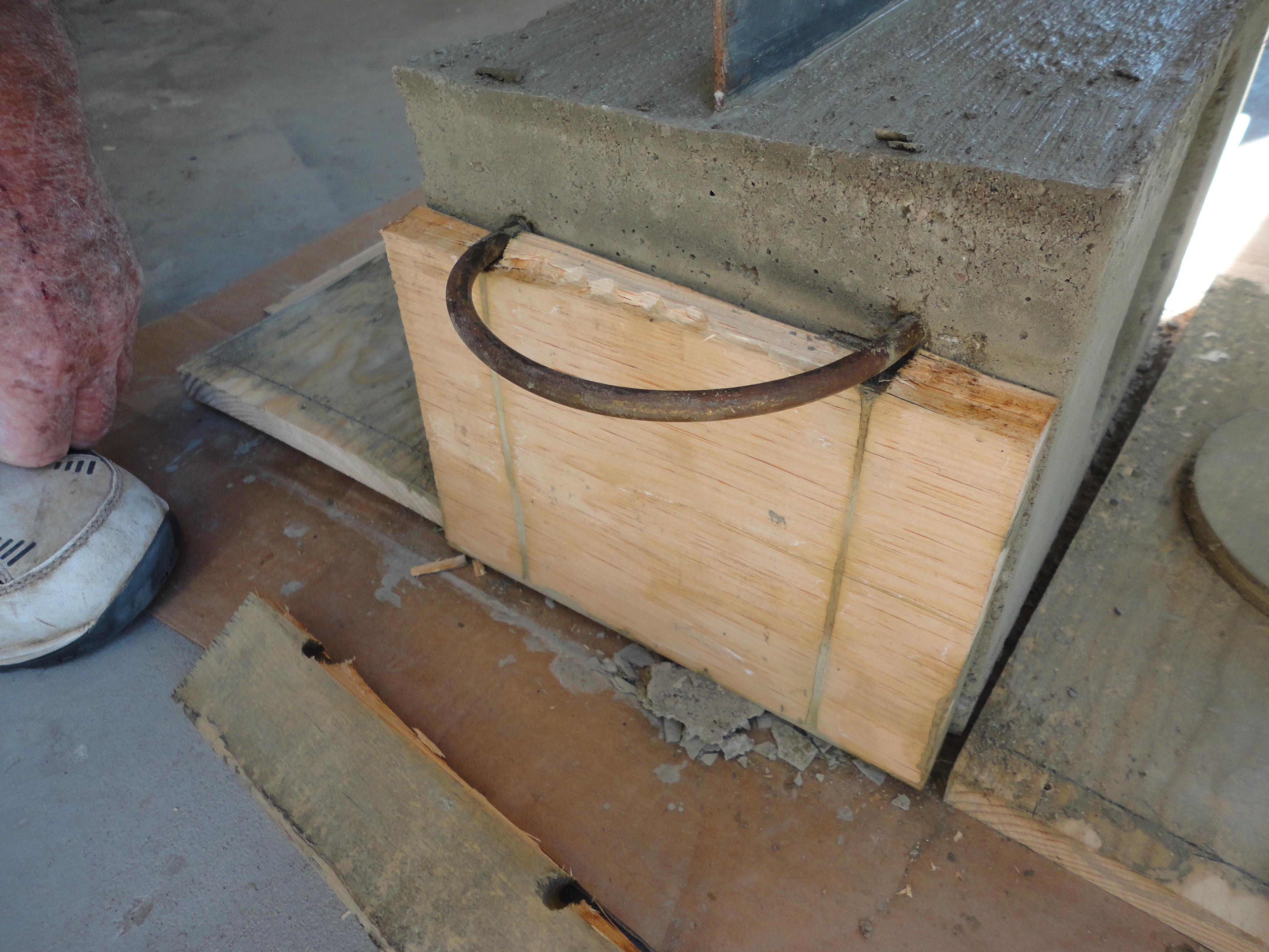 Wait about 20 minutes, level top again with paint stick, and slowly push in the piece of steel, upright. Let it sit approximately another 30 minutes, then brush the top lightly with a 2″ chip brush. Times will vary depending on how wet the concrete is.