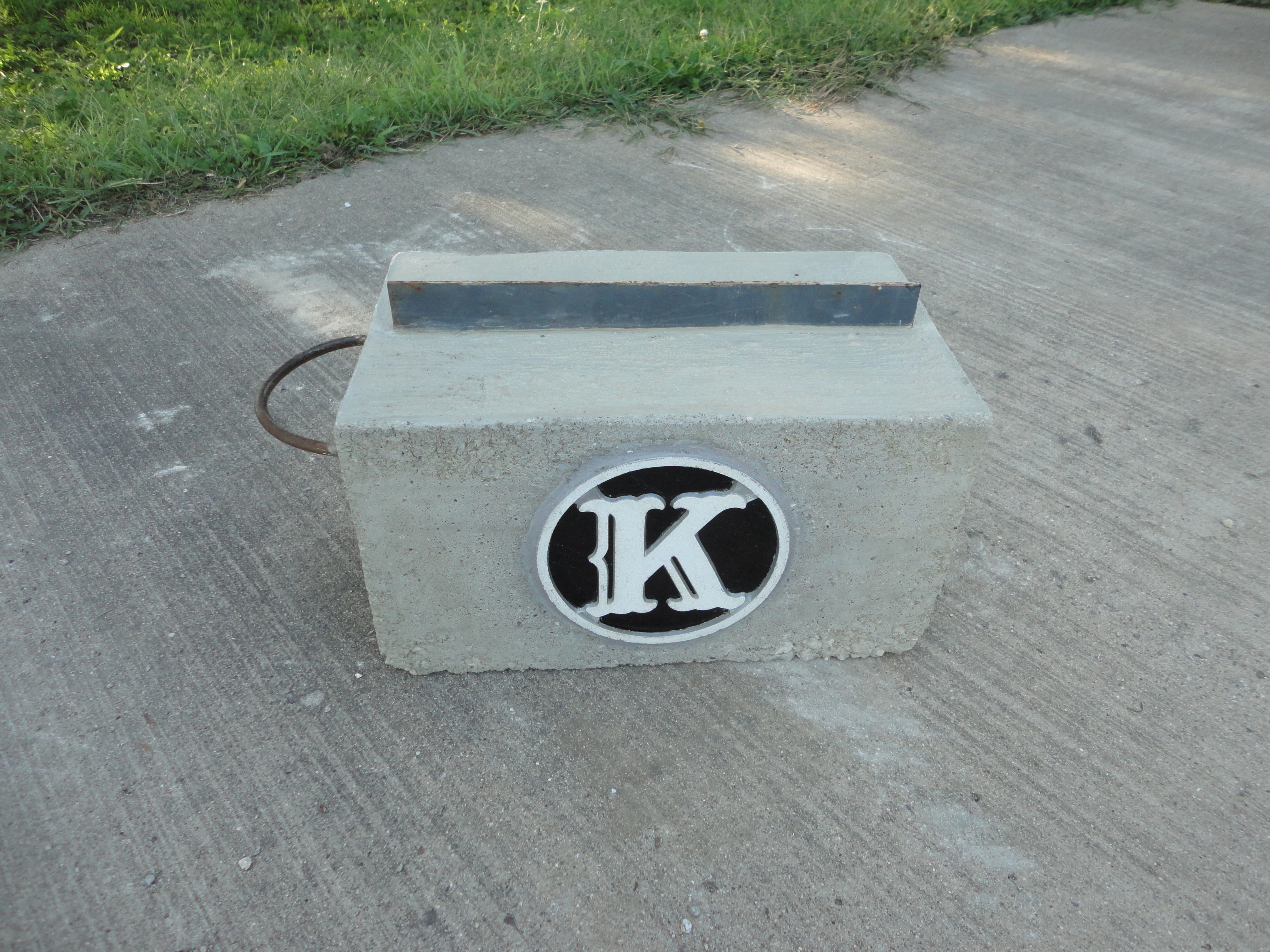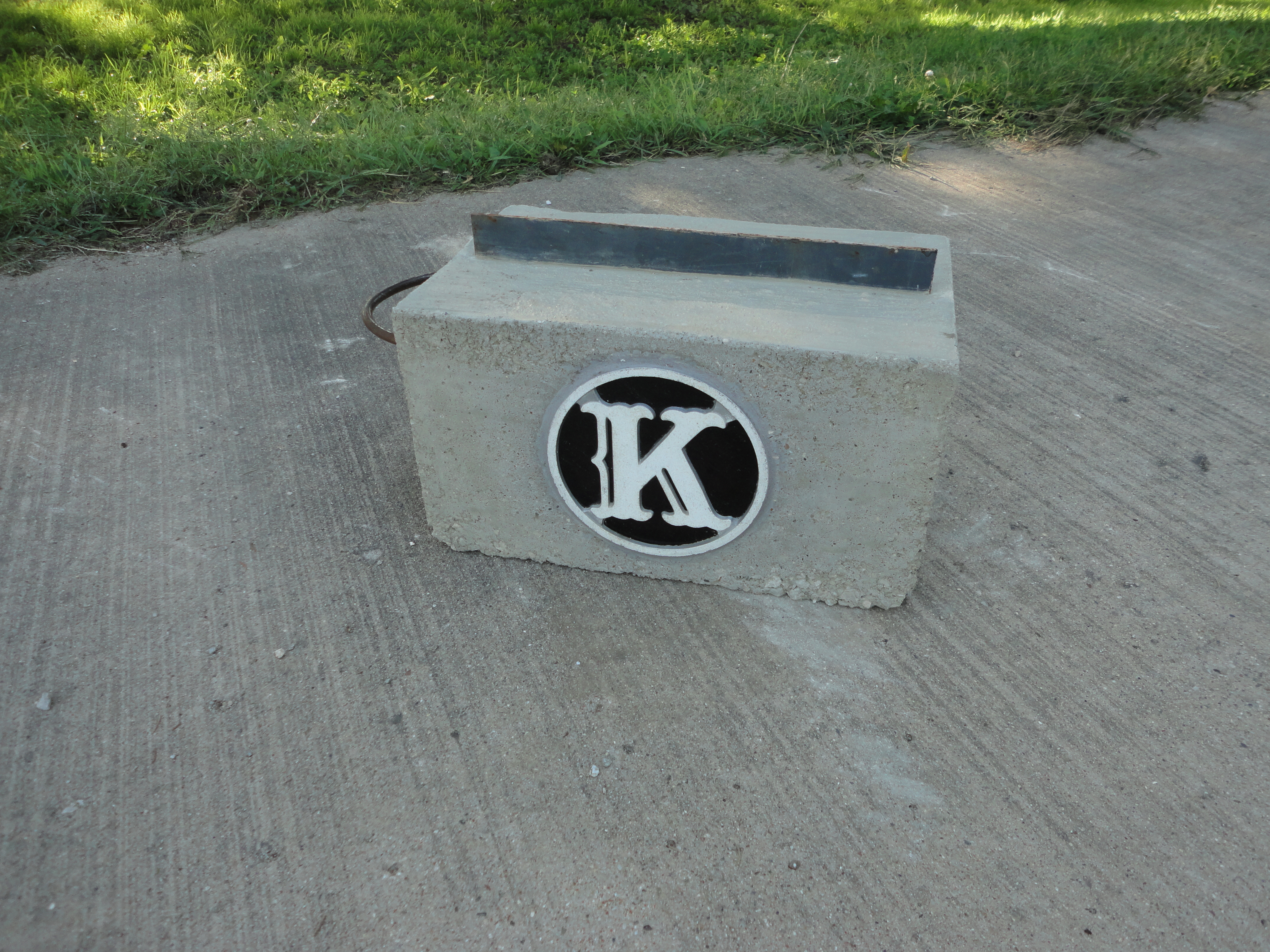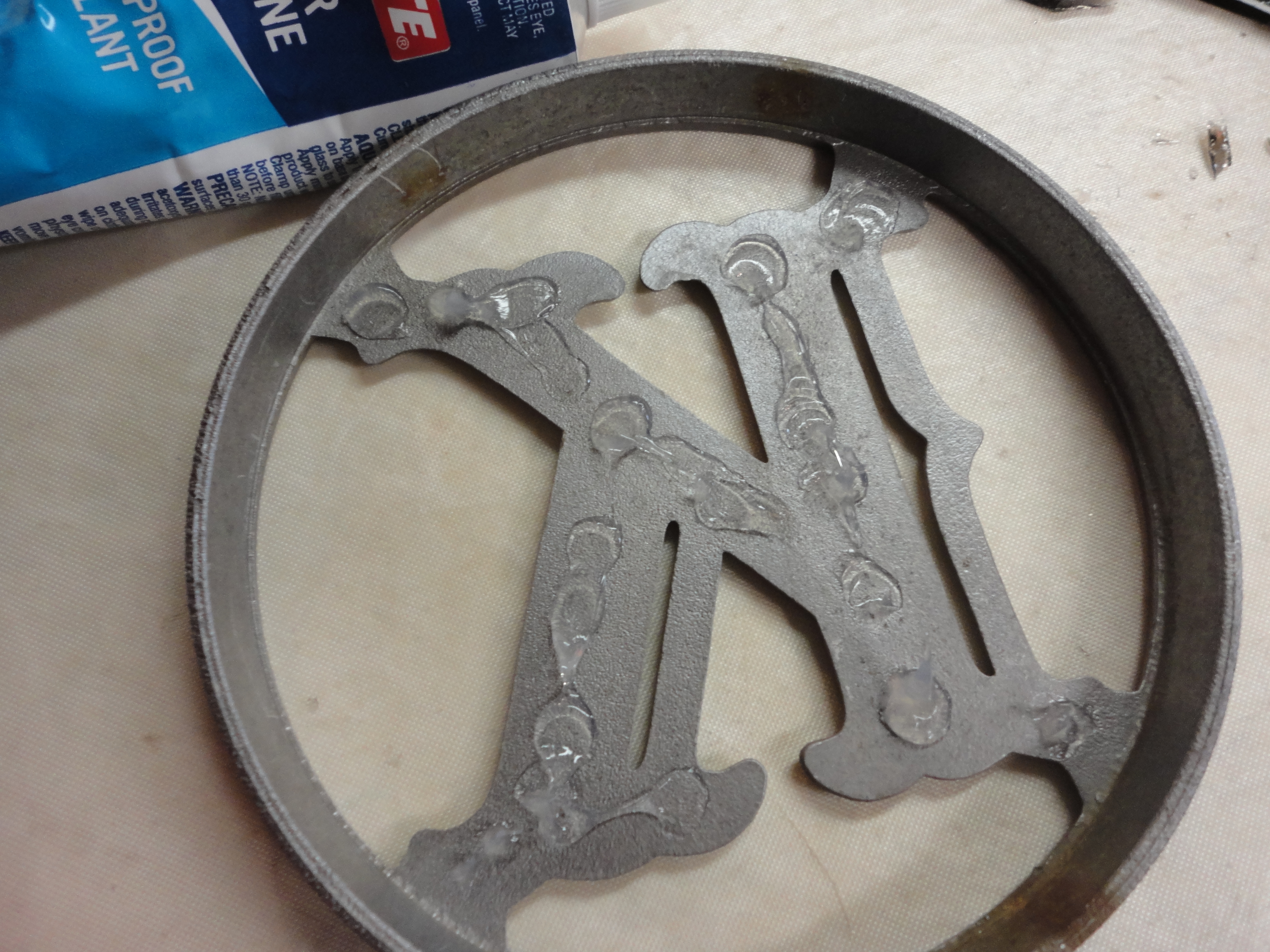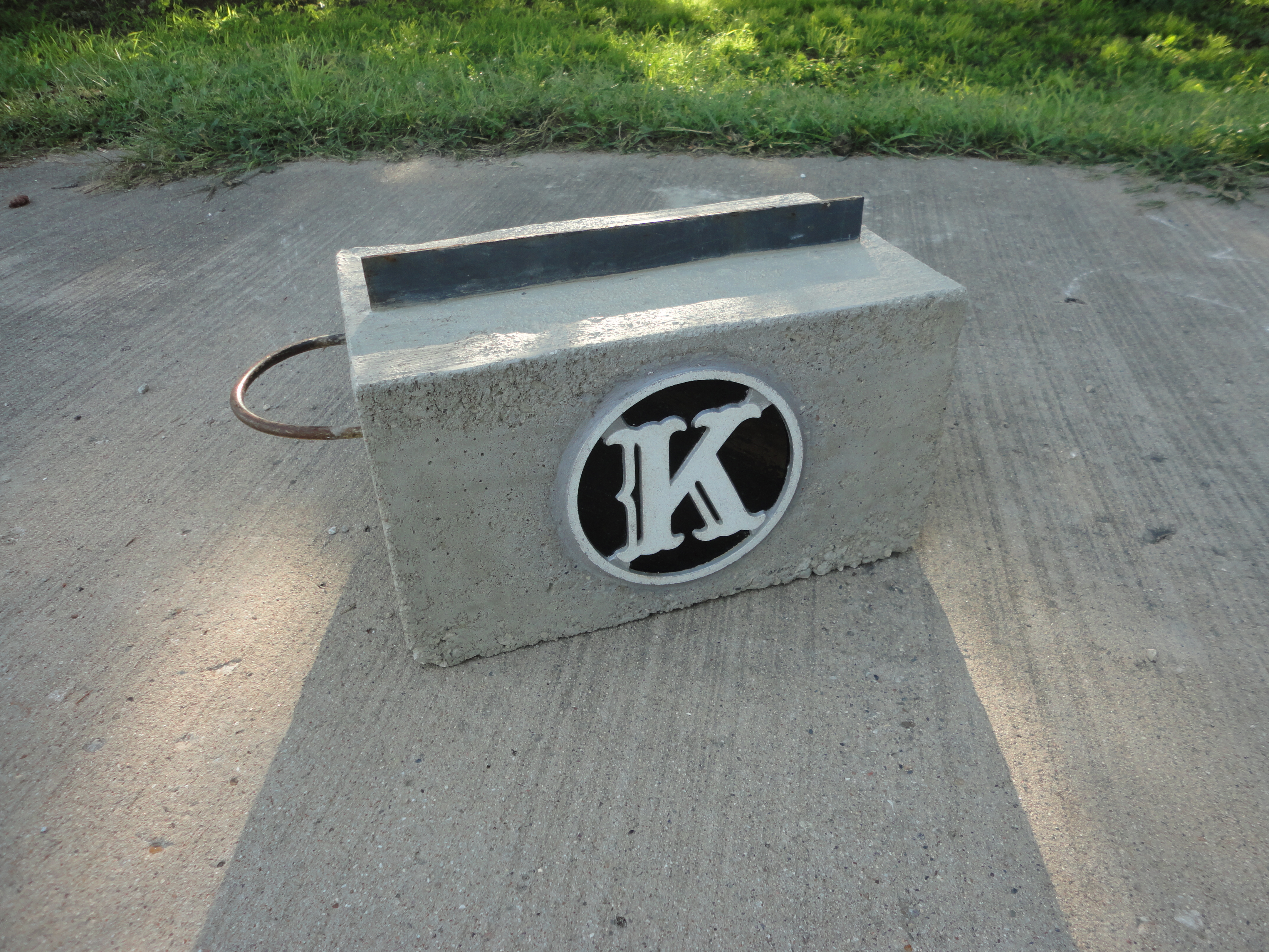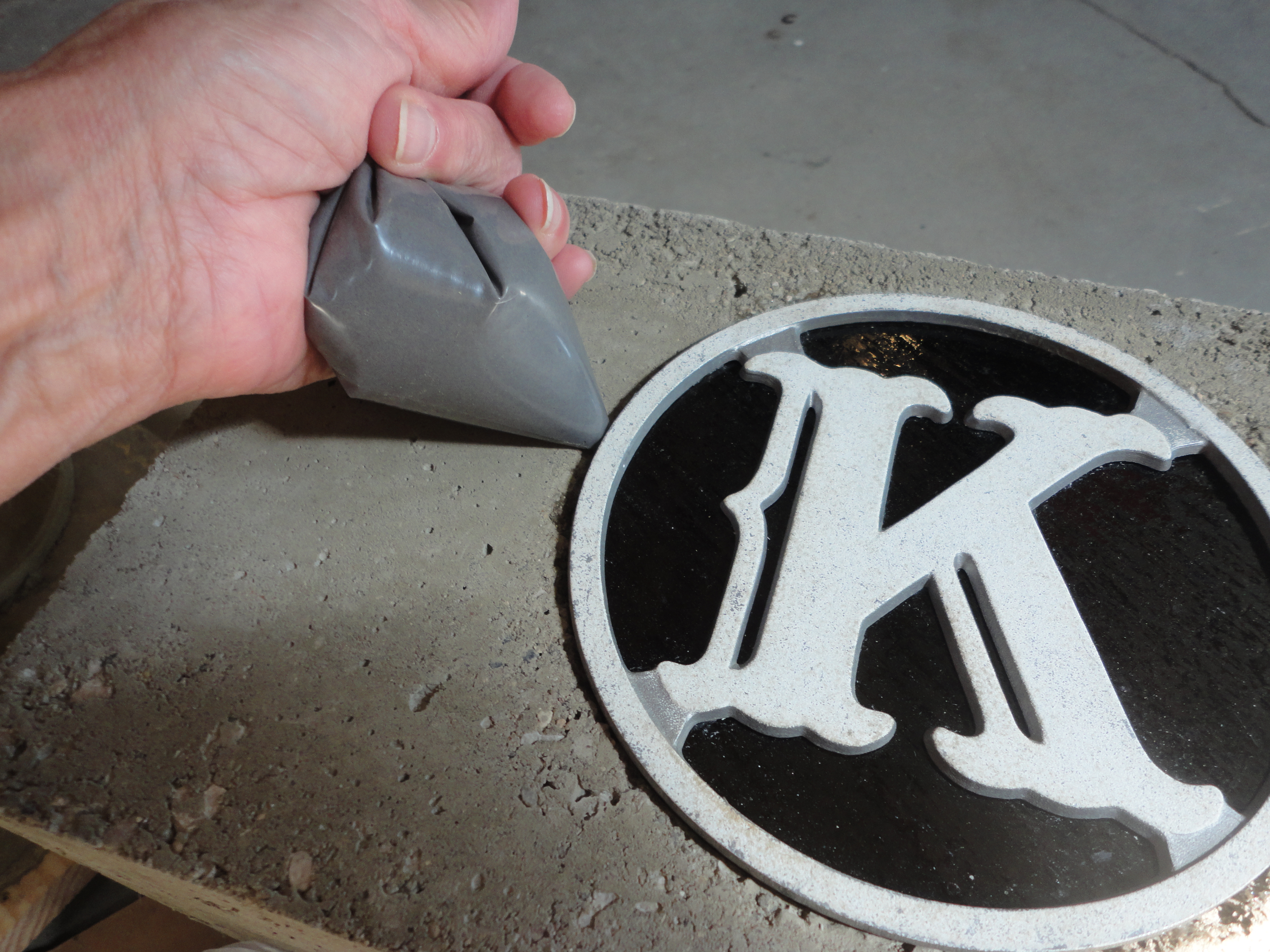 Trace your circle pattern on your choice of glass. Cut and grind to fit inside the aluminum circle. Dab silicone glue on the backside of the “K”, insert glass, and weigh down to dry. Run a thin bead of silicone around the backside edge of the glass. I also glued on two 3/8″ resin beads to help brace the glass against the concrete. Let dry.