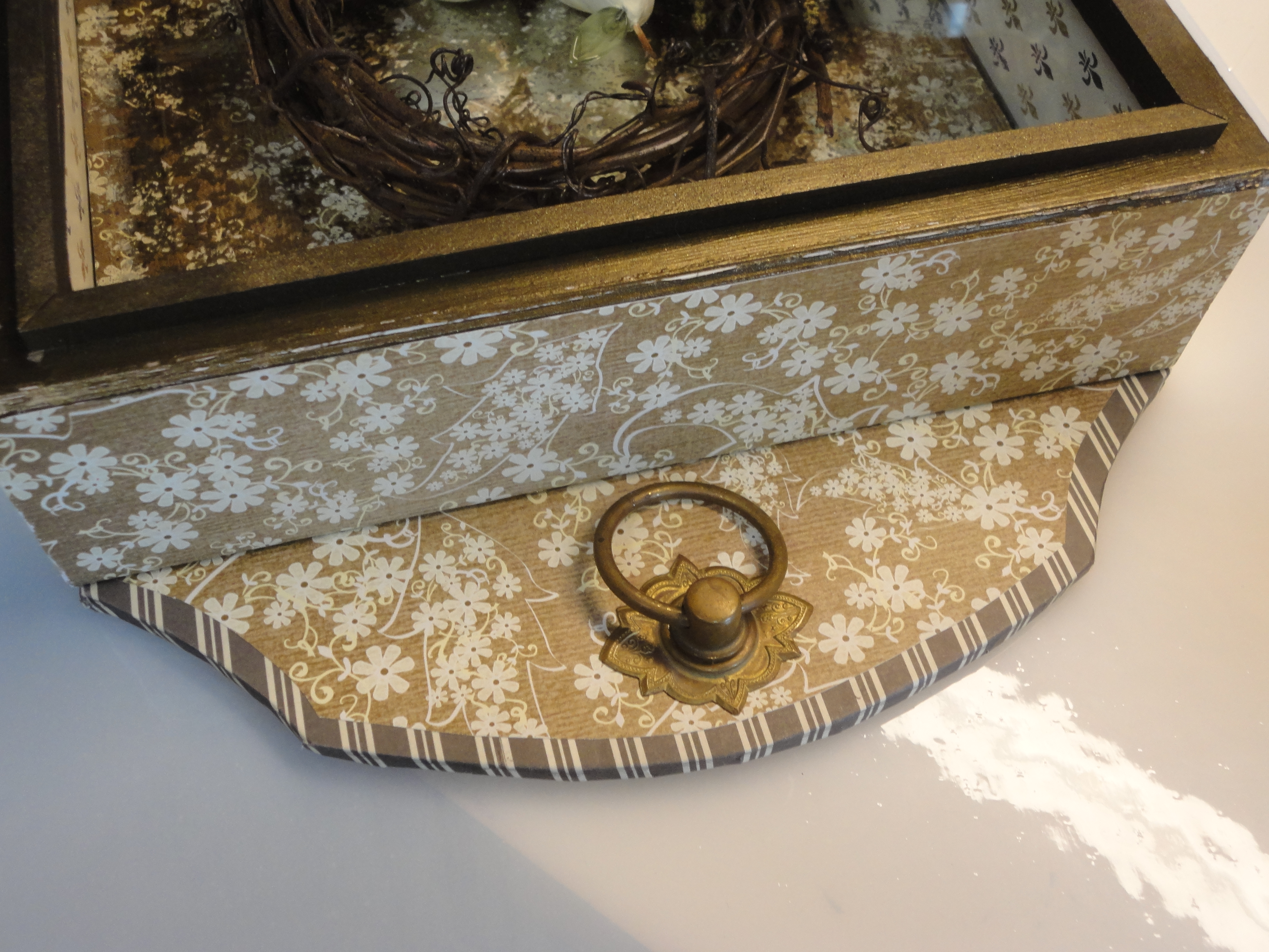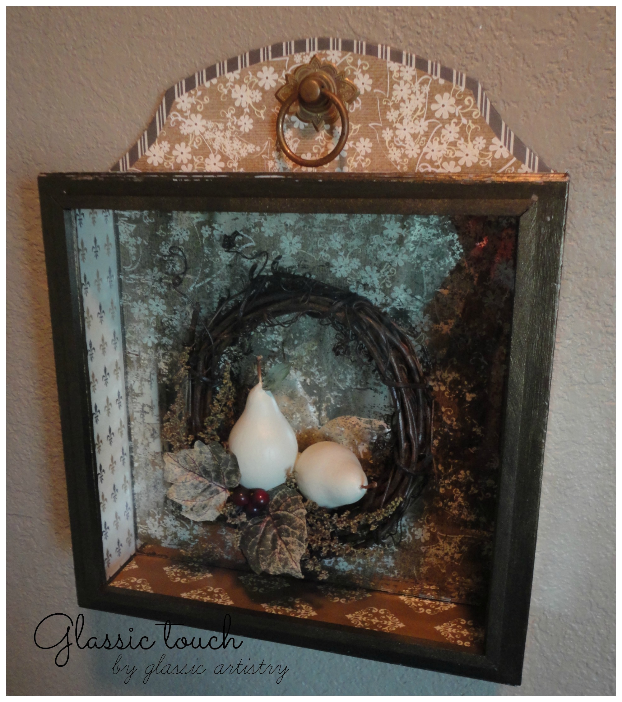 This project actually began last November when I was looking for a storage box for the pear gourd wreath shown in my October 2015 blog post. The dried flowers were pretty fragile and I was a little leary about packing it away. That’s when I thought of a shadow box. Why not frame it as wall art?  I could make a box .. something eclectic… maybe a combination of scrapbook paper and aged mirror.