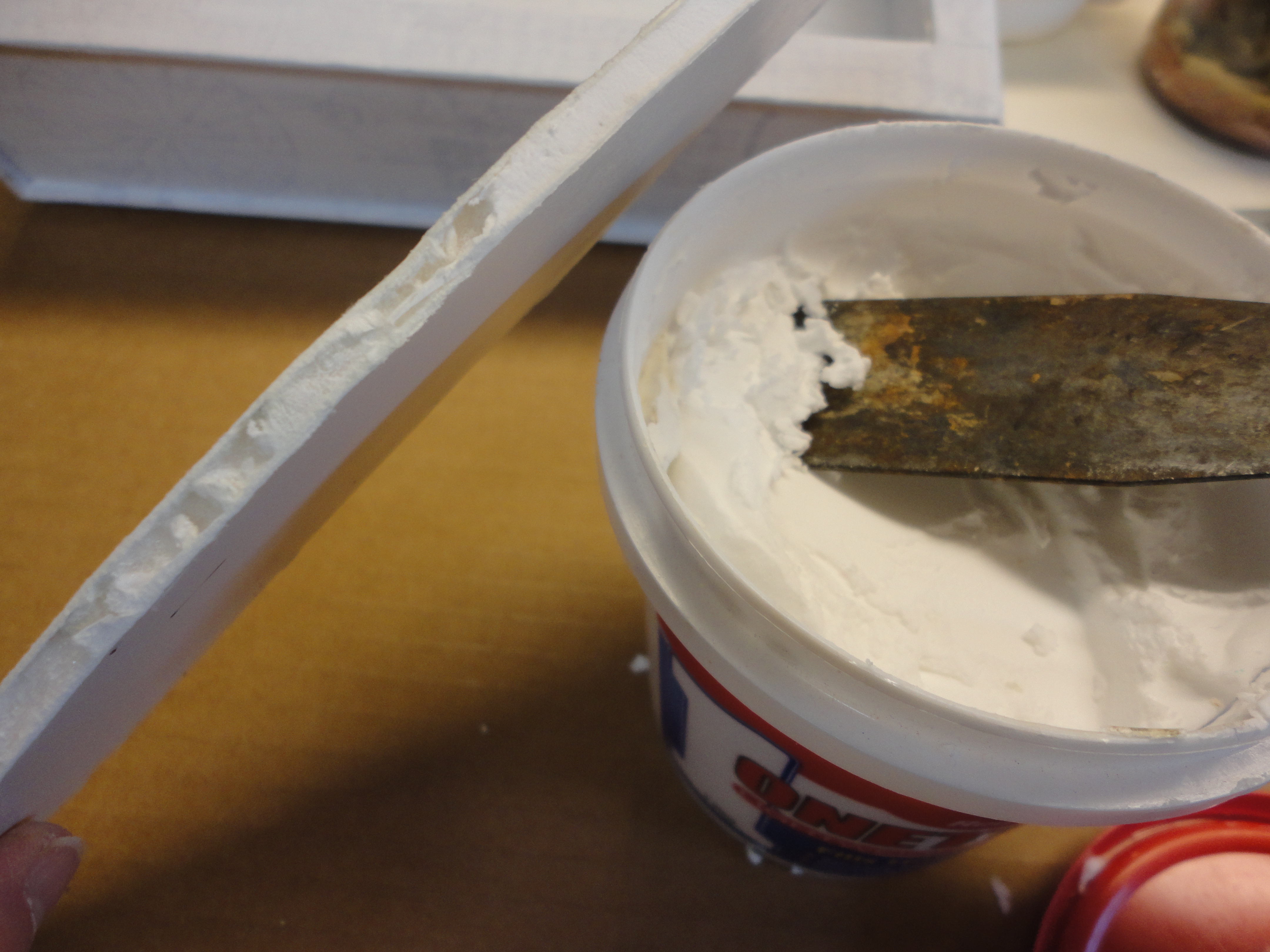 The frame pieces were held in place with painter’s tape. I removed them, one at a time, brushed on thinned glue, and clamped them down to dry. They shifted easily, so I waited until one was secure before moving to the next. You may have to touch up a little paint where you used painter’s tape.