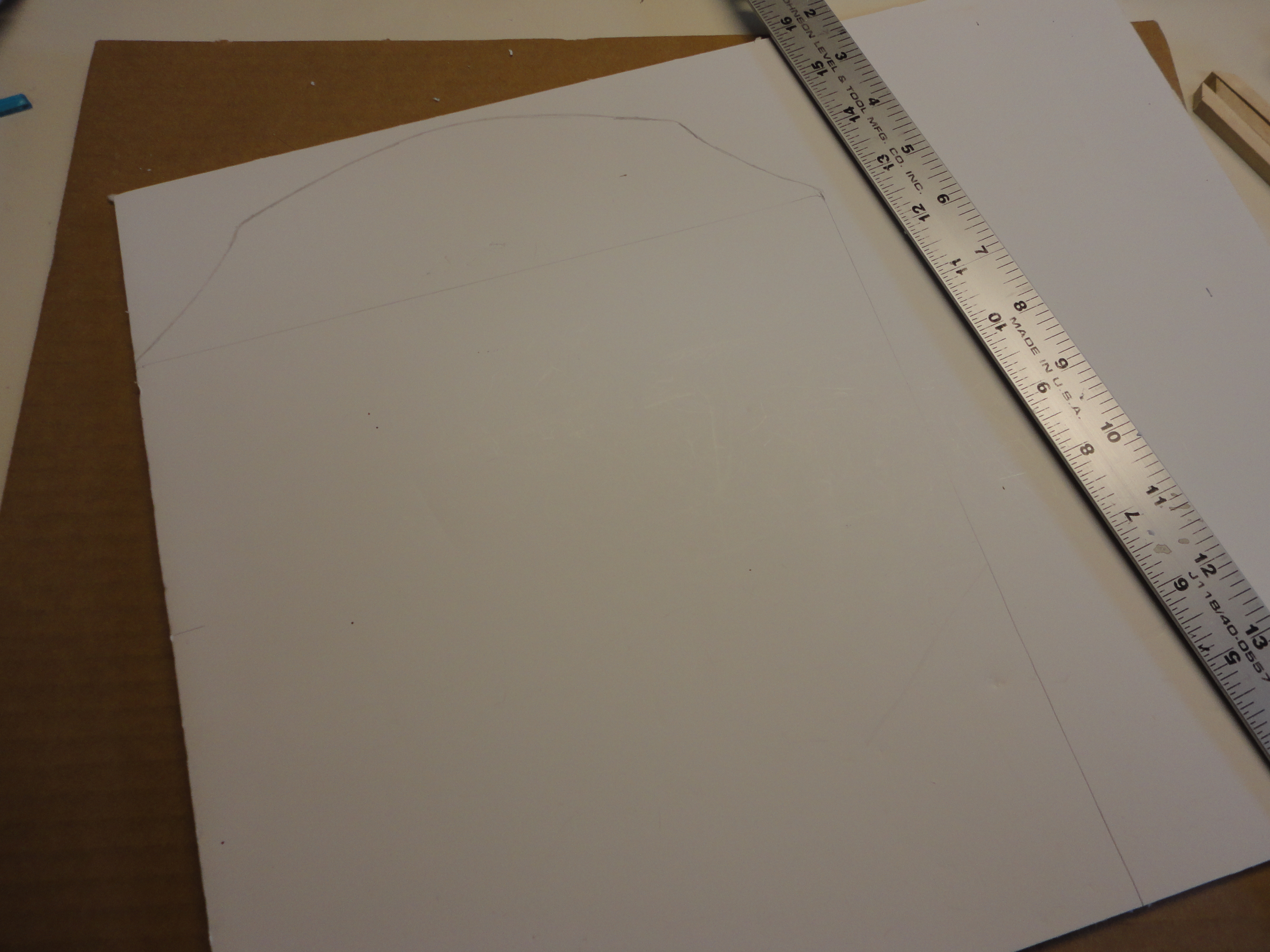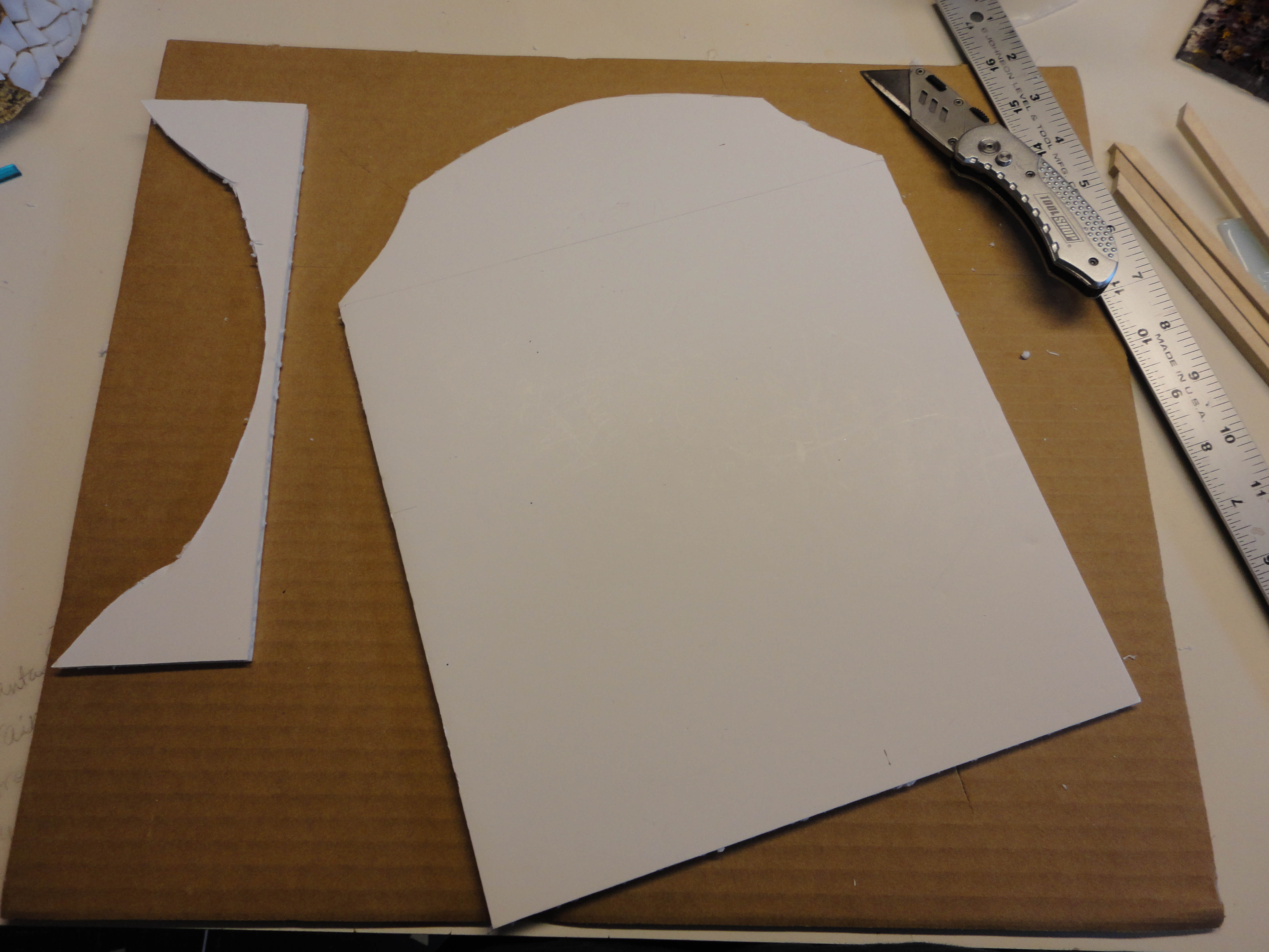 Trace the box on a piece of foam core board, and draw an arch at the top. Lie flat, on padding or cardboard, and cut out with a utility knife. Fill in rough edges of foam board with lightweight spackling. When dry, sand lightly to smooth. Seal board with gesso. Let dry well.