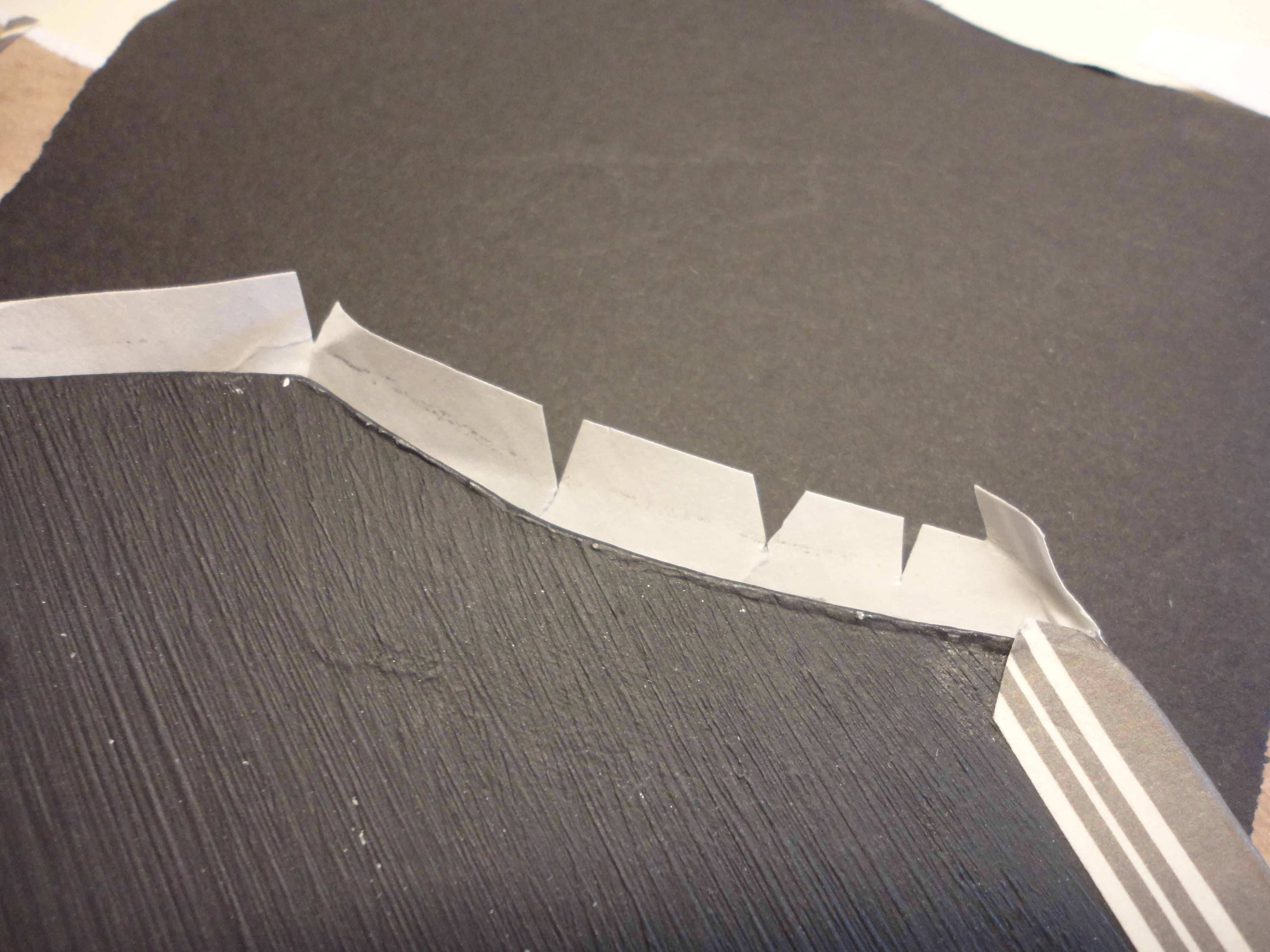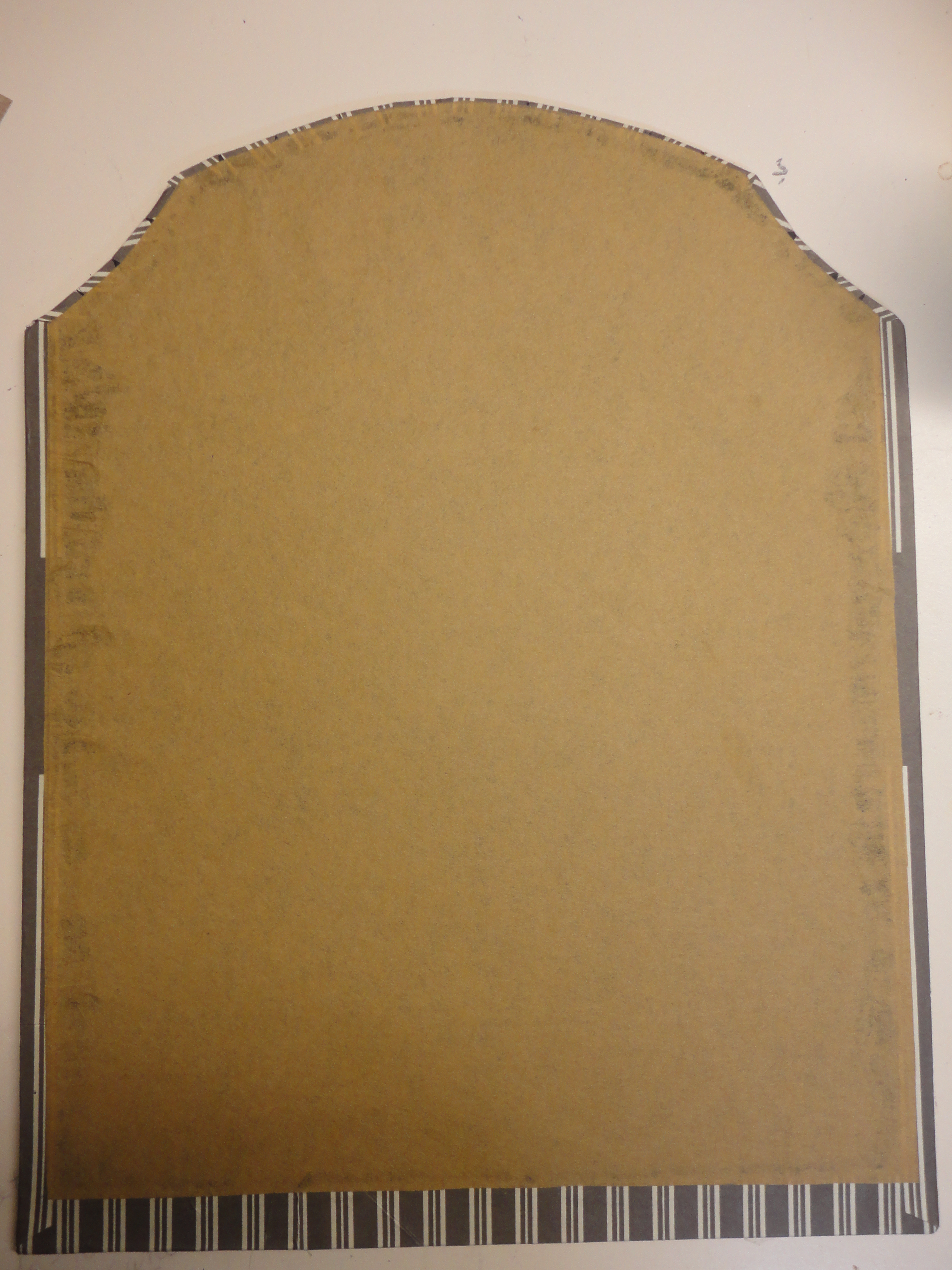 Use a fid, or paper folding tool, to wrap paper tightly around edges before gluing. Trim away excess paper for neat corners, and cut some darts around the arch. Glue and weigh down to dry. Glue may seep at edges, as a precaution lay a sheet of wax paper over the glued area before weighing down. A piece of light weight brown paper was added for a finished look.