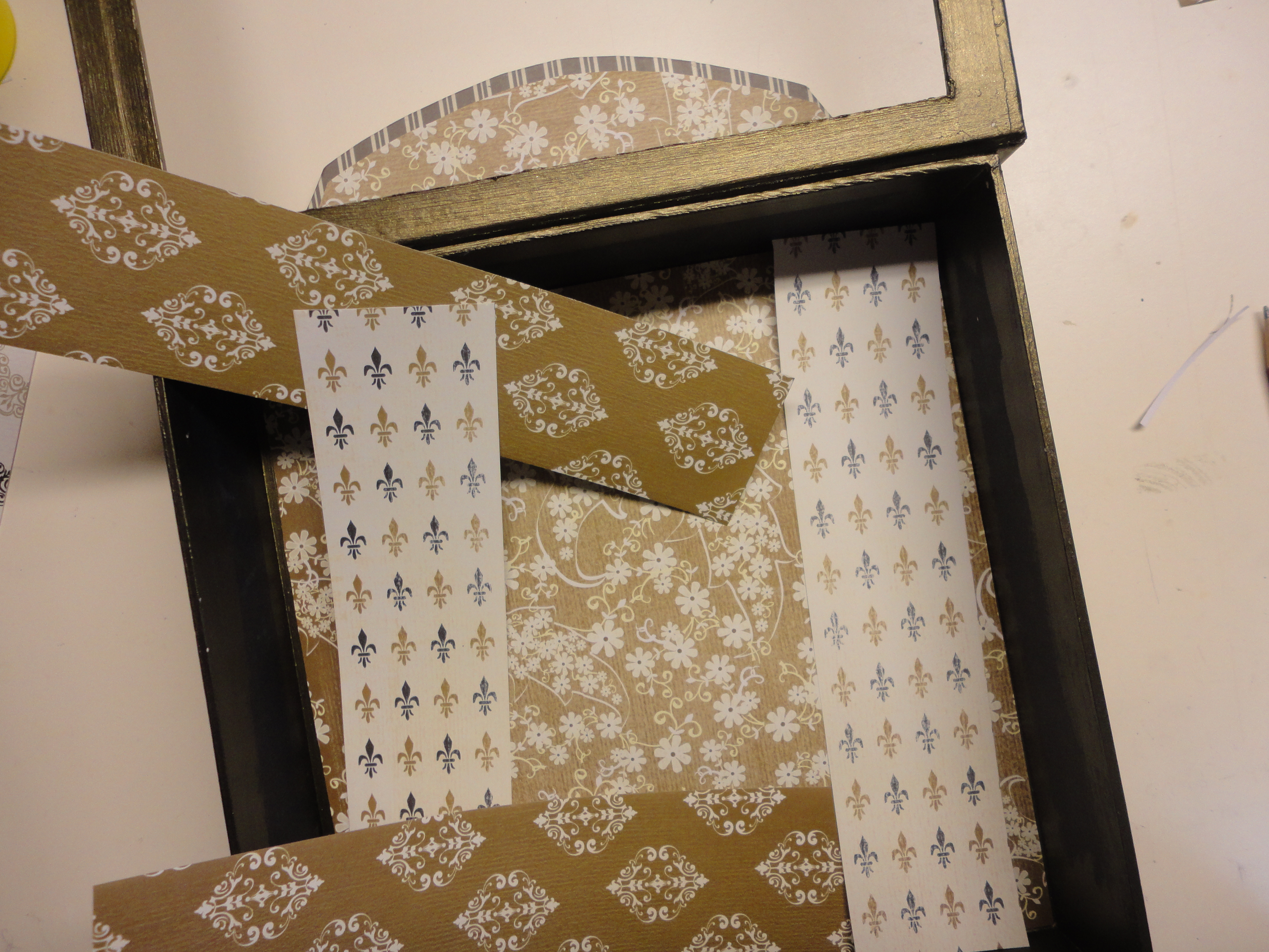 A little black and metallic gold craft paint was mixed together to match the papers. The mixture over the black base paint almost created an olive green tinge, an added plus!  I painted the front and back of the lid, the folds of the lid, all corners, edges, and frame pieces.