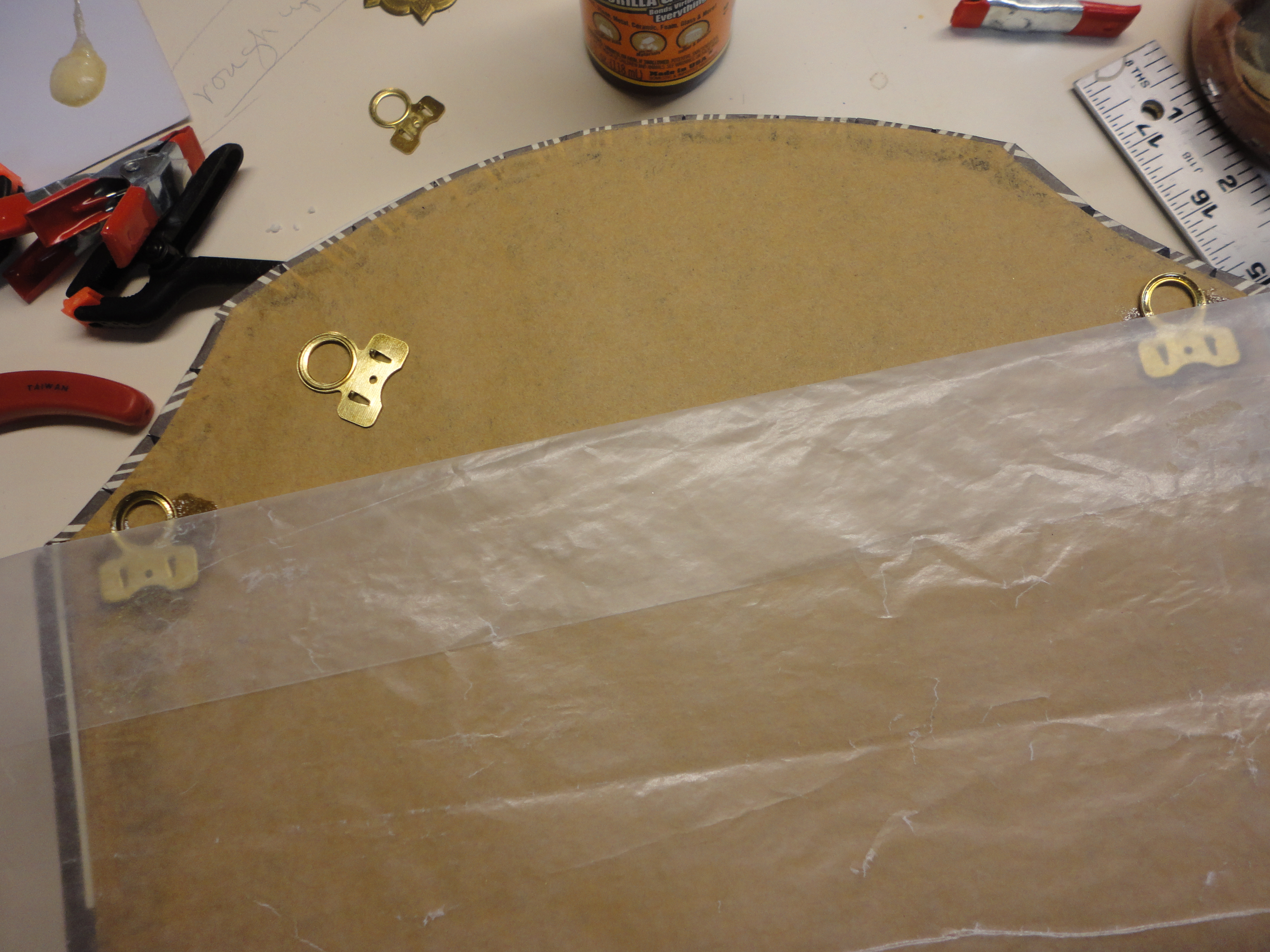 I’m going to rely heavily on Gorilla Glue to hold prong hooks for hanging.  I bent the tops of the hangers out a little, before gluing, to accommodate a nail head. A sheet of wax paper was laid over the glued areas, before weighing it down to dry, so nothing got stuck and damaged the brown paper.