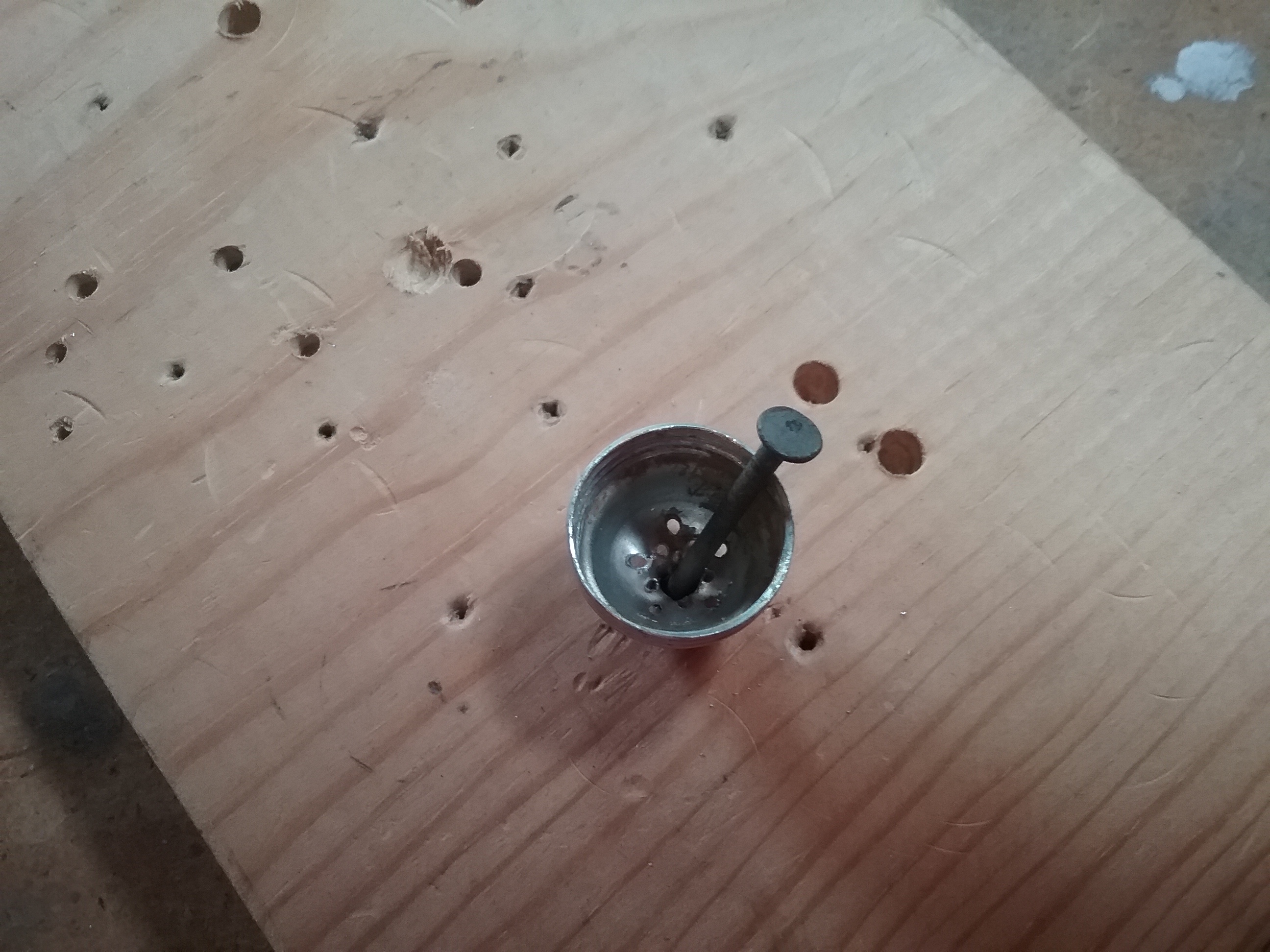 Nail a pilot hole in the lid. Drill a 1/4″ hole. Use small pliers to straighten out or bend jagged edges, just until a length of 5/16″ threaded rod will fit through it easily, you don’t want the hole any bigger than it has to be. My rod was a scrap piece, 20″ long, so I just left it that way.