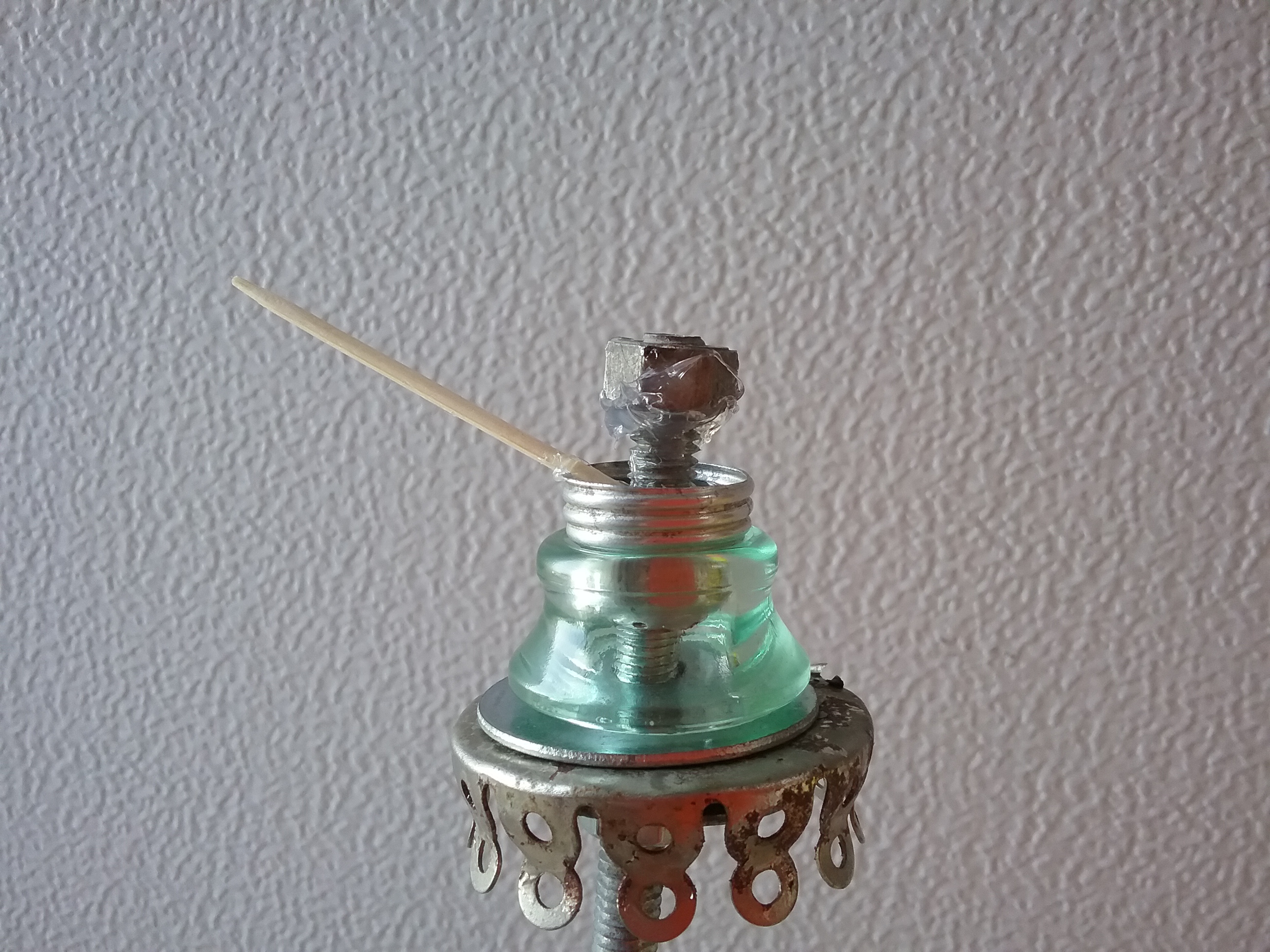 Find two nuts that fit the rod threads, and run one a couple inches down the rod. On the rod, stack and arrange your gathered pieces as we did in my last two posts, until you have something to your liking.