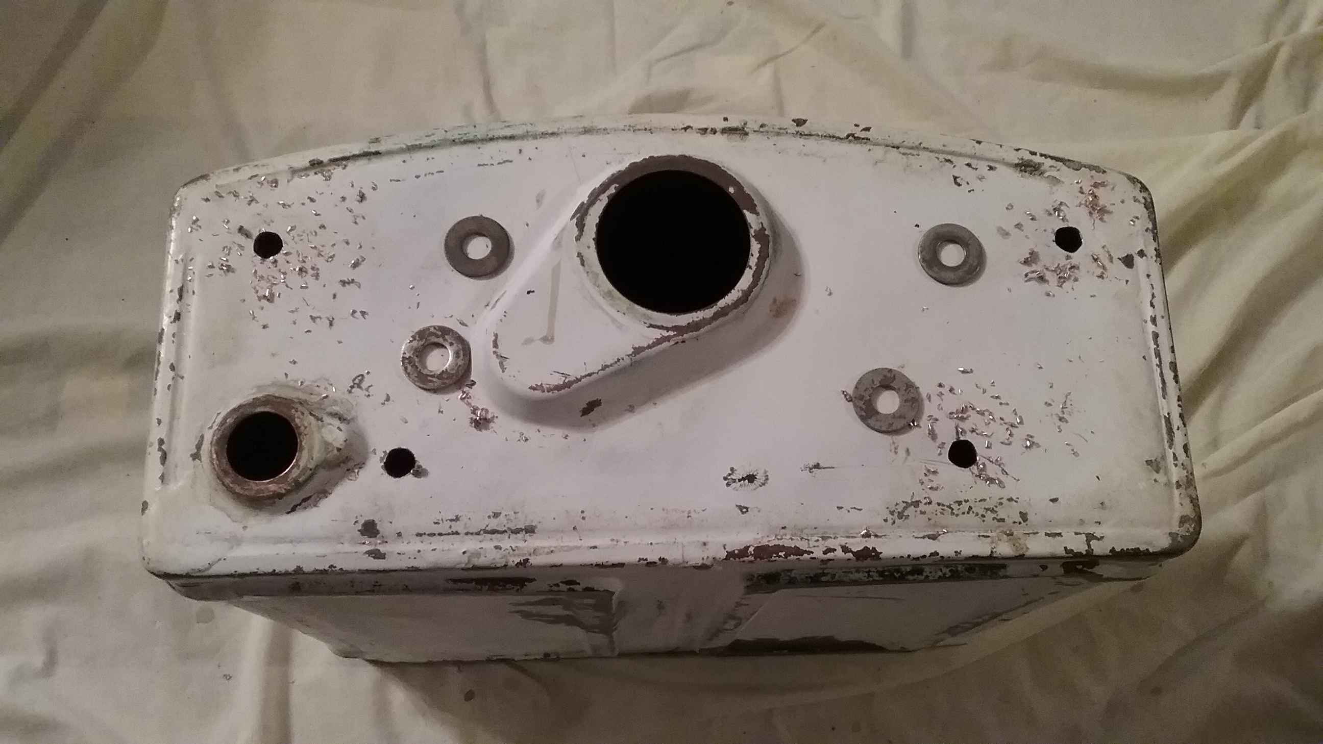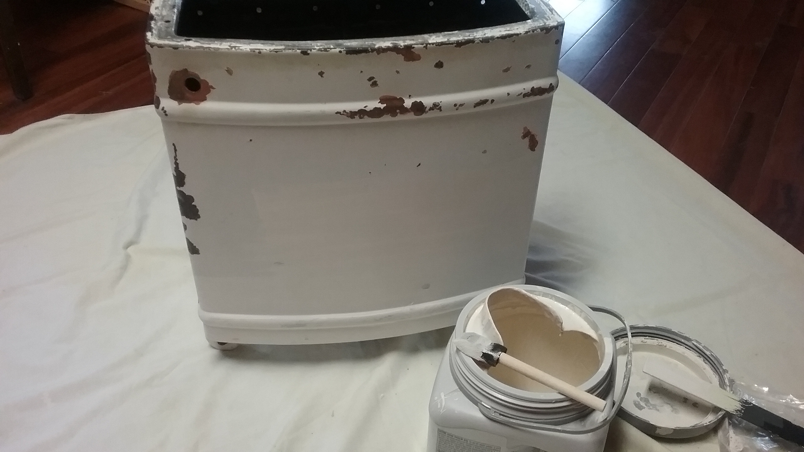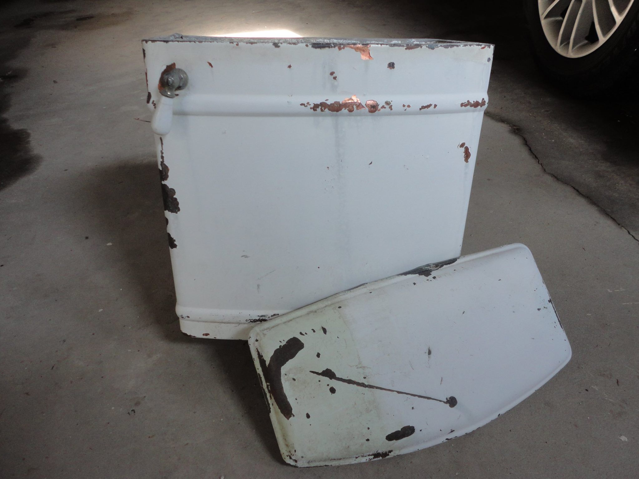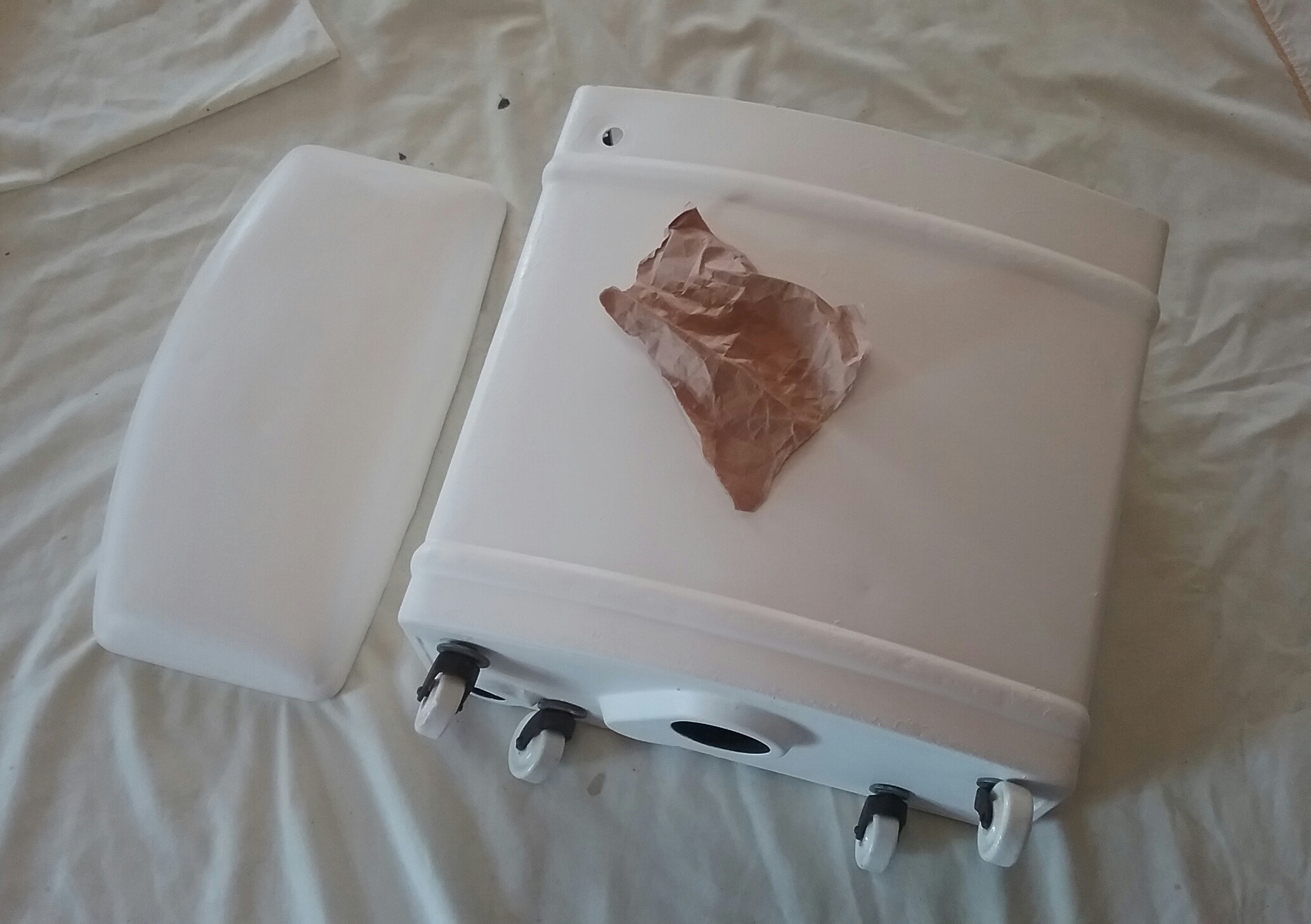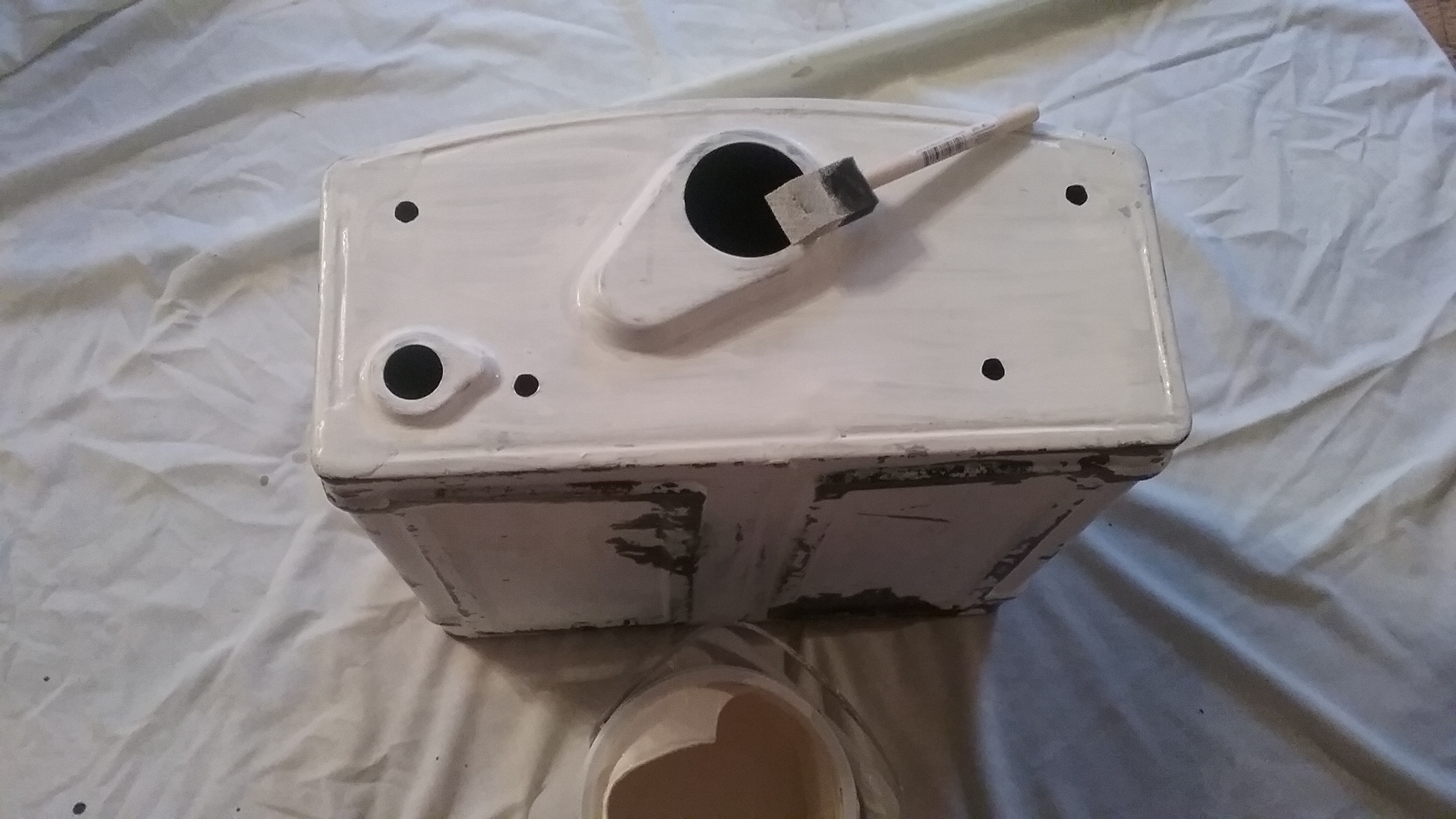 Paint the tank and lid. I beat a small dent out of the lid before painting. Lightly sand dried paint with a piece of wrinkled brown paper to smooth the finish.