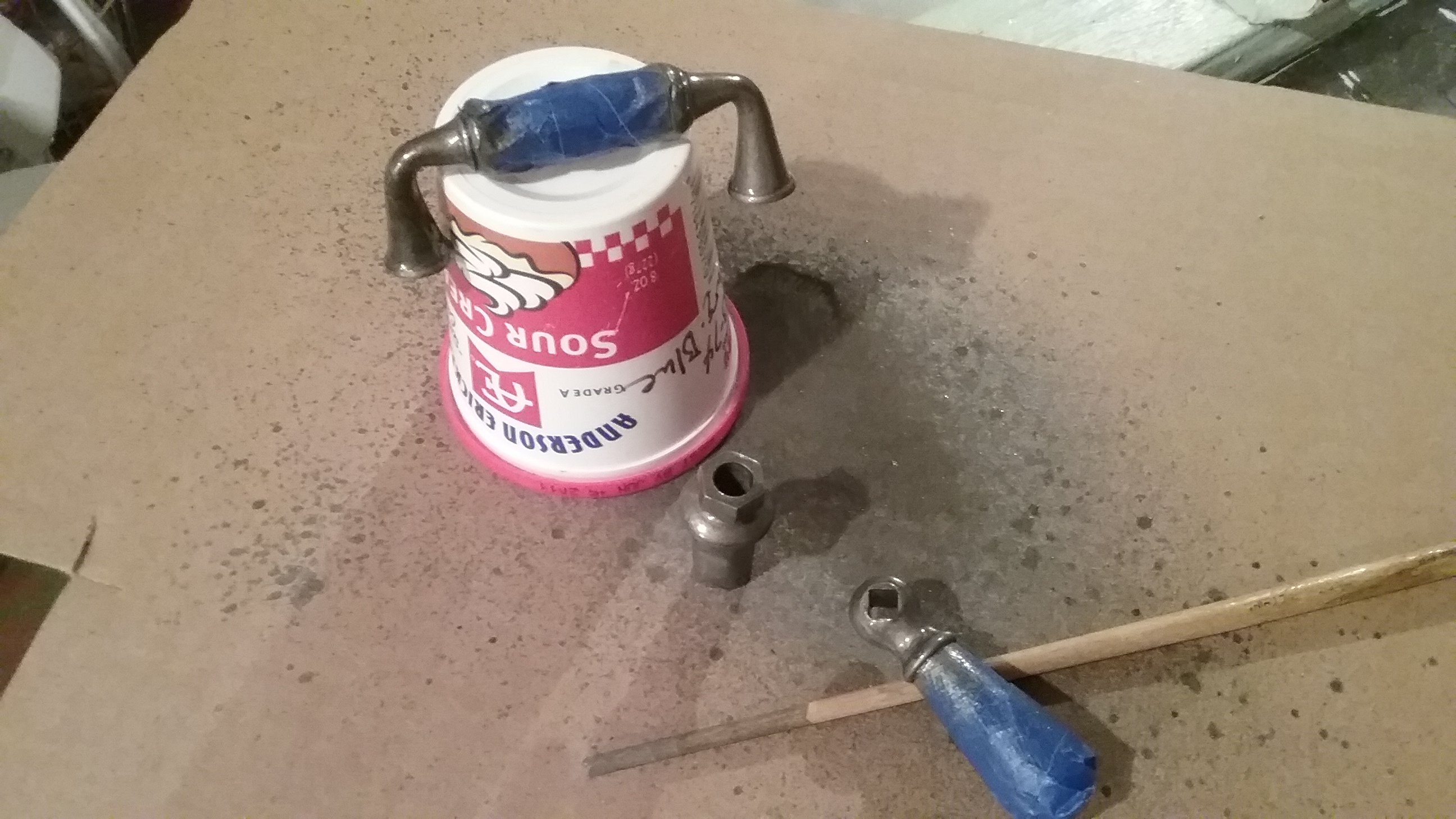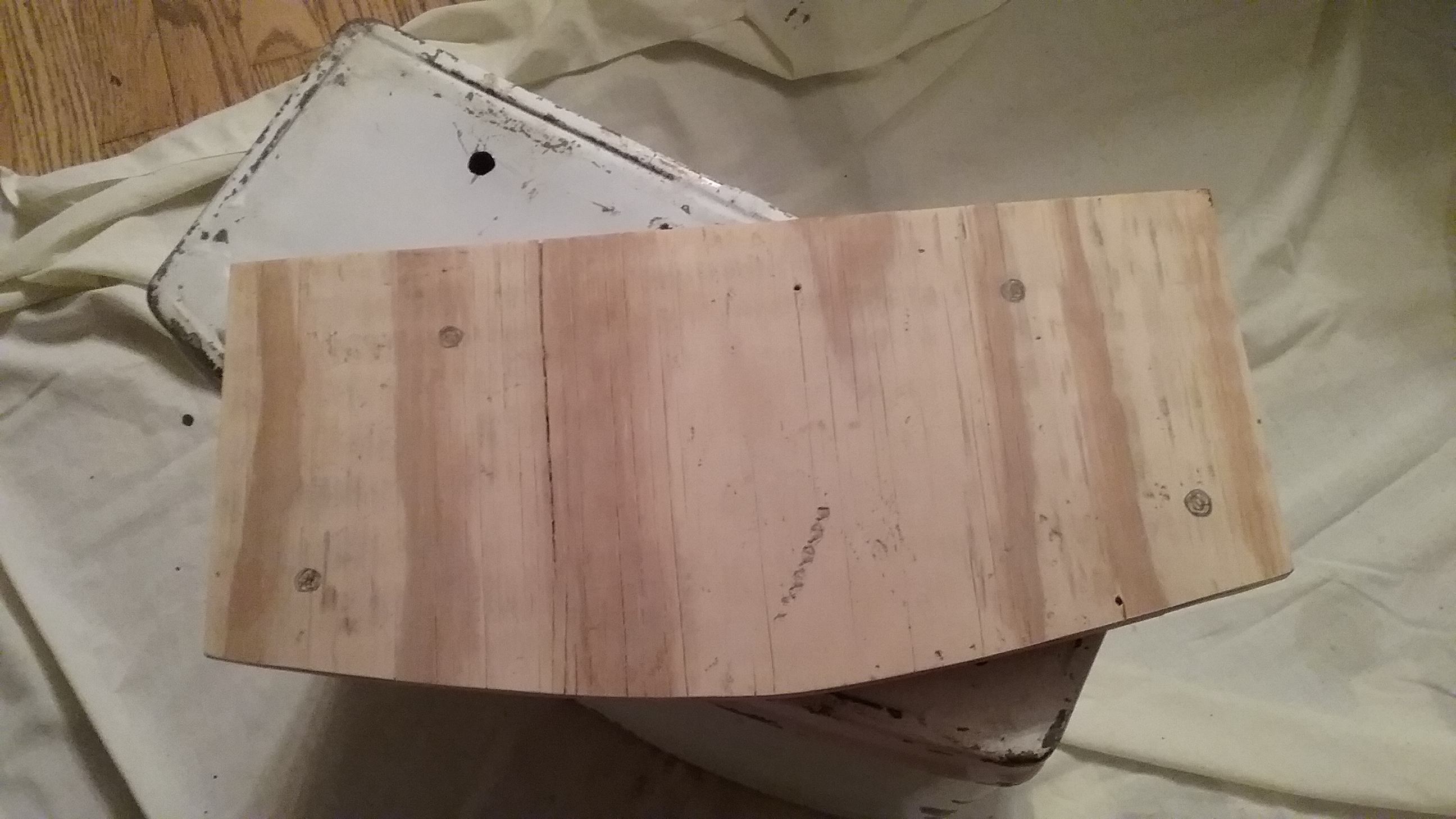 A piece of 1/2″ plywood had to fit in the bottom of the tank to help hold the wheels firmly. There was a lip on the edge of the tank opening, so, after tracing the top edge of the tank on cardboard, I reduced the template by 1/2″ all the way around, before transferring it to the wood. Cut and sanded the rough edges.20170106_150135  20170113_084338  20170113_085429