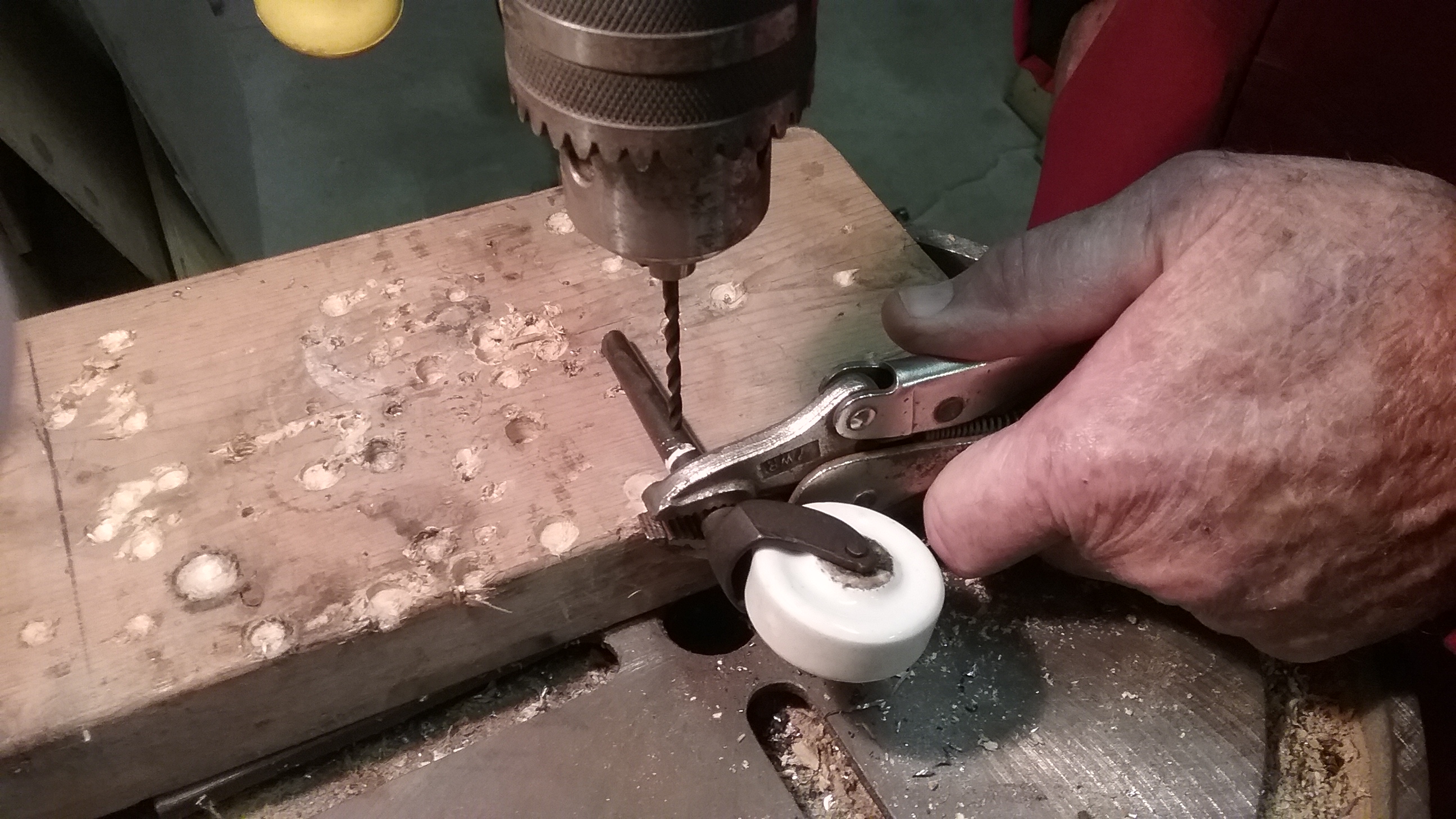 Center punch the caster stems on the white marking. At the drill press, hold the caster firmly with vise grips and drill an 1/8″ hole, on the center punch, through the stem.