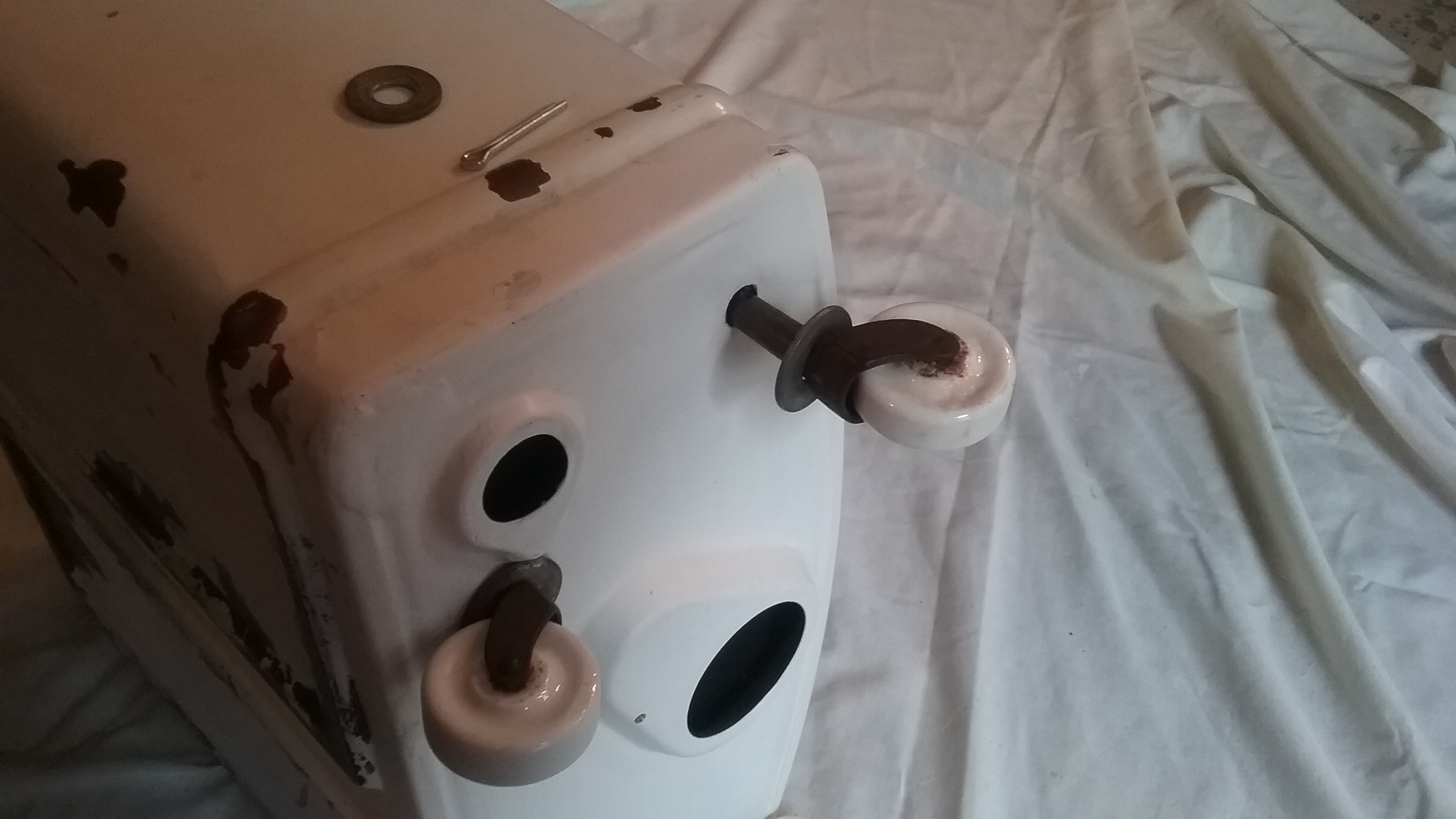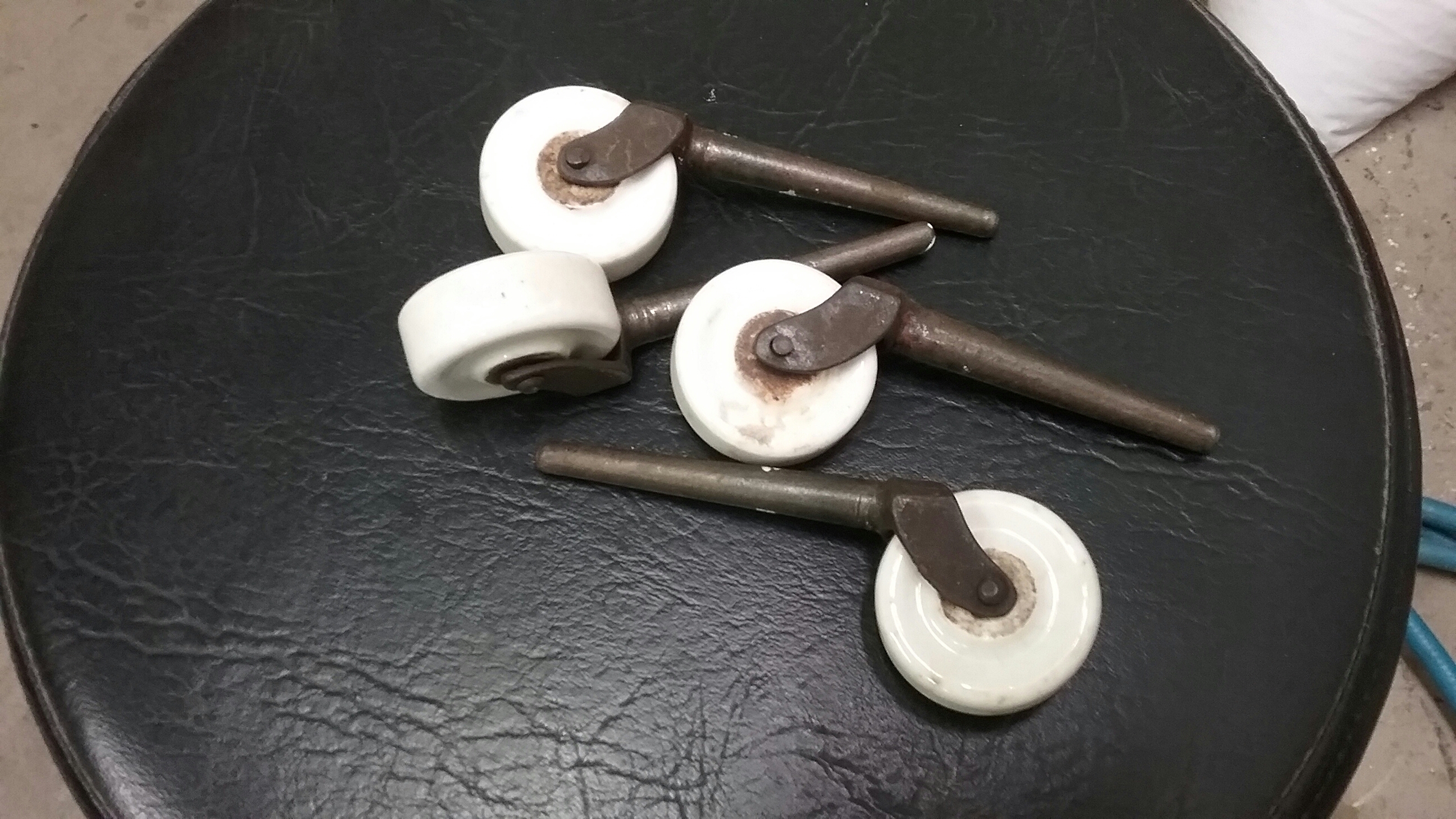 Before I could get started, all the plumbing was removed from the inside of the tank and it was given a disinfecting scrub. I had to find a set of four 1 1/2″ dia. vintage porcelain casters, eight large flat washers, and four cotter pins. I tried looking around locally for the casters, then got impatient and ordered some off of Ebay. A toothbrush and some Comet cream cleanser cleaned them right up.