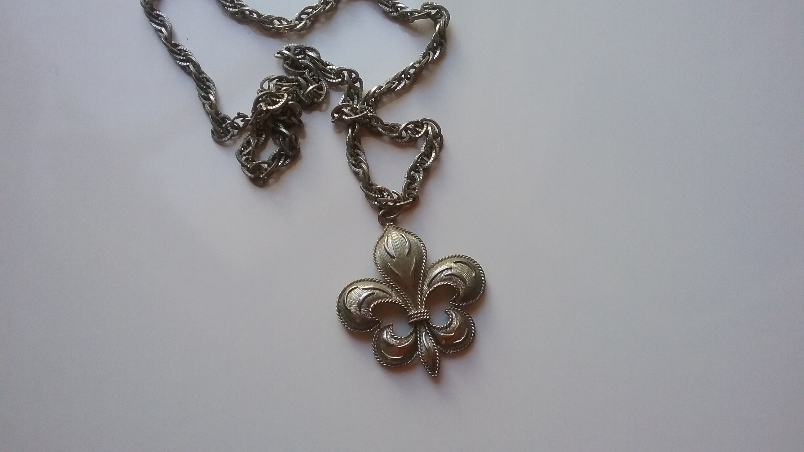 I’ve been saving an old necklace from my high school years because I liked the fleur-de-lis (never thought I’d be using it for something like this). The link at the top of the fleur-de-lis was pretty weak and bent right off without leaving any sharp edges. I sprayed it to match the handles and let it dry.