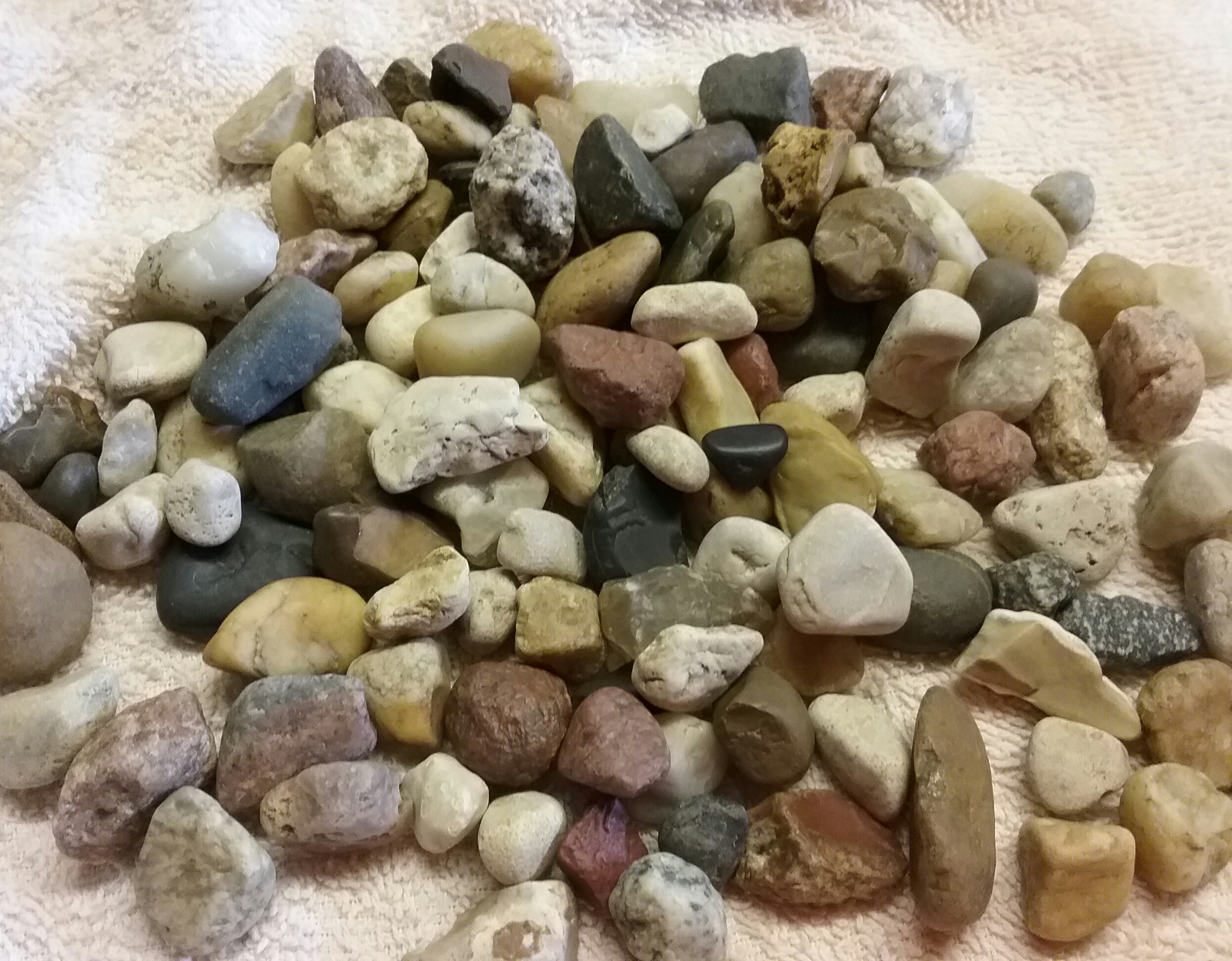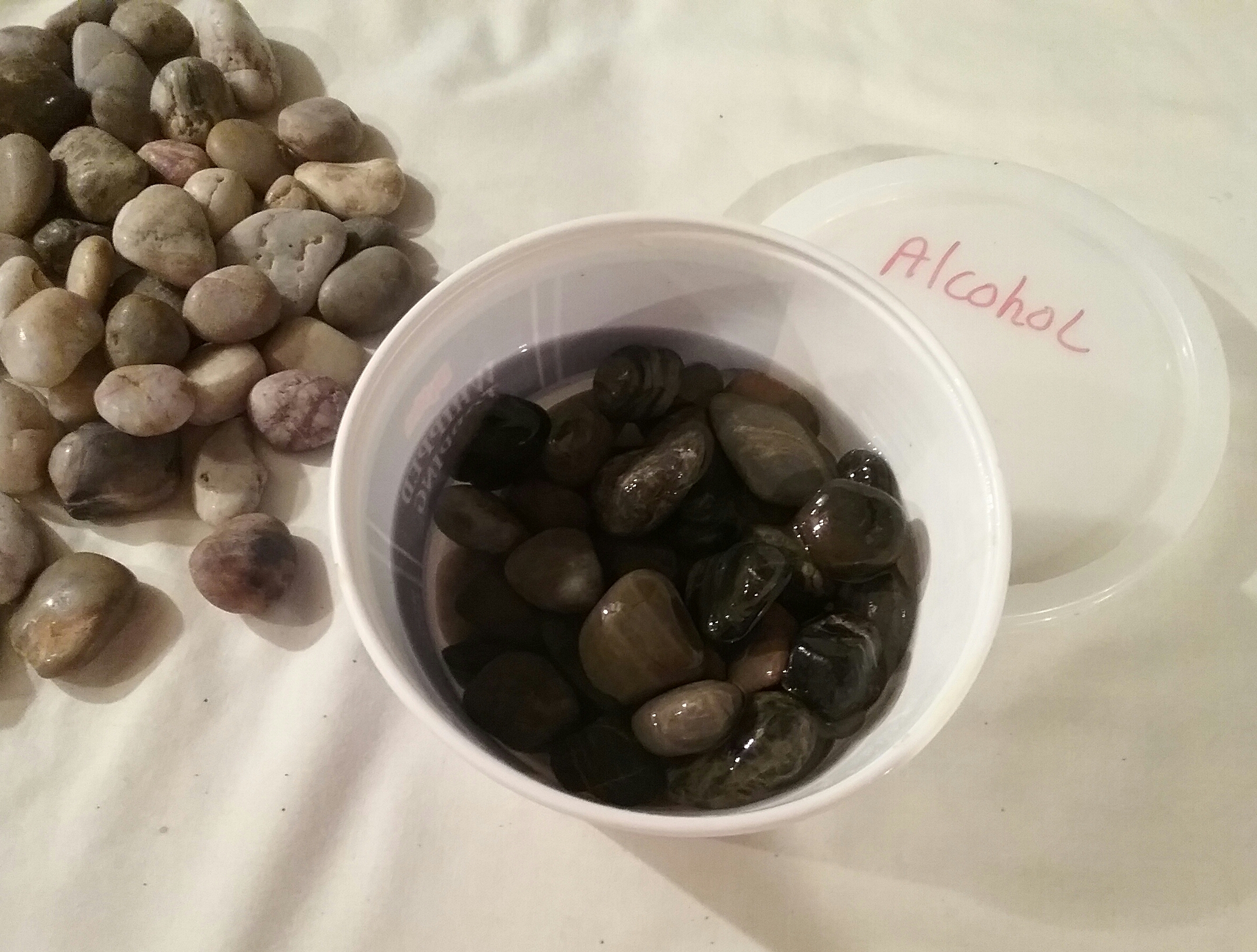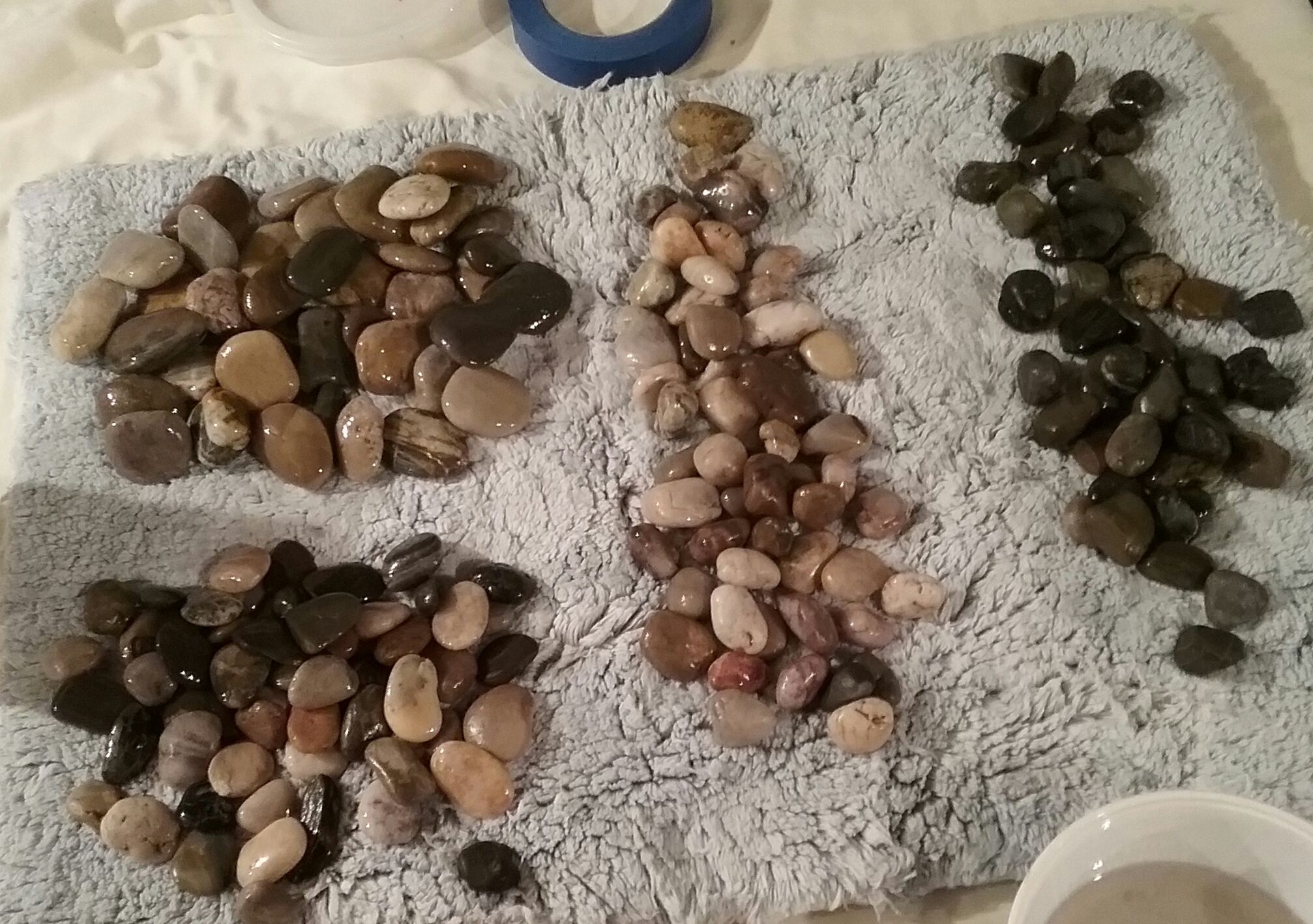 After washing the rocks, they were sorted by the colors and sizes I wanted to use, swished in a bowl of rubbing alcohol to remove any oils on them, and laid out to dry.