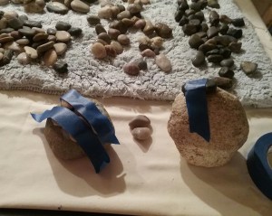 using a liberal amount of glue, begin gluing on the rocks you like, leaving a small space between them, 1/16″th to 1/8th”. Use a piece of tape to hold them into place until they dry. This takes some time. You may even have to use tape and a rock as a prop while drying. If you don’t wait for the rocks to dry firmly enough, they may shift as you move the rock around.
