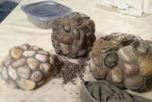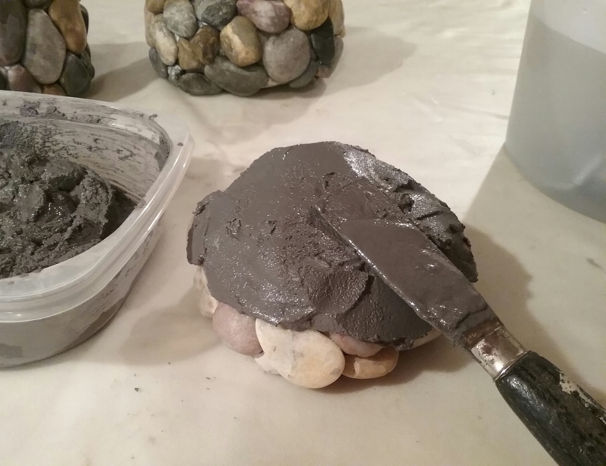Re-stir the mixed grout. Spread the grout across the rocks, pressing it into all the crevices. You can spread the grout on neatly with a putty knife, or just lay it on with your gloved fingertips, which is the method I prefer. Make sure you cover the edges of the rocks on the bottom as well.