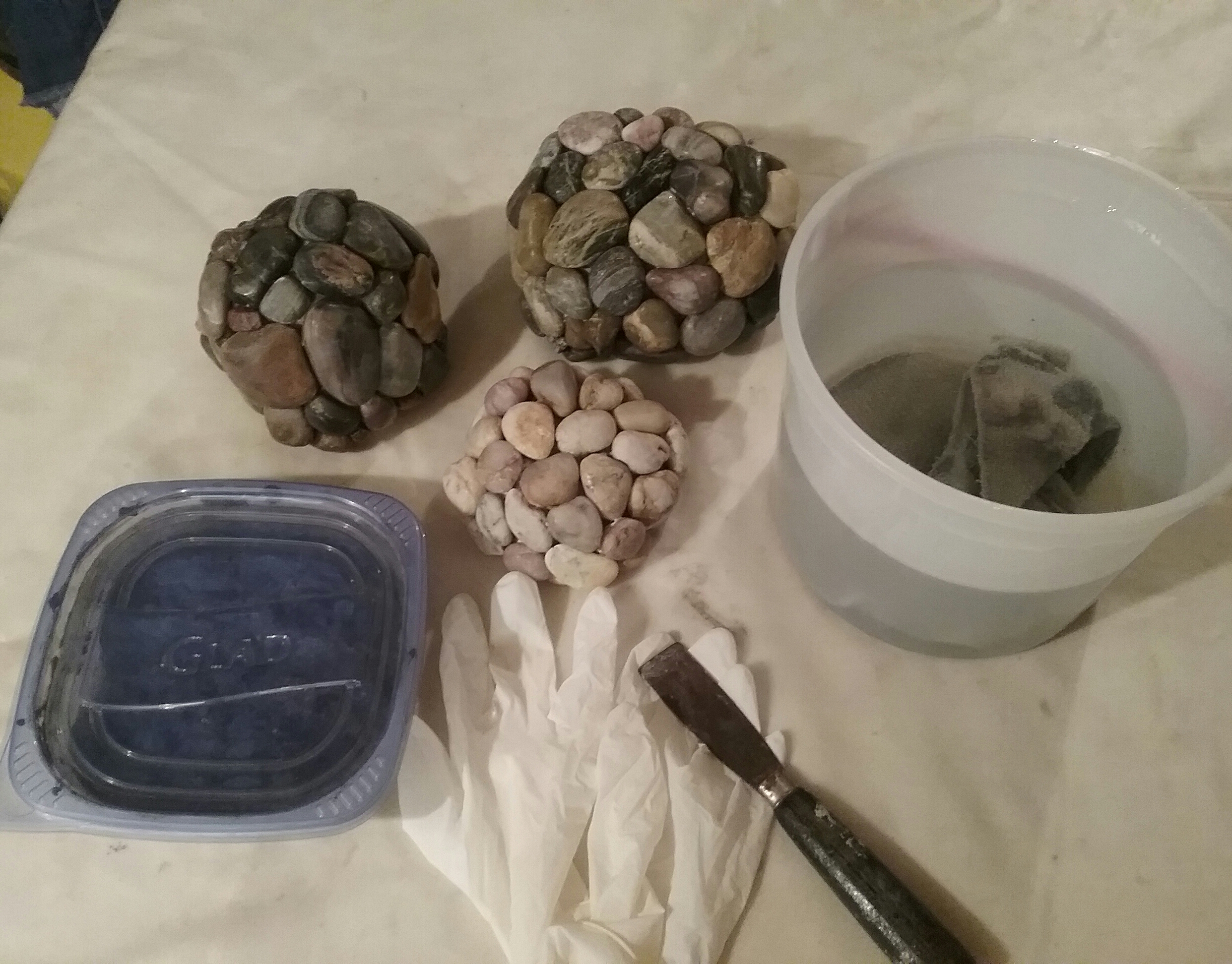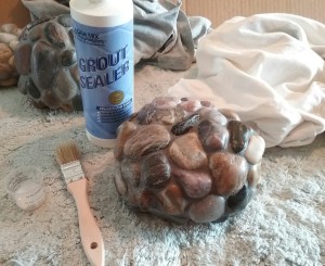 Once the rocks are covered with grout, let them set 30 to 40 minutes. Squeeze out a wet rag and wipe them down to expose the rocks you glued on. Let set another 10 to 15 minutes, or sooner, depending on how fast your grout is drying, then rub firmly around the rocks to remove any excess grout, and smooth the grout lines. Wipe lightly with a rinsed dampened rag. Rinse rag with clean water and wipe lightly again. The rocks should be pretty clean but still have a slight hazy look. Let dry 12 hours. ALWAYS DISPOSE OF DIRTY GROUT WATER OUTSIDE – NEVER POUR IT DOWN YOUR DRAIN! Using an outdoor faucet works best for rinsing and washing grout buckets, rags, and tools.