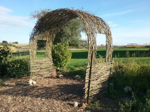 Last year, I got rid of the five year old trumpet vines on my garden trellis because new vines were popping up everywhere and taking over. Wanting the trellis covered, but not with vines again, I got the idea of weaving willow branches through the steel frame. Thanks to my niece and sister’s tree trimming, I was able to gather, and weave, two big batches of branches. It needs a lot more branches, but I’m very happy with the way it’s shaping up. I guess I’ll just have to be content for now, until next spring when the weather is more accommodating, and someone starts trimming again.