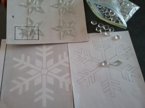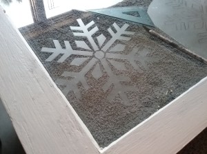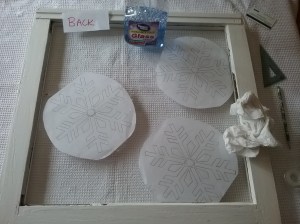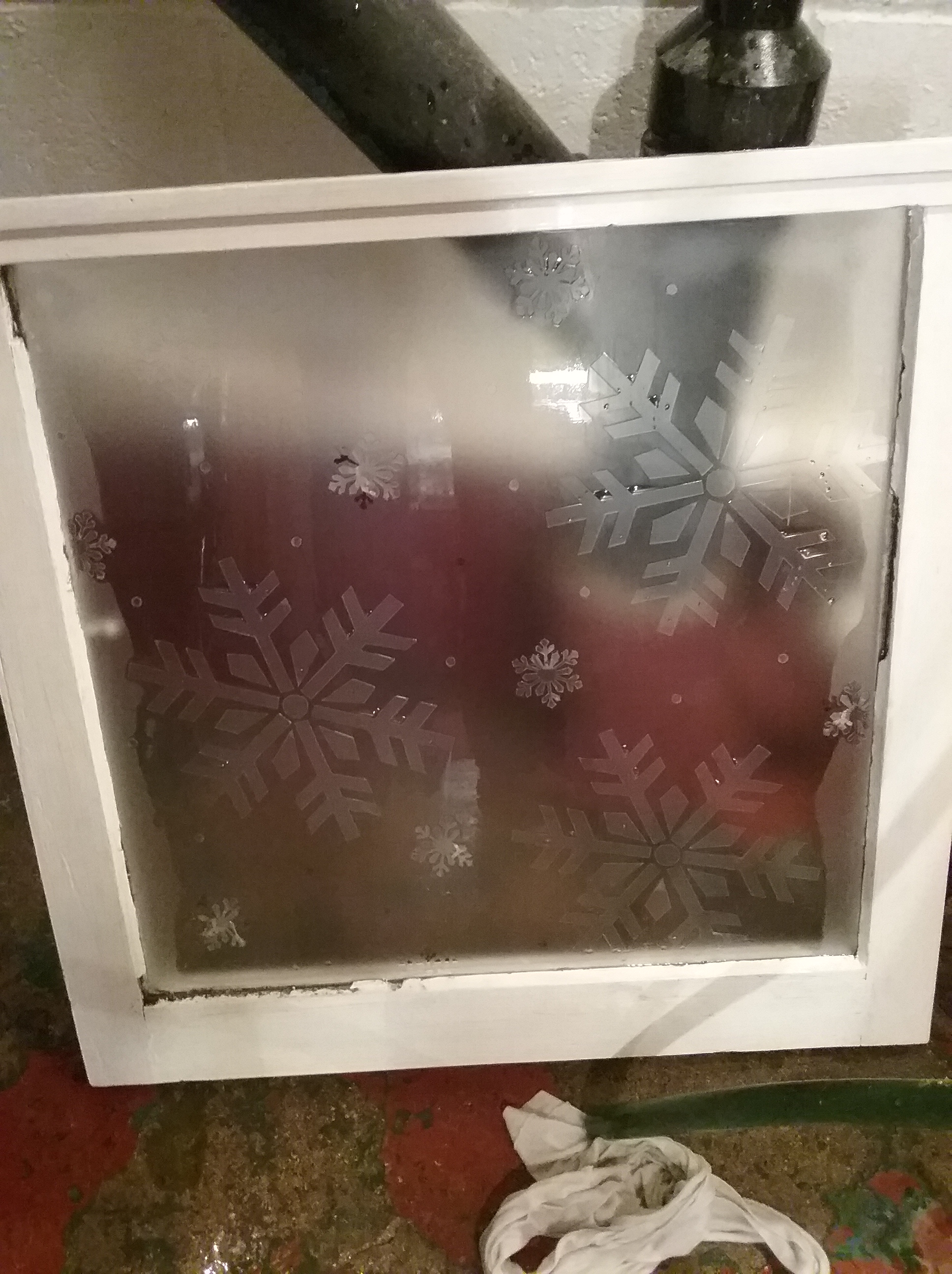Easily a weekend project, they’re great for gift giving, vendor shows, or your own Christmas decor. I used an old window, an enlarged snowflake stencil pattern, small clear ruler, matte contact paper, exacto knife, template pencil, large snowflake paper punch, hole paper punch, 10 oz. Armour etching cream, 3″ wide chip brush, E6000, small beveled glass star sets, and clear glass globs. My pattern was planned around the small glass bevels I had on hand.