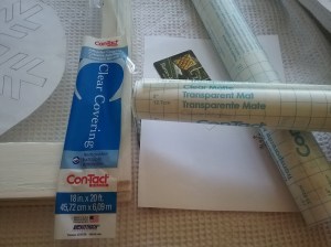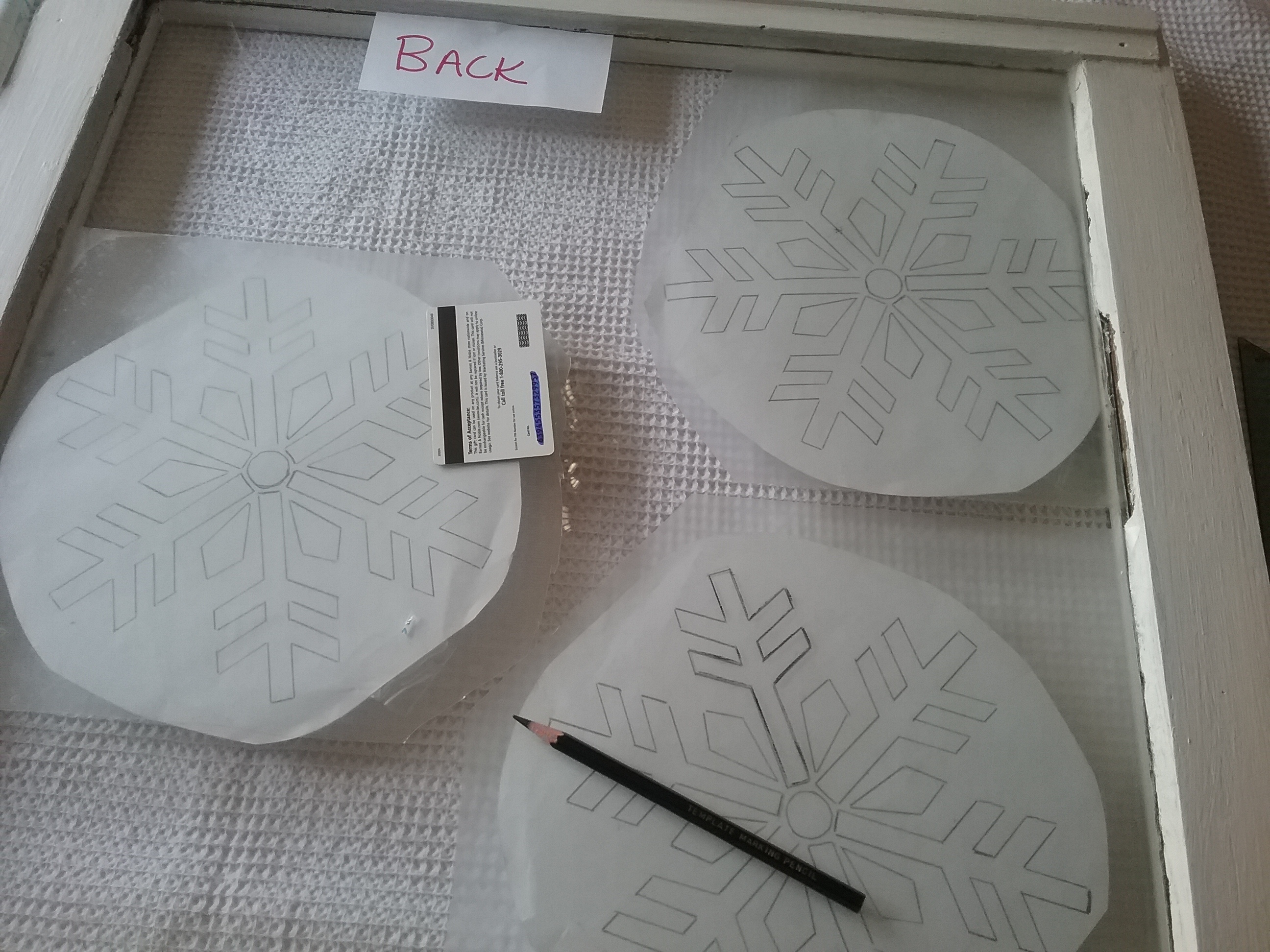 Flip the window face down. Clean the glass thoroughly. Apply matte contact paper down over your patterns. Use an old plastic gift/credit card to help apply it smoothly and work out any air bubbles. Trace the patterns on to the glass with a template pencil.