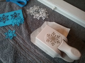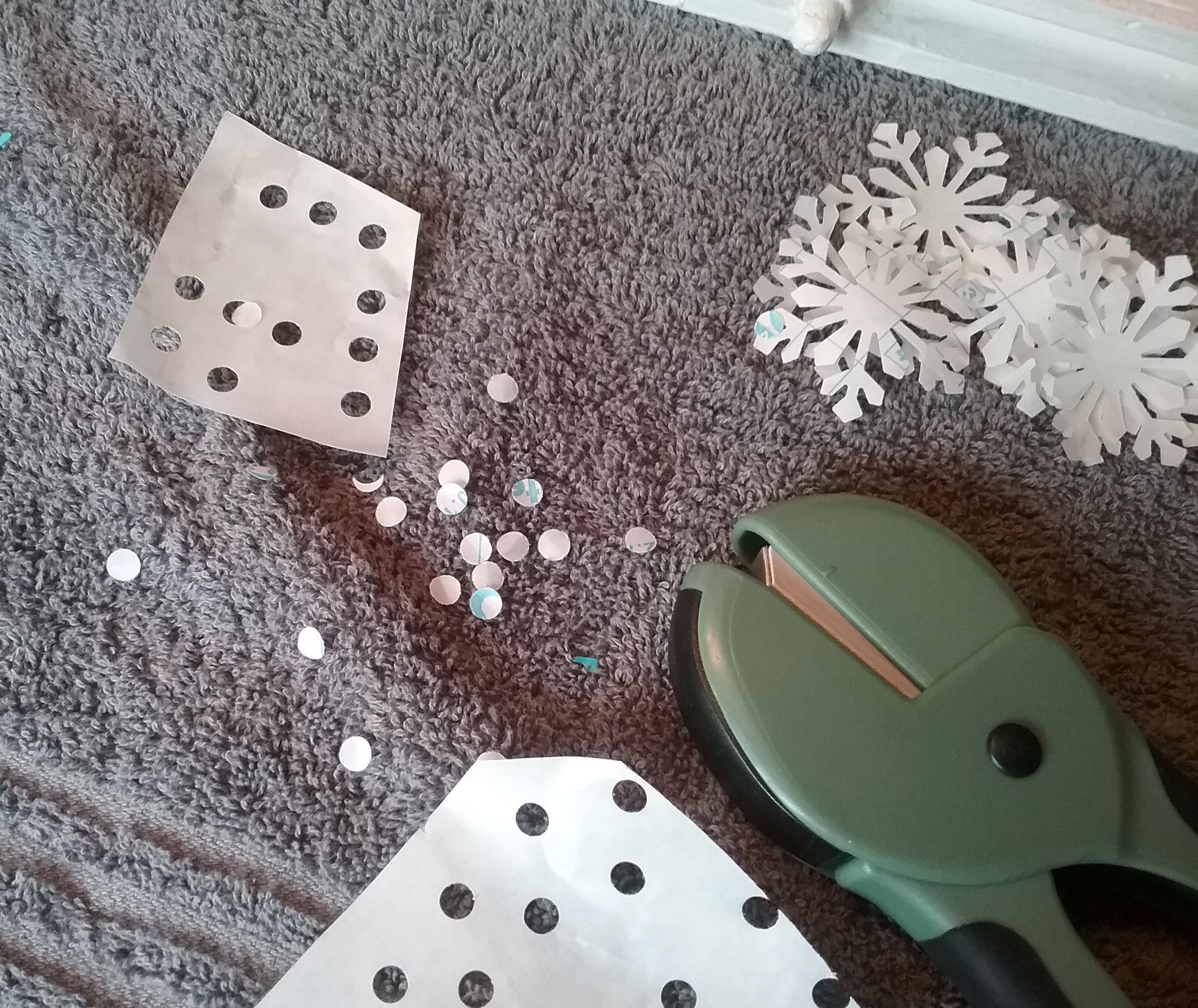 I used a large Martha Stewart Snowflake Punch and a regular hole punch to punch more shapes out of the matte contact paper. I found it worked best if the paper was inserted into the punch sticky side up. Card stock was punched a couple times in between each large snowflake to keep the punch from getting sticky and causing the contact paper to bind. My hole punch was pretty sharp so I didn’t have to punch the card stock much to keep it clean.