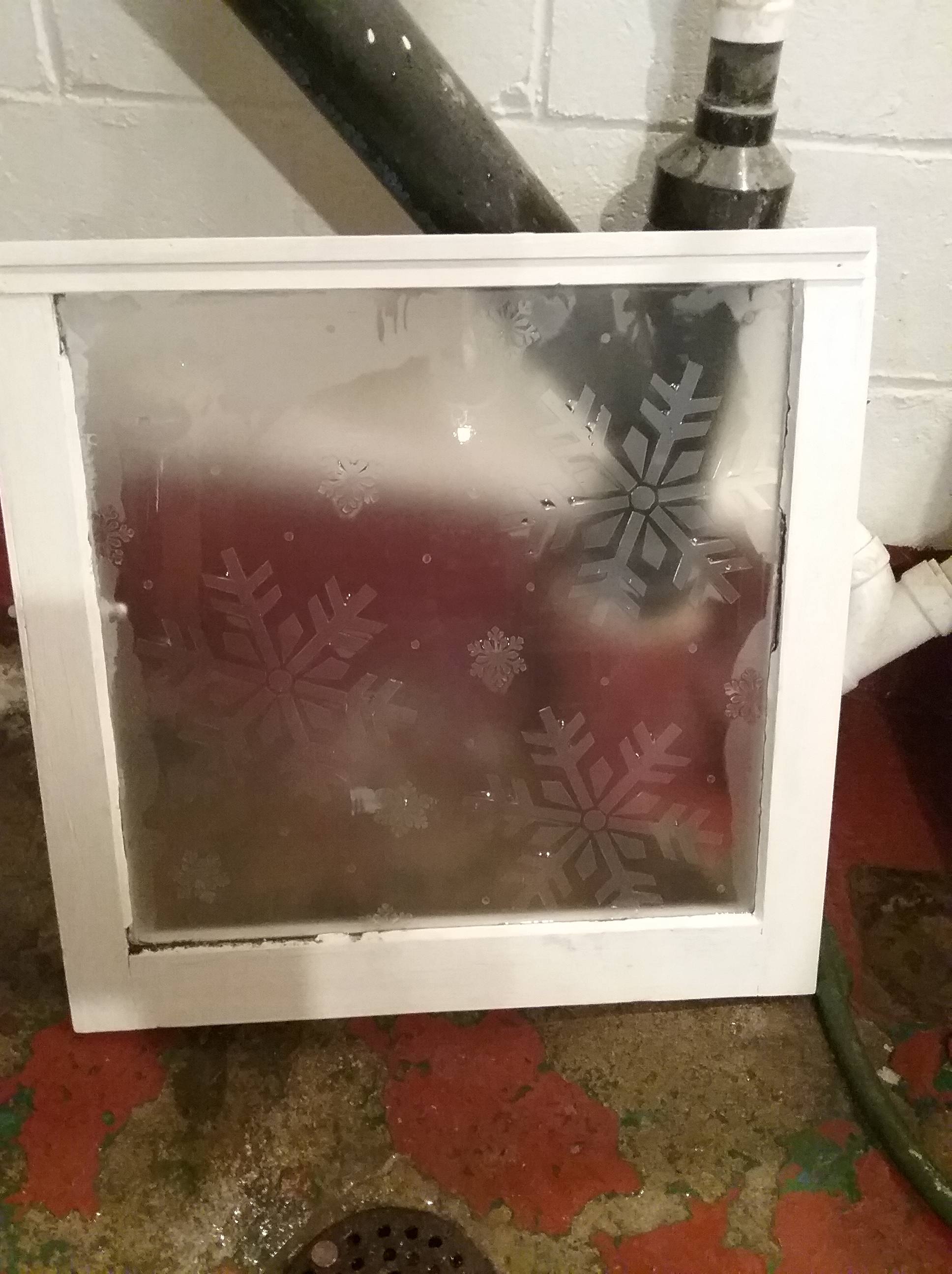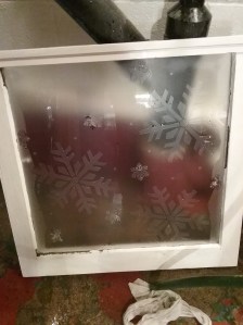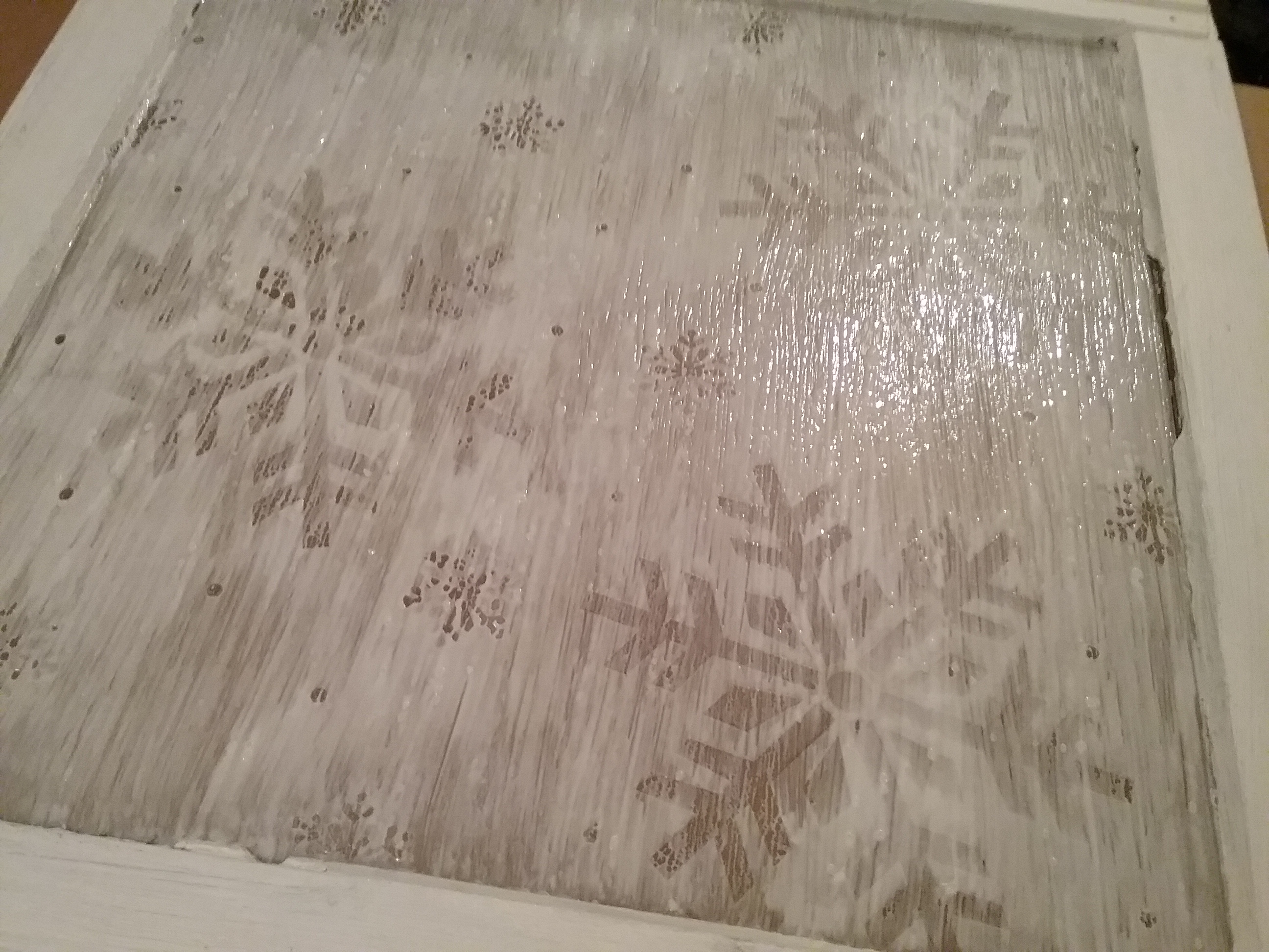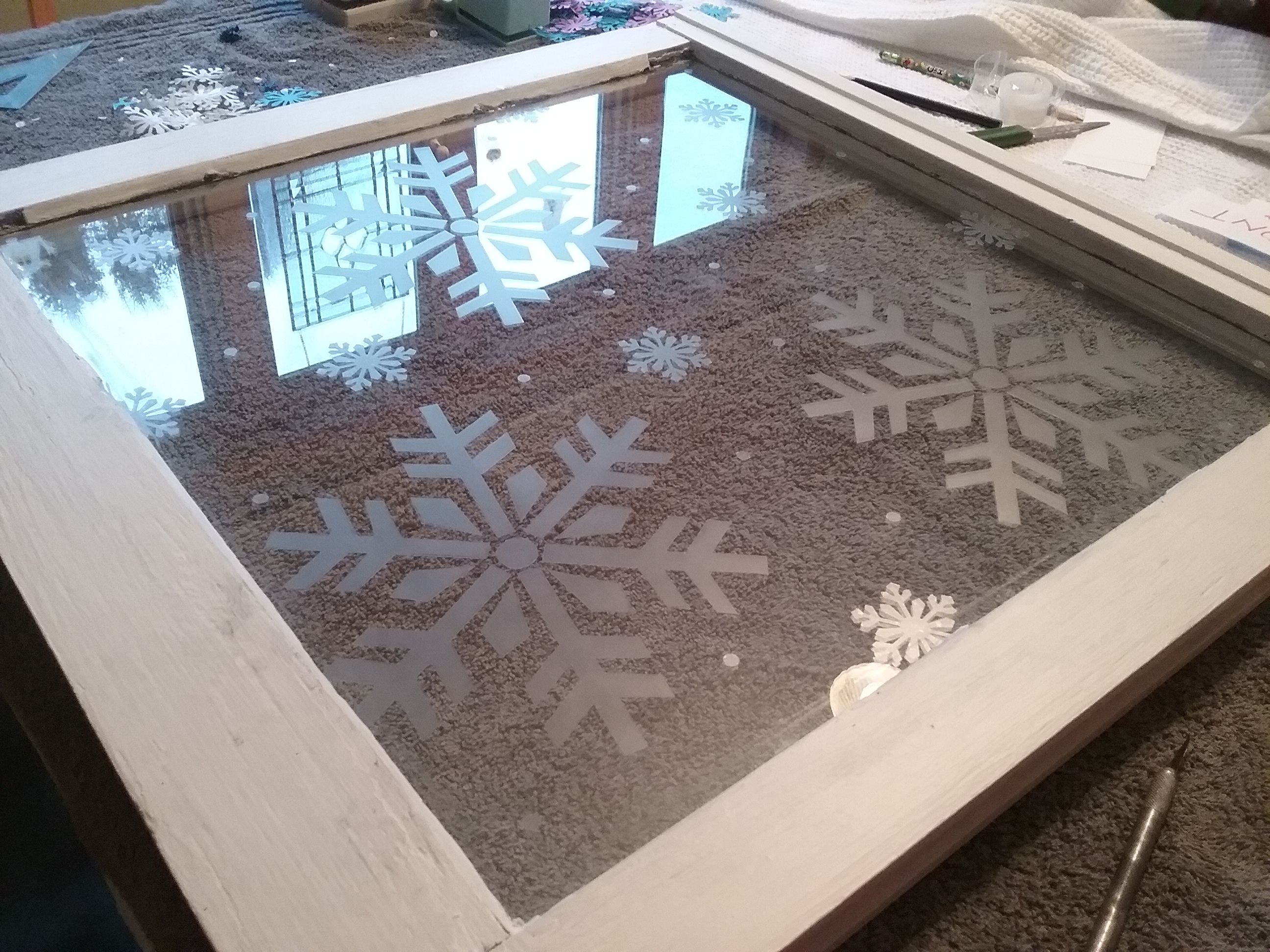 After lightly distressing the paint on the window edges (which I should have done when I painted the window), a hot glue gun was used to add some greenery and pine cones to the front, upper left corner. Lay the window flat, face up, to glue on the glass embellishments with E6000, matching them to the shapes in the snowflakes underneath. Let the glue dry at least 12 hours.