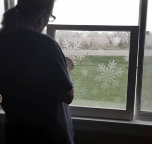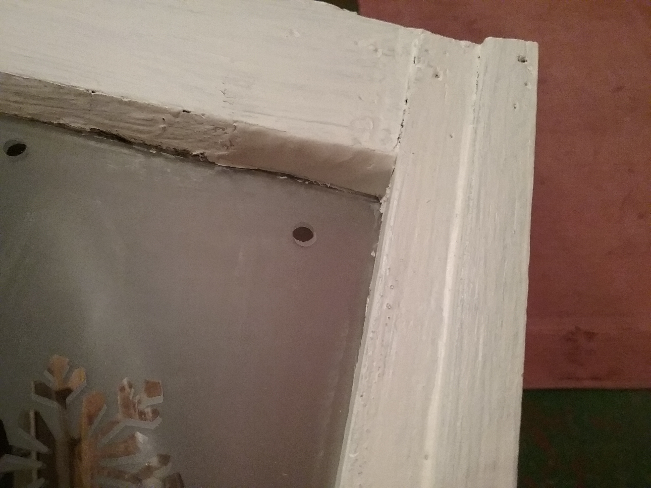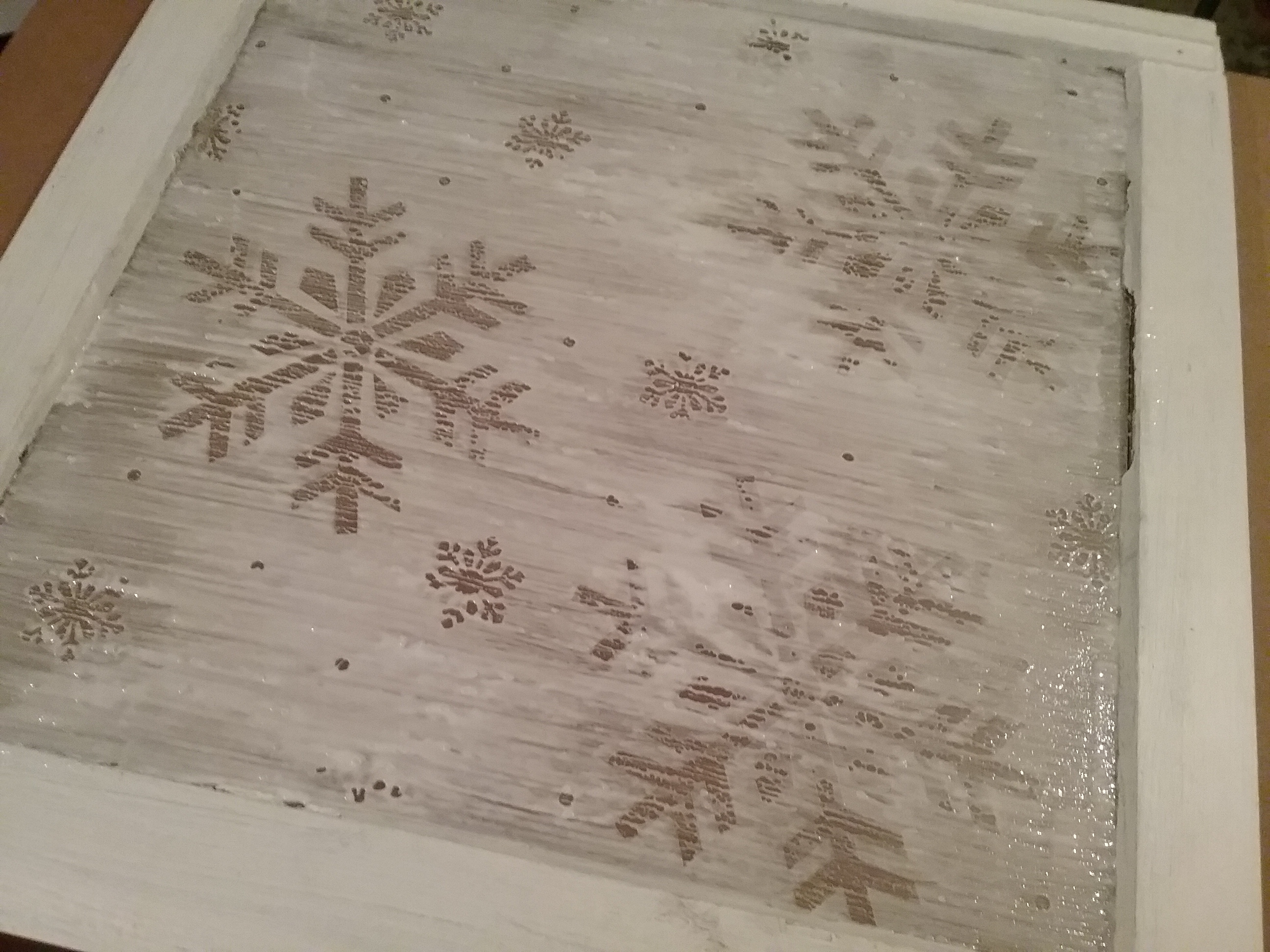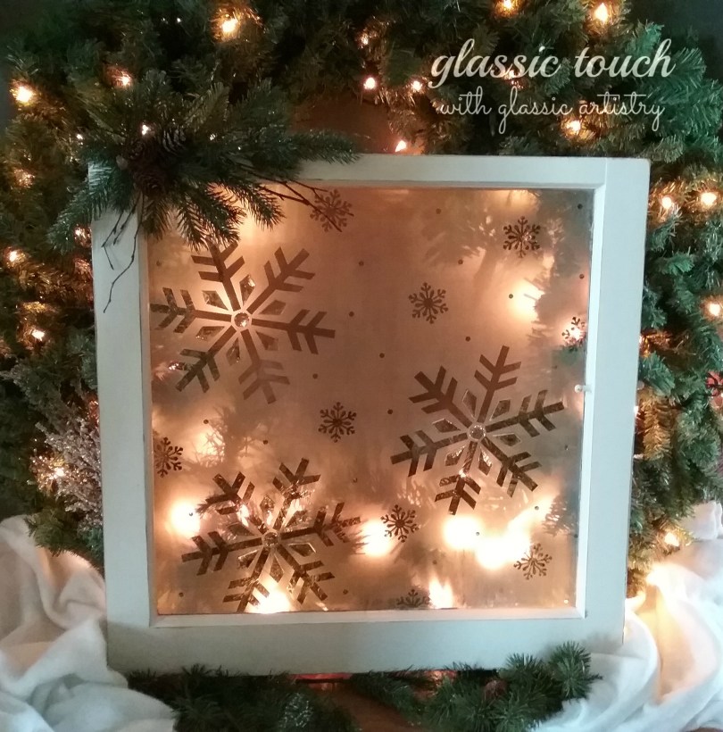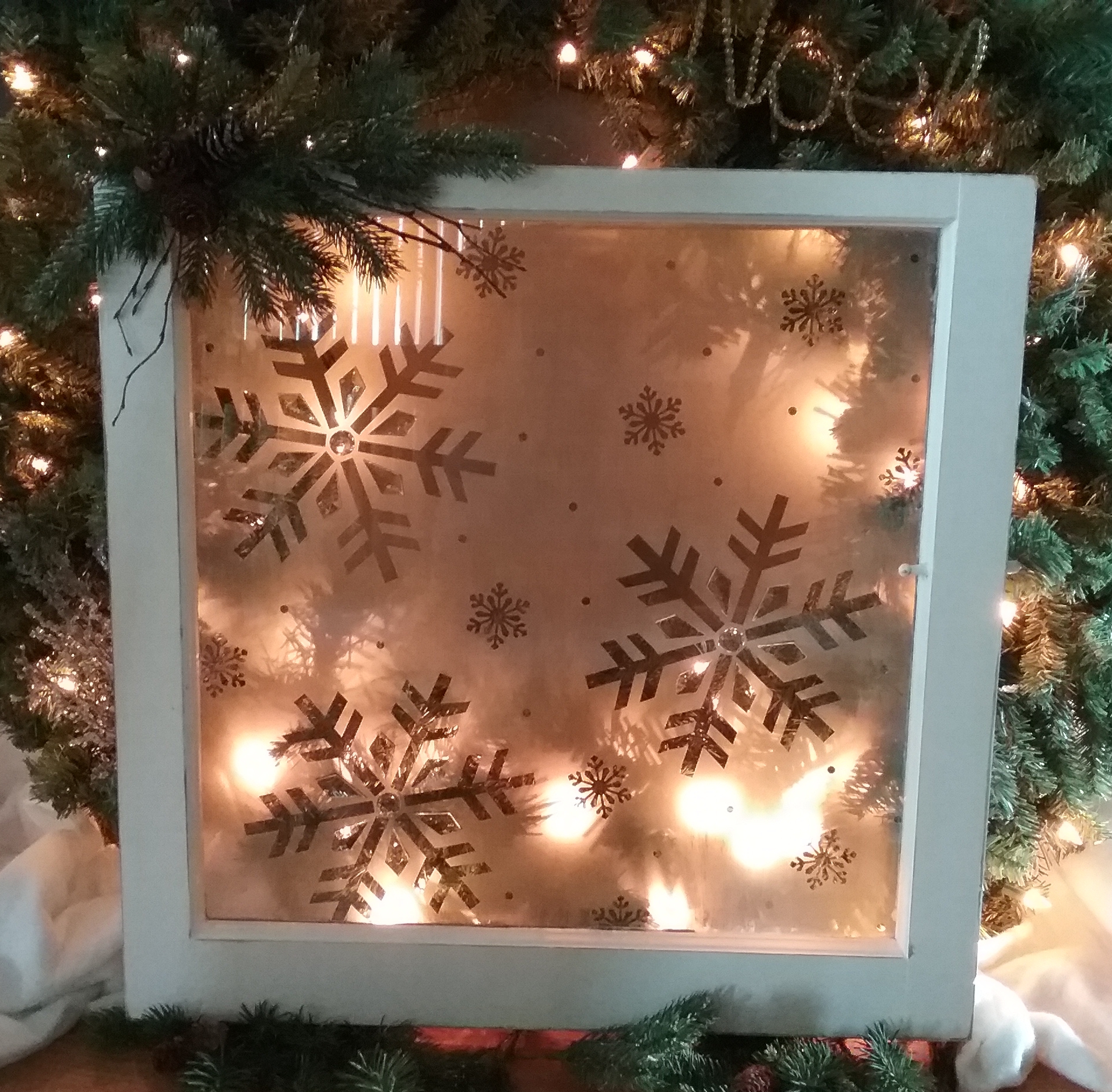 After lightly distressing the paint on the window edges (which I should have done when I painted the window), a hot glue gun was used to add some greenery and pine cones to the front, upper left corner. Lay the window flat, face up, to glue on the glass embellishments with E6000, matching them to the shapes in the snowflakes underneath. Let the glue dry at least 12 hours.