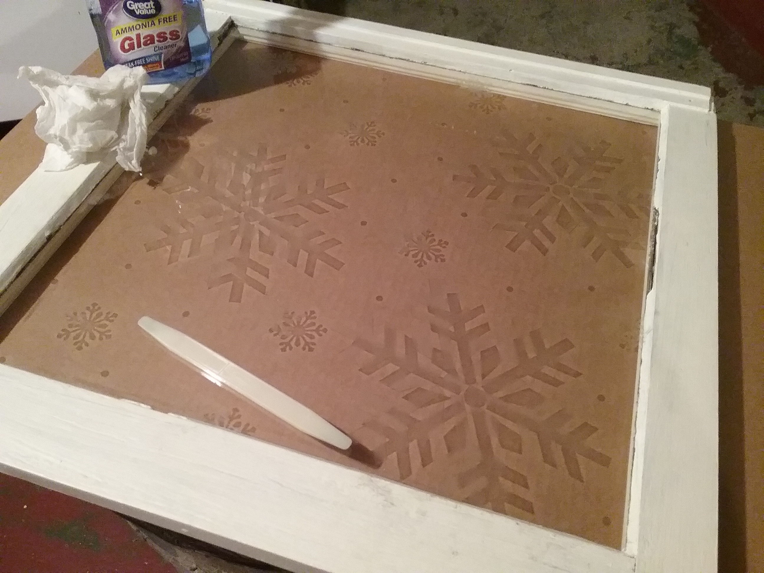 Lay the window on a flat work surface. I usually lay a big piece of cardboard over a 33 gal trash bin, and use it as a table near my sink. With your fingers, or fid, make sure all your pieces are burnished down well. Spray a paper towel with glass cleaner and lightly wipe your window again to remove any fingerprints or sticky residue, especially around the edges of the contact paper shapes.