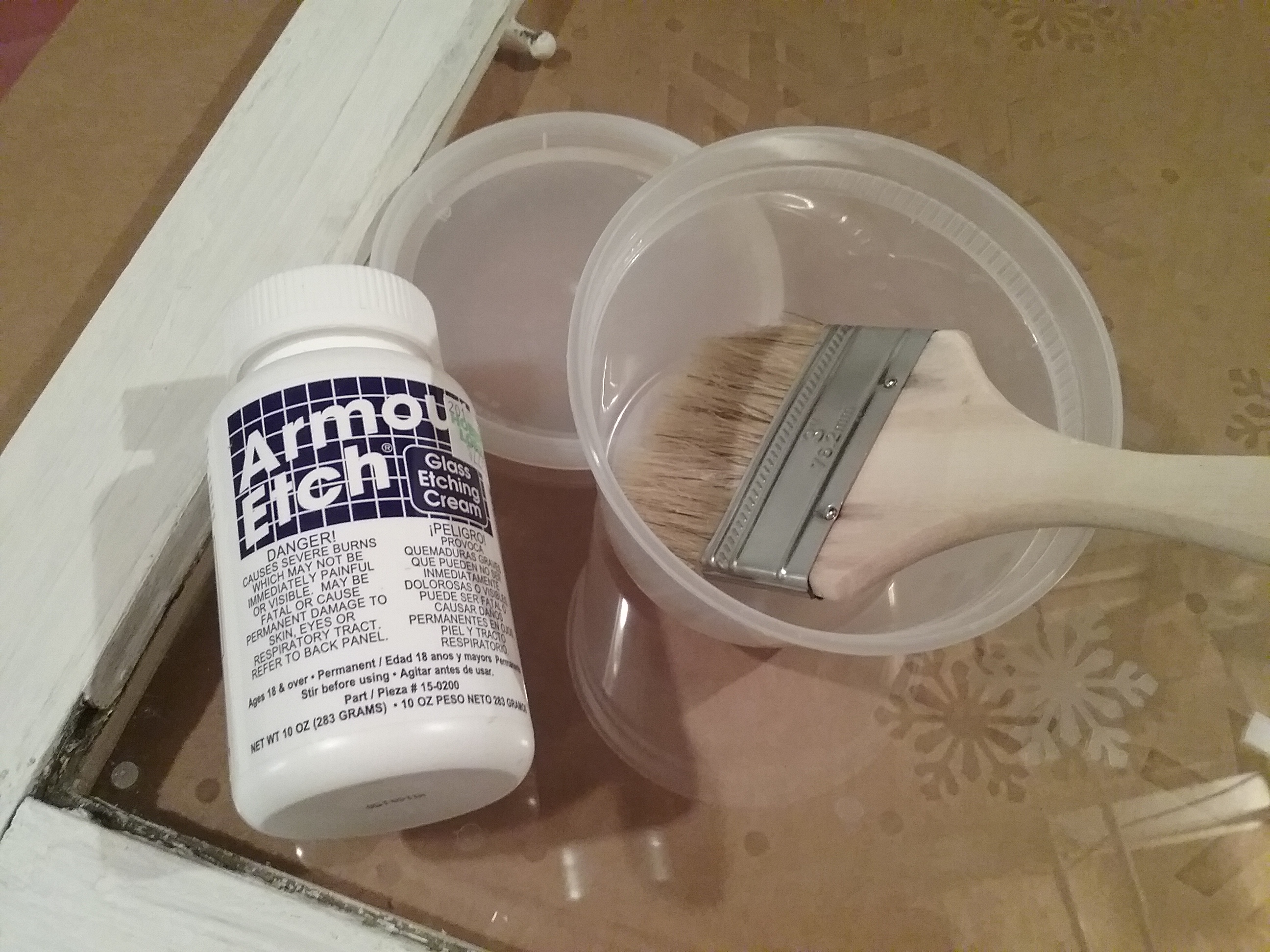 For good coverage, the etching will be done with two coats, one horizontally, one vertically. It doesn’t make any difference which one you do first. Use a soft, natural bristled 3″ paint brush. When working with etching cream, work in a well ventilated area, wear eye protection and rubber gloves.