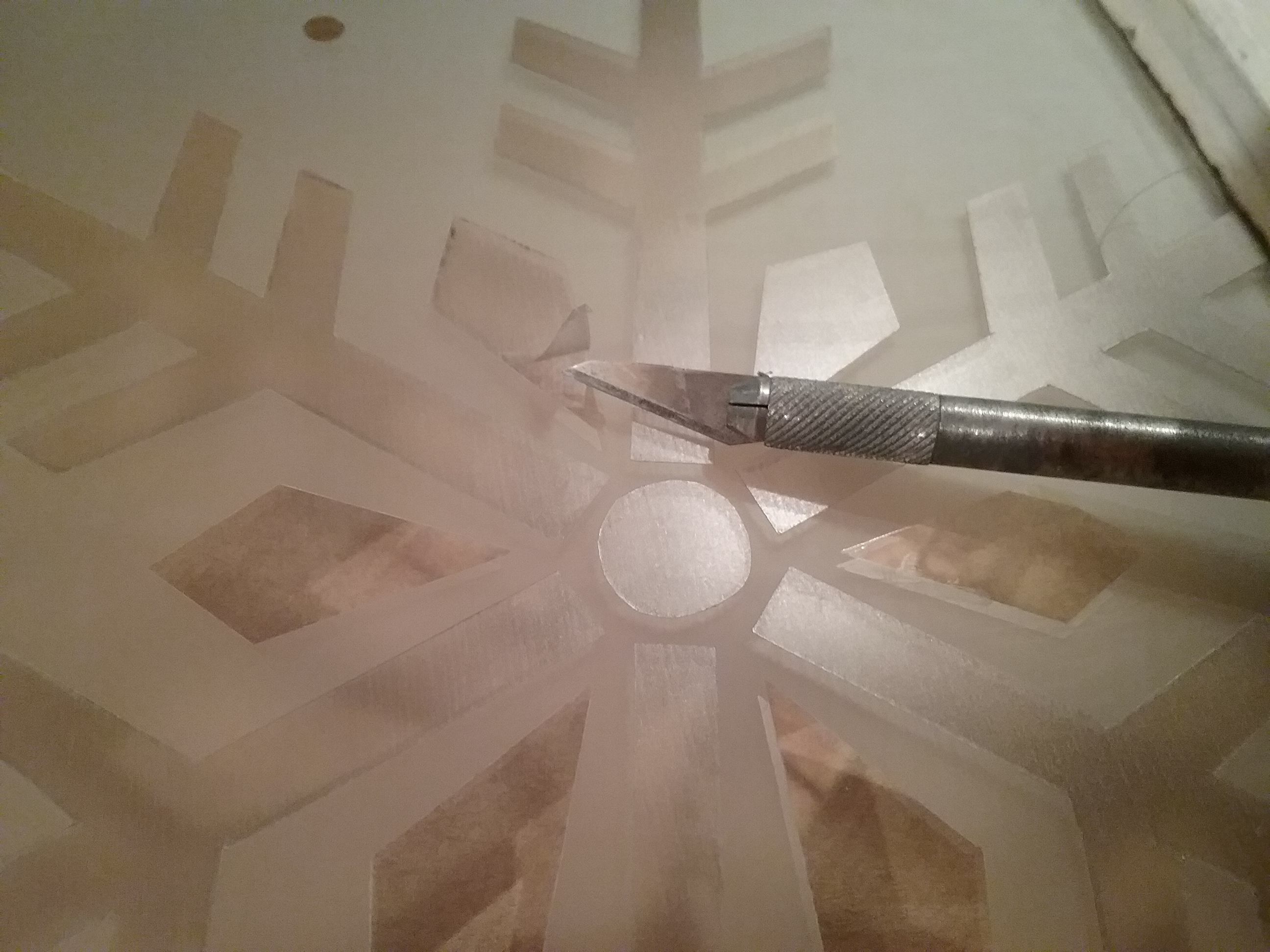 Remove the paper patterns from the front, then, use an exacto knife and a small clear ruler, or straightedge, to cut the snowflakes out of the contact paper.