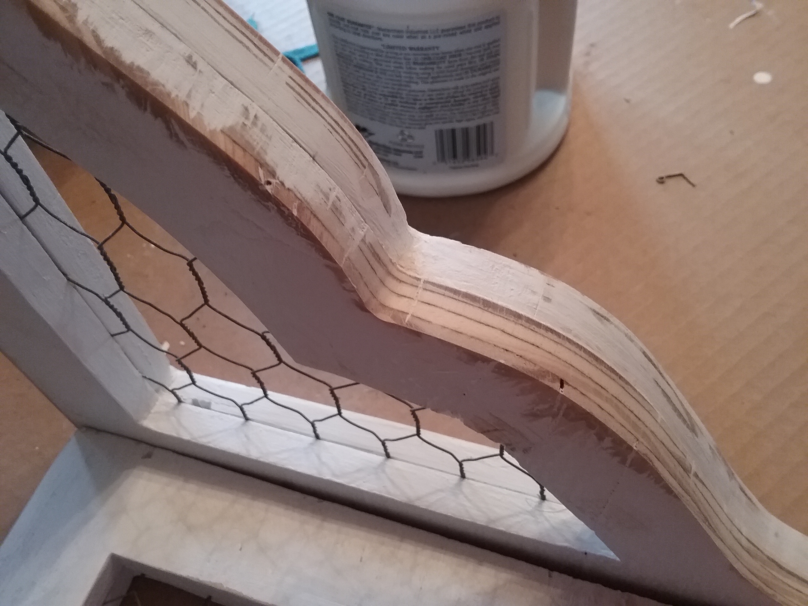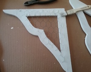 I came up with a new bracket idea to take to the market, and also offer in varied sizes and designs, in my shop “out behind the house” this summer. Chicken wire inserts were added to give them just the right touch for some fun vintage farmstyle/country decorating. They take a little time, but I think they are worth the effort.