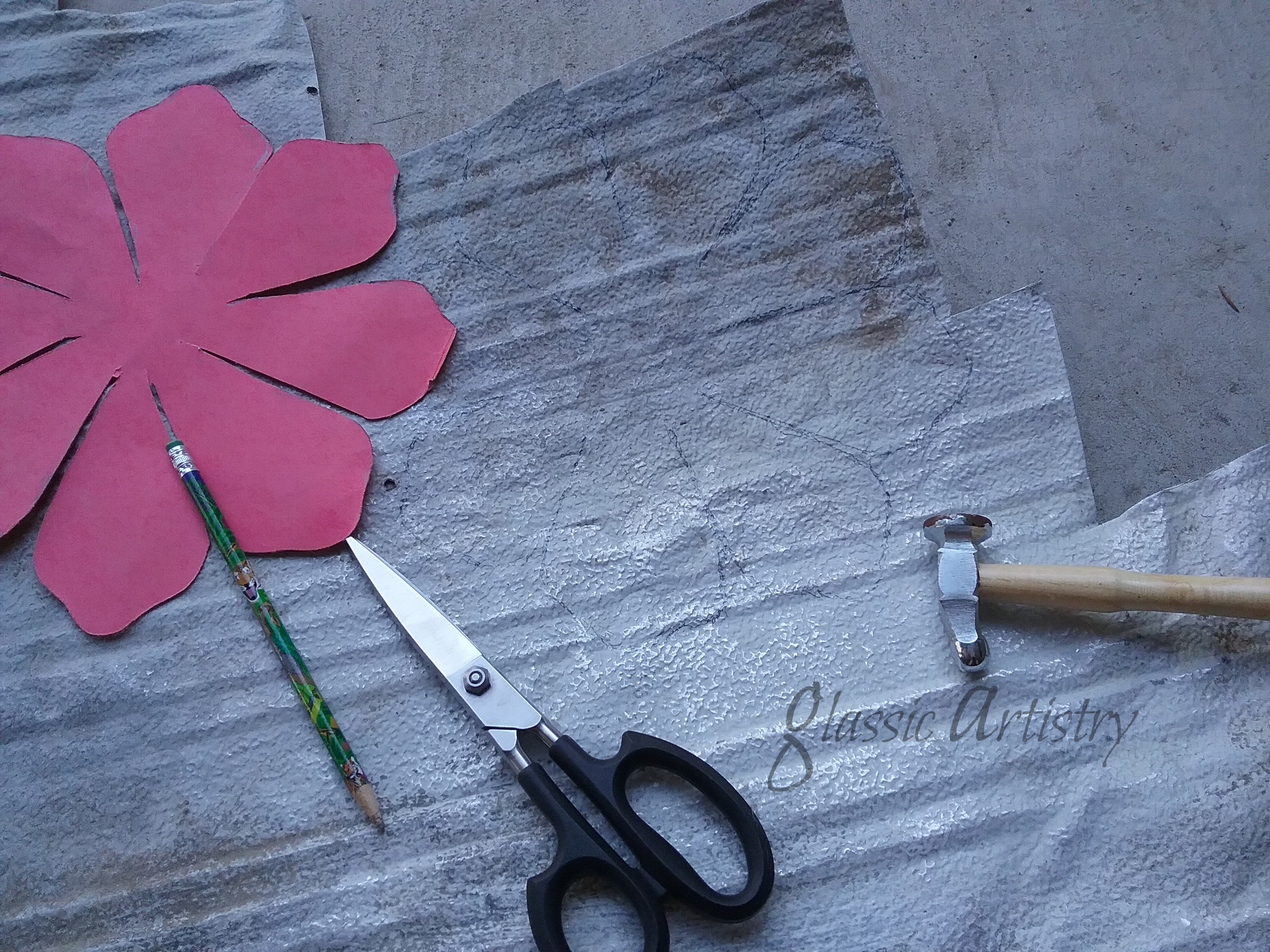 The plan – cut two new flowers from scrap aluminum, using the yellow flower and its leaves as a pattern, then give each a rusty flower center to pull them together.