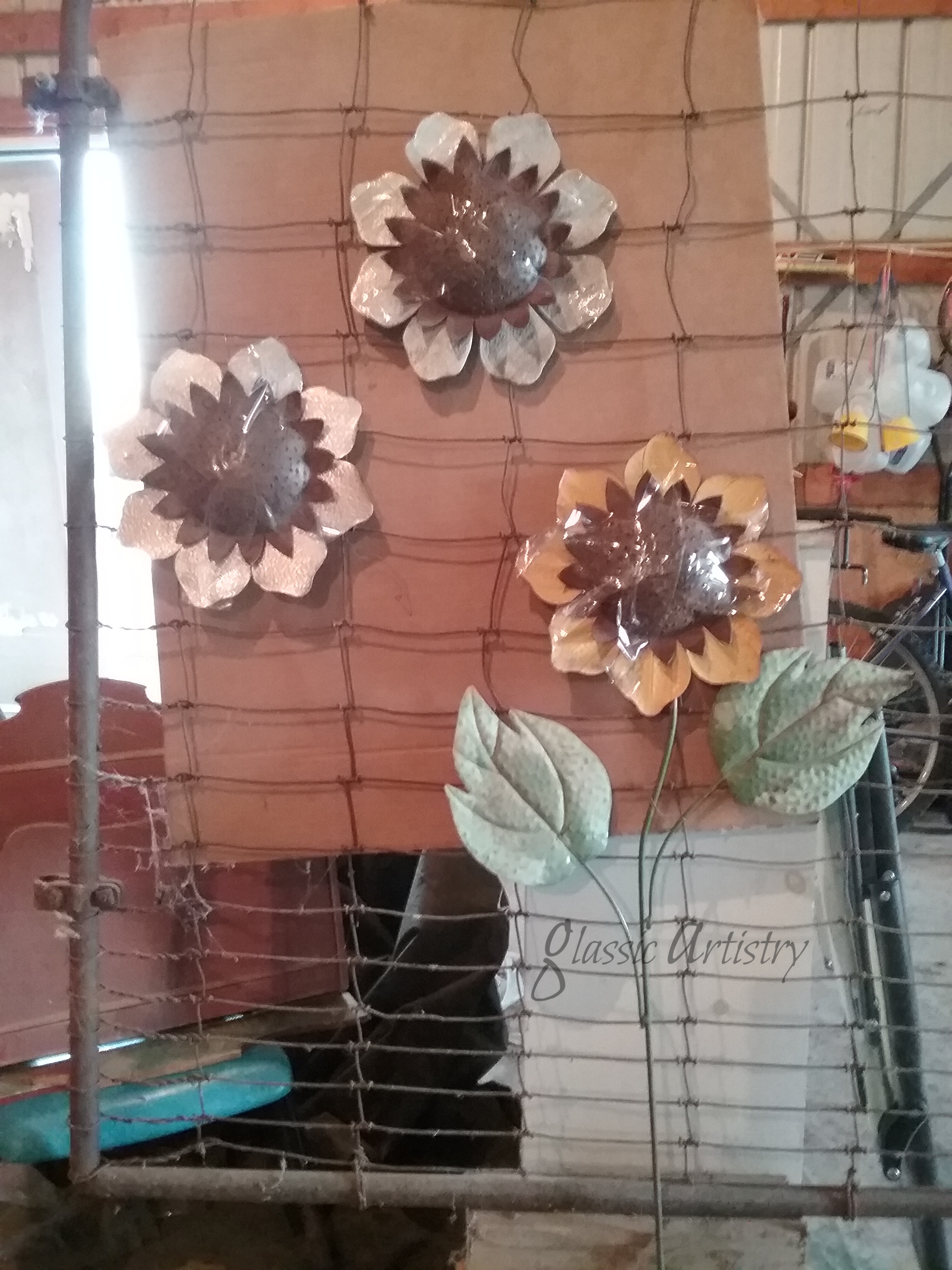 The flowers were wired to the gate in several places along the main stem and behind the flower.  Because they were glued on, I avoided putting any pressure on the leaf stems.   I painted a little green paint over wires that were showing.  A small amount of white paint was lightly sponged on the rusty centers. The thin aluminum petals and leaves were curved and shaped to add dimension.