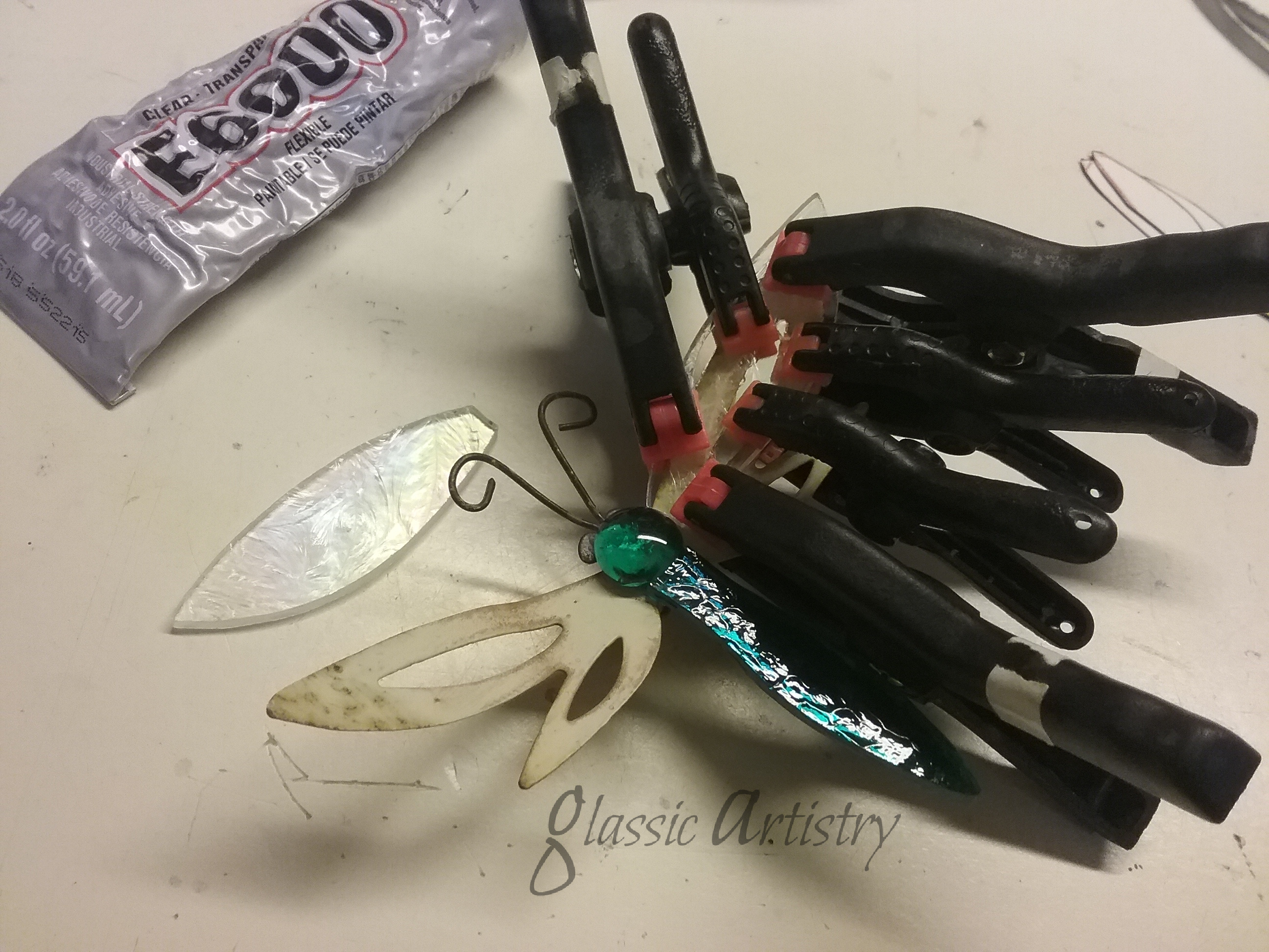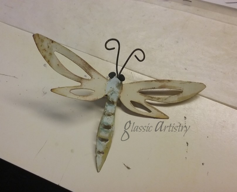 The little dragon fly from the yellow flower was wired on after it was brightened up with some glass wings and a nugget.  I don’t know what I’d do without my squeeze clamps.  🙂