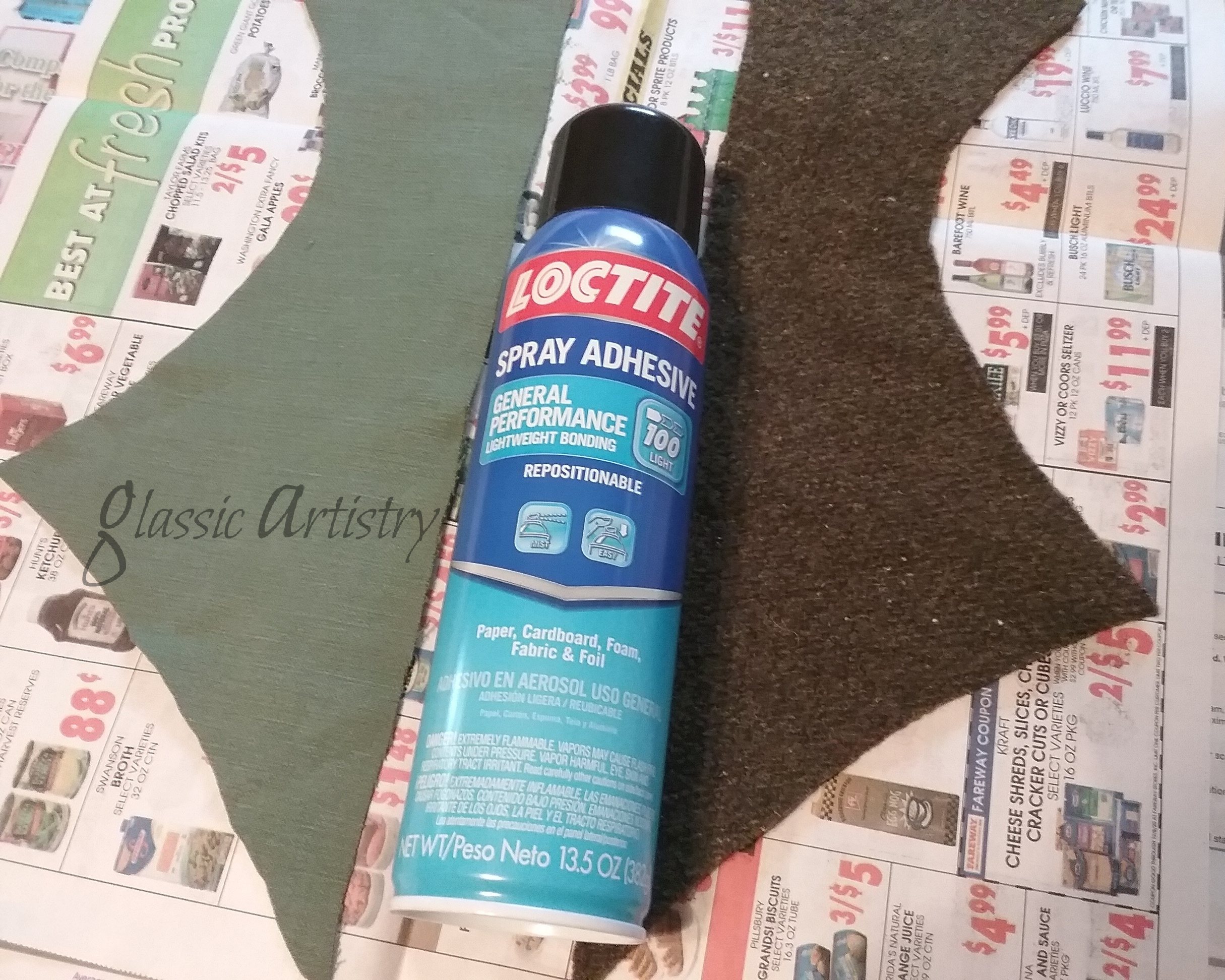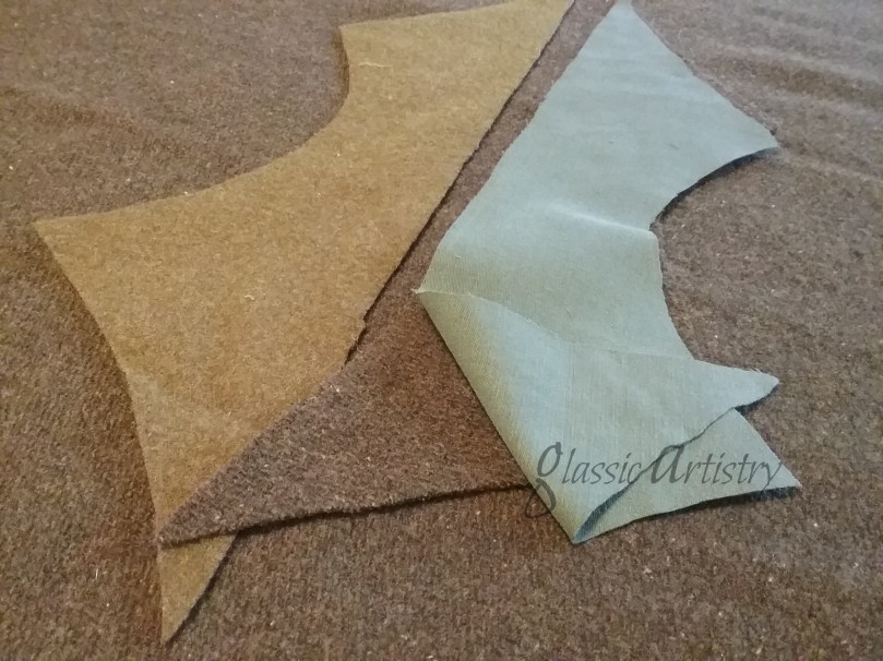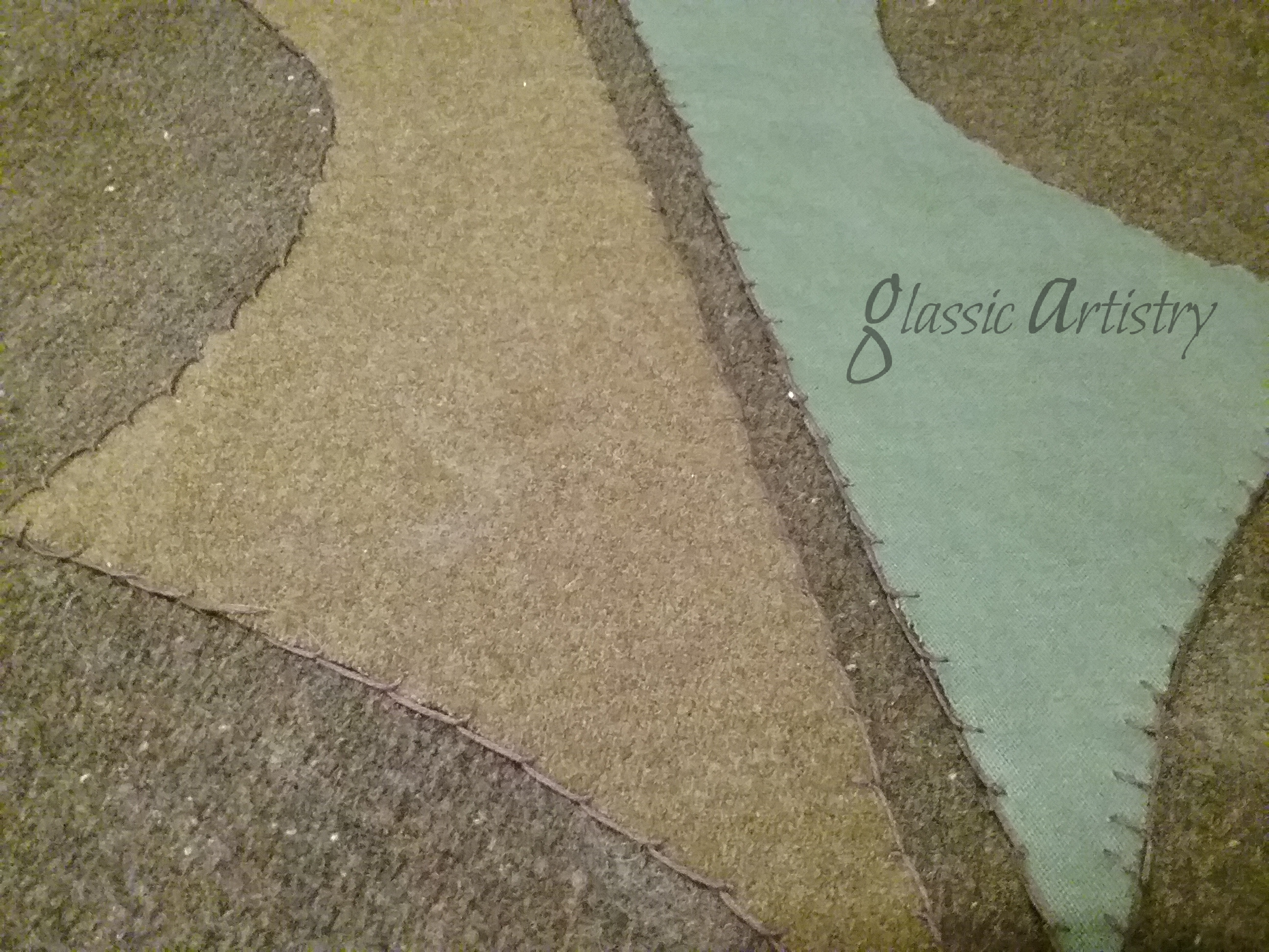 I didn’t have interfacing for the green cotton material.  With plenty of the dark wool left, I cut eight pieces of that and adhered it to the back of the green cotton with a spray adhesive. I trimmed a few edges where they didn’t match neatly.