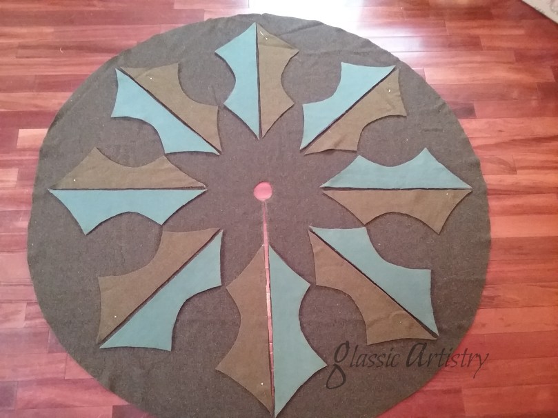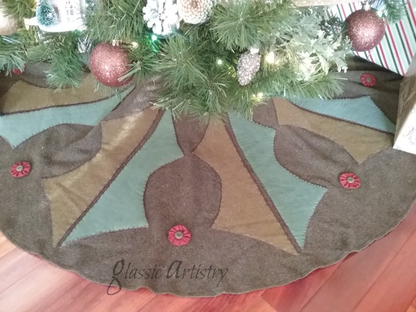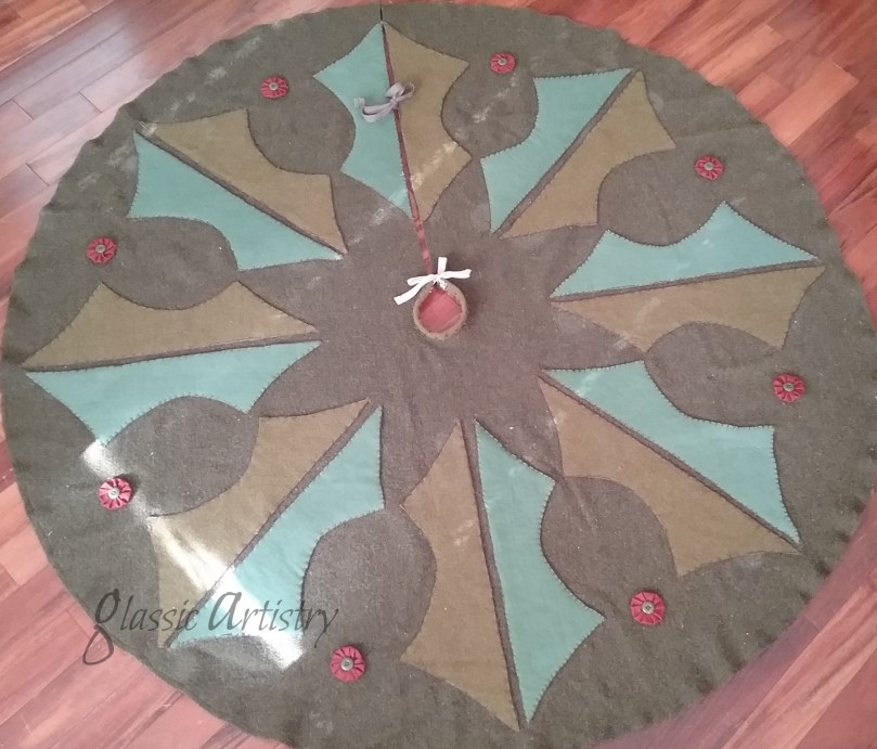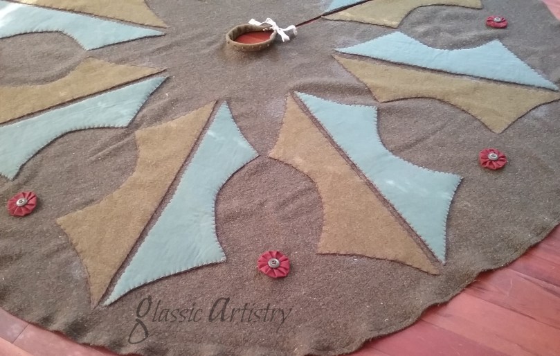 There’s been an old, soft, wool army blanket floating around here since forever.  It’s actually two pieces of wool blankets sewn together.  It’s been used under our tree many times and has been packed away with the Christmas stuff for the last 30+ years.  One Christmas, when my kids were young, I said I was going to make a real tree skirt out of it someday, and it’s kind of been a running joke every year when we pull it out. Well, this is the year, I did it!