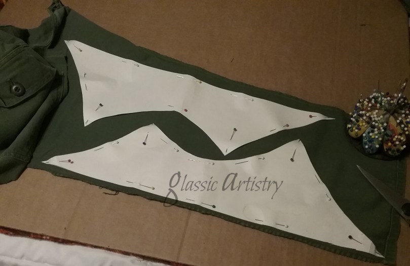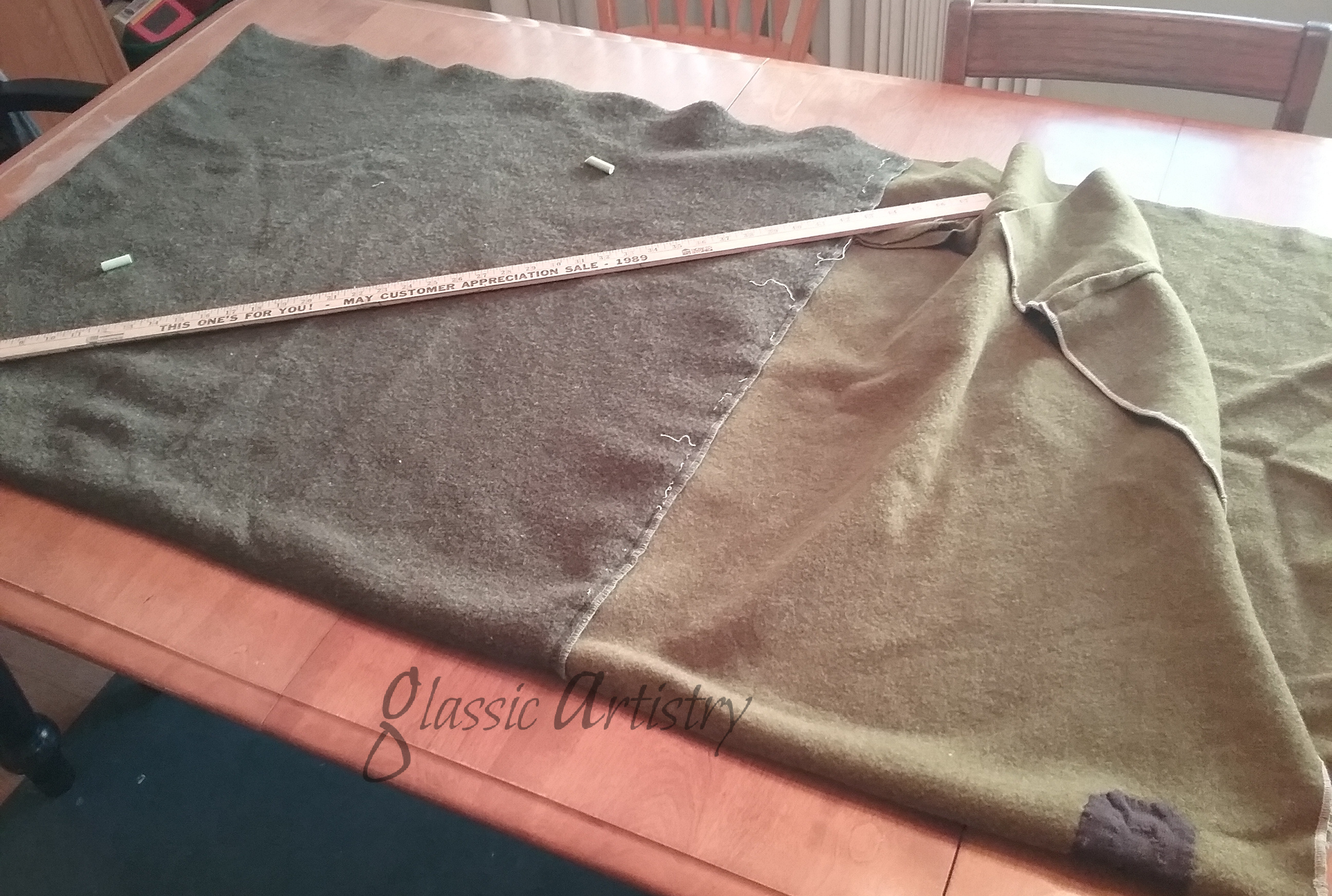 After two days of trying to find something to use, it finally dawned on me that I had the perfect thing all along, a faded pair of green army fatigues.  As a saver of buttons, I always have a bag of old clothes waiting to have their buttons removed before they’re tossed, and that’s where I found them.  The legs alone offered enough material and I could use the buttons too.