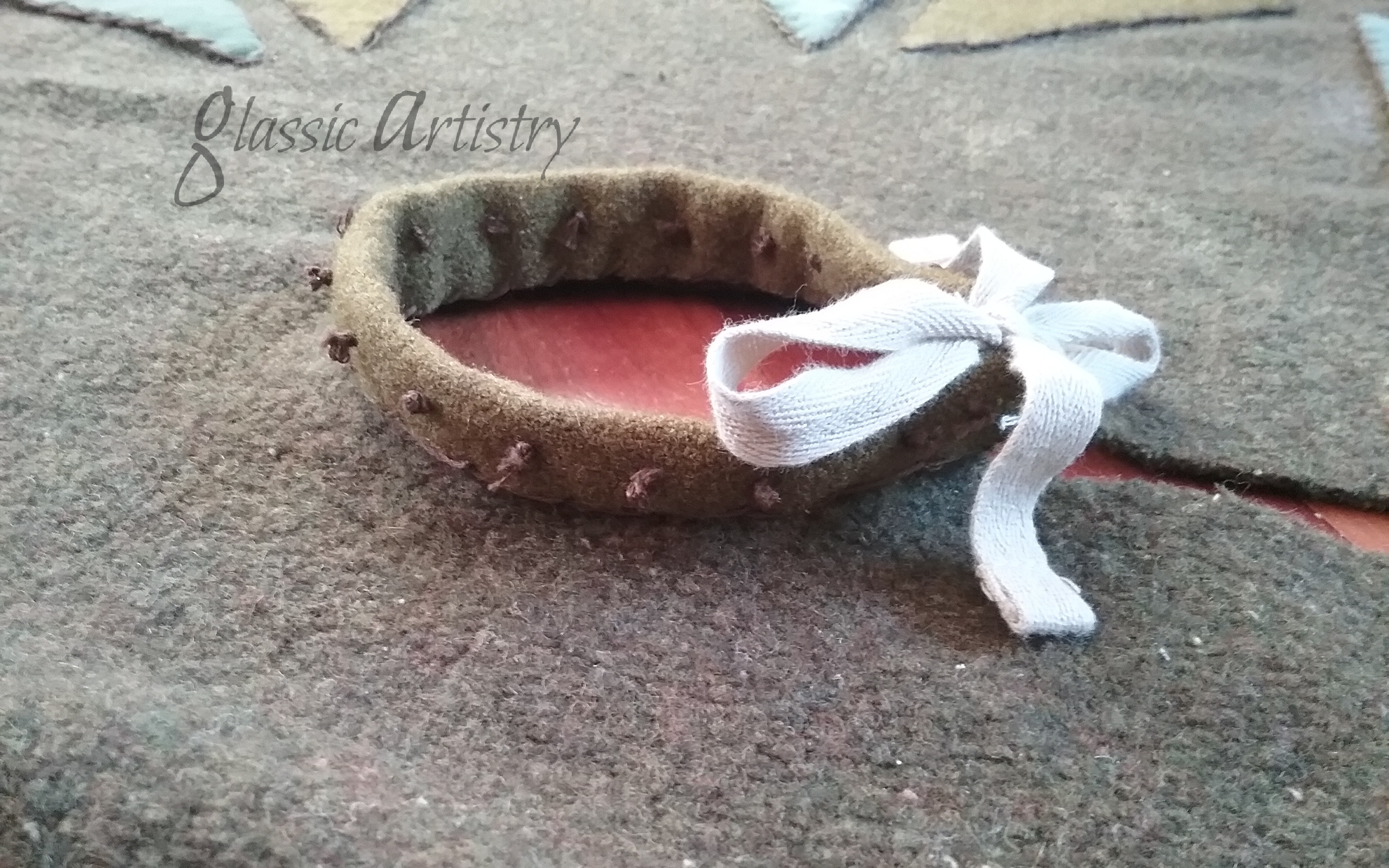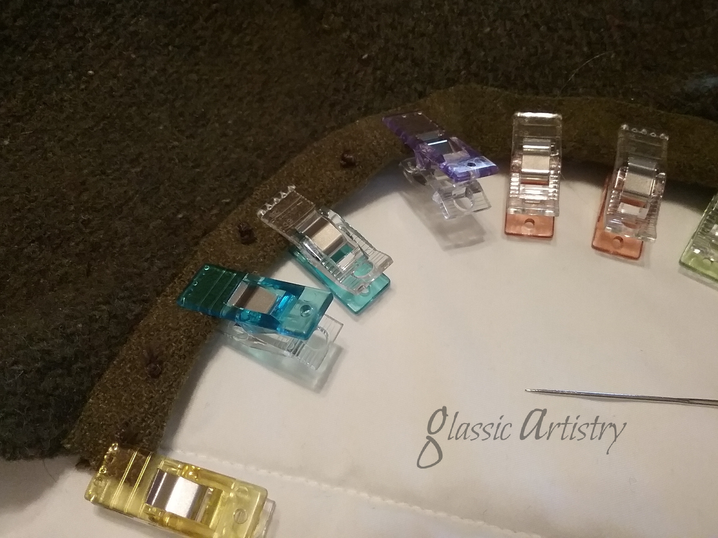 A zig-zag stitch was run around the outer edge of the skirt, and a strip of wool cut to fold over the raw edge of the small inner circle.  My daughter, she’s a quilter, peeked in on me as I was pinning the wool strip into place, and offered me her binding clips to use.  They’re the neatest little things.  I stitched some knots to attach the strip, then ran a blanket stitch along the edge of it on both sides.