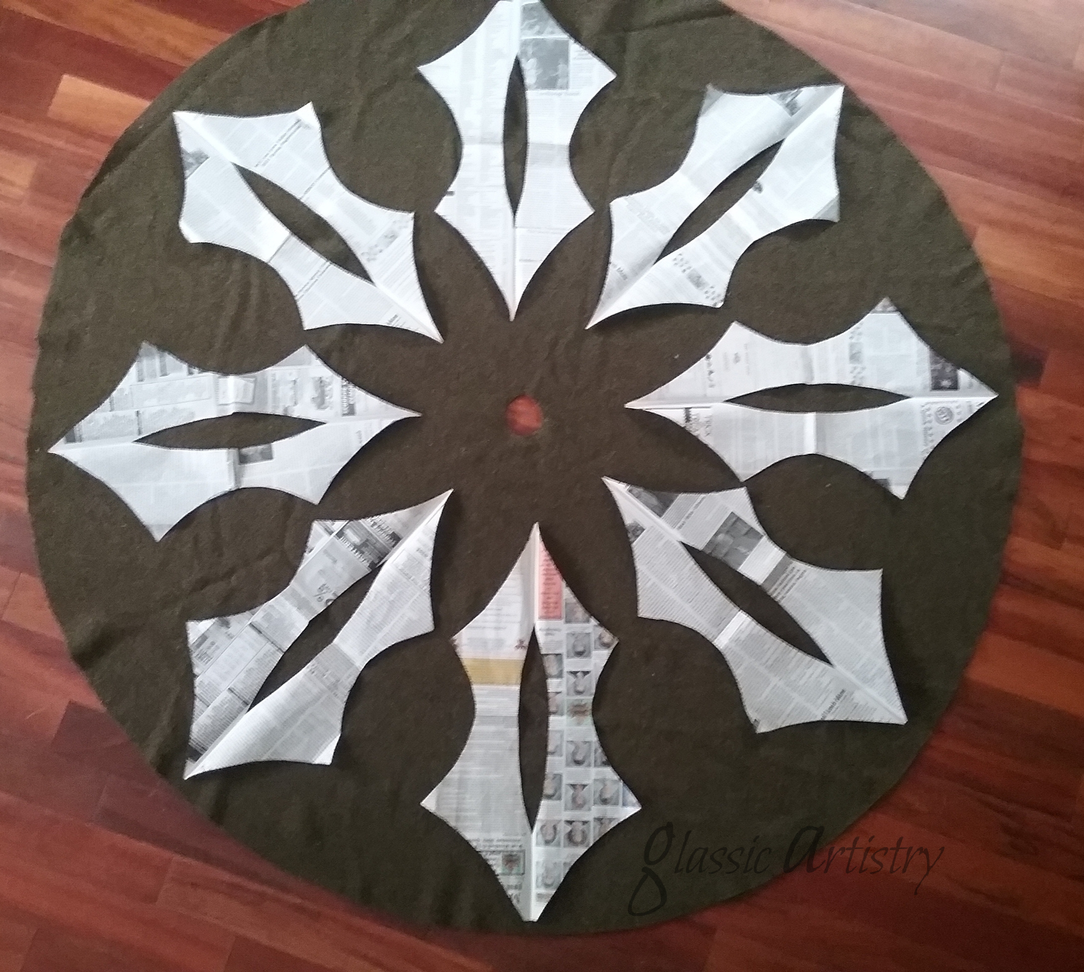 My first idea was to cut small holly pieces from the leftover end of the blanket and stitch them along the outer edge of the circle. But then, with such a big circle, I thought a larger pattern would look much better.