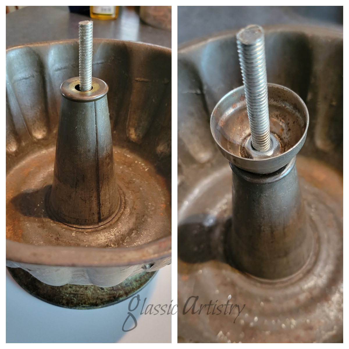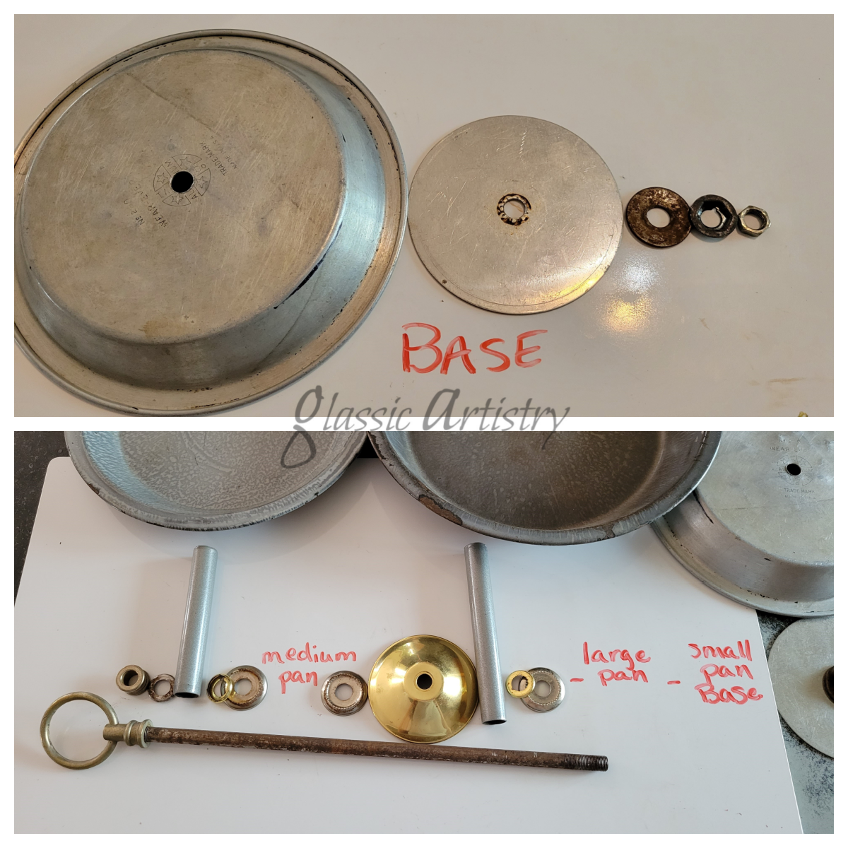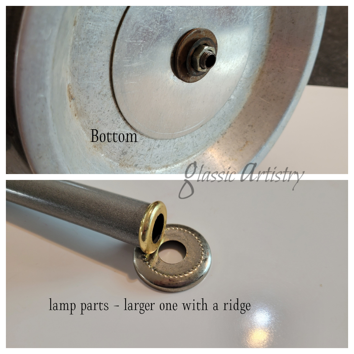A clear glass lamp piece was used to top off another one. Regretfully, I haven’t any pictures for this one and can’t remember what was used to fill the cavity of the pan underneath. I’m thinking maybe an upturned zinc canning lid with a hole drilled in it, but I’m not sure.