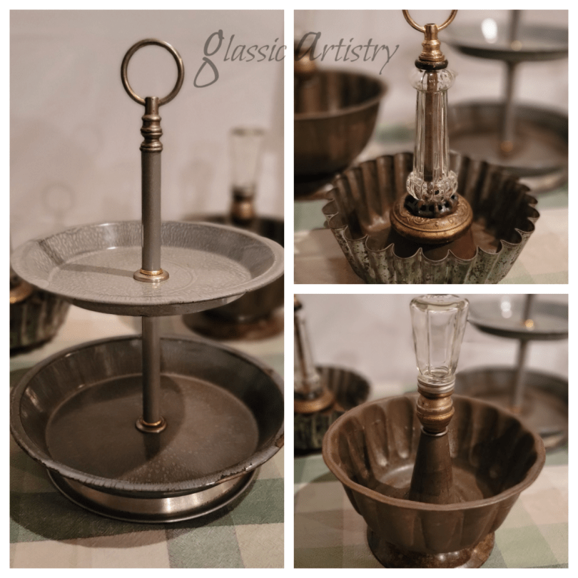 Last April, I was making what I called display trays. https://glassictouch.com/2022/04/18/tiered-tray-diy-repurposed-enamelware/ and https://glassictouch.com/2022/04/27/vintage-style-display-tray-diy/ . They were a ton of fun to make so I made some more. To keep things short and simple I’m going to post a picture of the completed item and the layout of the pieces (if I have it) in the order they were used so you can see how it went together. My hope is just to inspire since the use of salvaged and found materials would make exact duplication impossible.