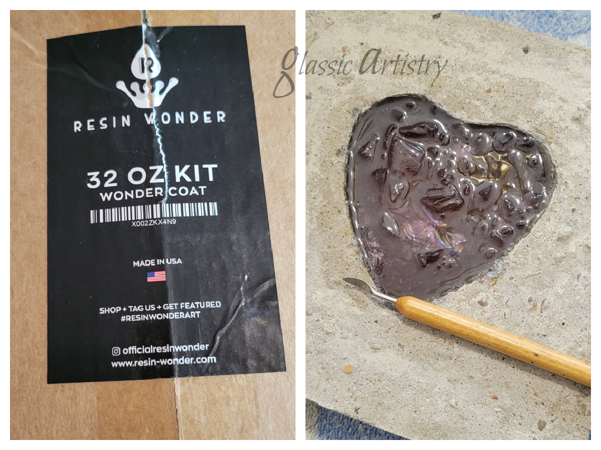 An interior/exterior resin (Amazon) was poured over the glass. This was the first time I’d used resin, but it was so simple and took very little. The resin had to set for 24 hours. The concrete absorbed the resin in a few places around the edge of the heart, but it scraped away easily, before sealing the concrete with grout sealer.
