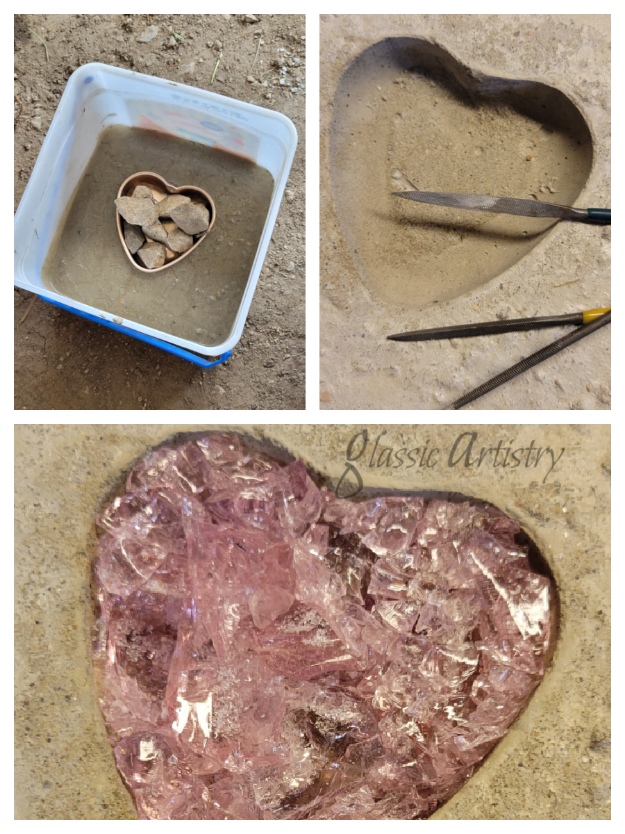 There was just enough concrete to pour about 1½” depth into the bucket. A small metal ring had been removed from the heart mold years ago so it was able to be pushed into the wet concrete all the way to the rim and weighed down. I left it to dry for 24 hours before unmolding, then let it dry another 12 hours. A few rough edges were filed down before filling the heart cavity with pink glass shards.
