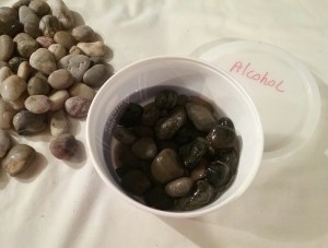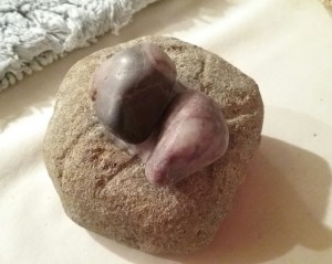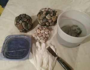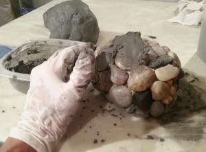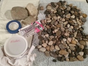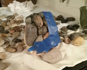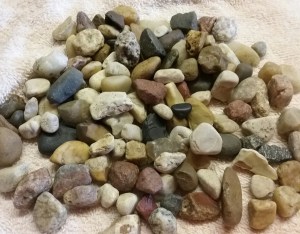 I still have a thing for rocks, so I scooped up a bucket of them and gave them a quick wash and rinse. When they were dry, I started layering and gluing them into the heart shape with E6000, trying to keep them level with the heart edge. Sometimes tape was used to hold a glued rock in place to dry and then I filled in under it. Let glue dry a couple days.