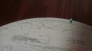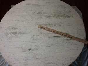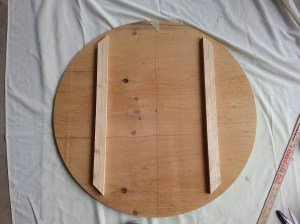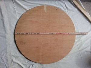 Drill a small hole on the 1″ mark of a thin wooden yard stick, just large enough to fit over the head of the nail, no bigger. With the yardstick on the nail, hold a pencil firmly on the edge of the yardstick at the 16″ mark. Walk slowly backward around the work surface, marking the plywood, until you complete the circle.