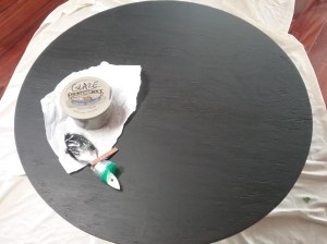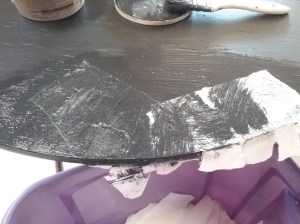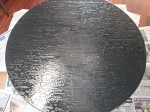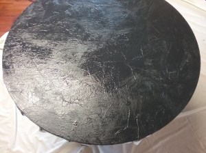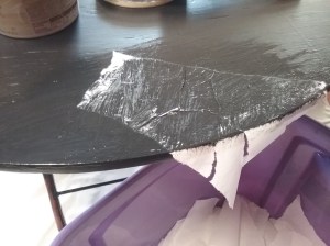 With a clean brush apply a coat of crackle, in broad, even strokes, horizontally over the sanded black glaze layer. Do not over brush.  The crackle glue will separate and remain shiny. Let crackle dry approximately 45 min to an 1 hour, until it is still a tiny bit tacky. Test it with your finger.